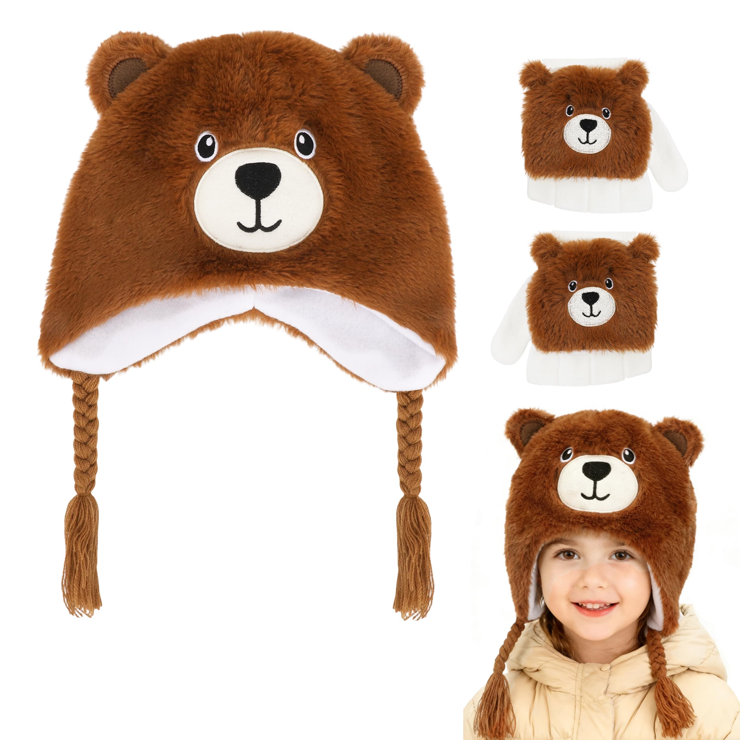 Kids Hat and Gloves Set, Bear Gloves, Fluffy 3-8 (Little Kid), Brown