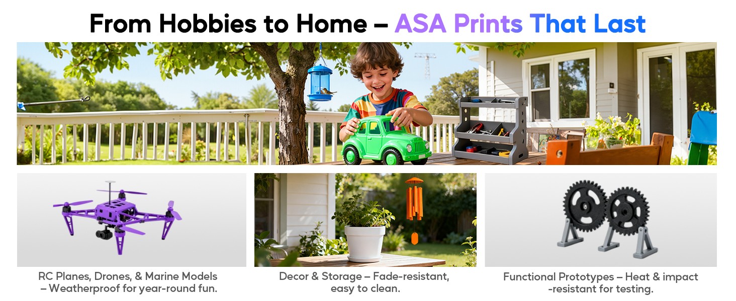 ASA Filament: 【Hervorragende Wetter- und UV-Beständigkeit】Dieses ASA-Filament wurde für Langlebigkeit im Außenbereich entwickelt und bietet ausgezeichneten UV-Schutz und Wetterbeständigkeit, wodurch Spannungsrisse durch Umwelteinflüsse minimiert werden. Perfekt für langlebige Außenanwendungen wie RC-Fahrzeugteile, Automobilzubehör und Außenbeschilderungen – behält seine strukturelle Integrität bei Sonneneinstrahlung, Regen und rauen Klimabedingungen. Kombiniert die einfache Verarbeitbarkeit von ABS mit verbesserter Leistung im Außenbereich. |