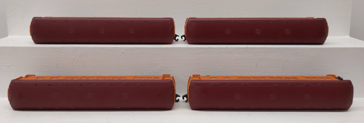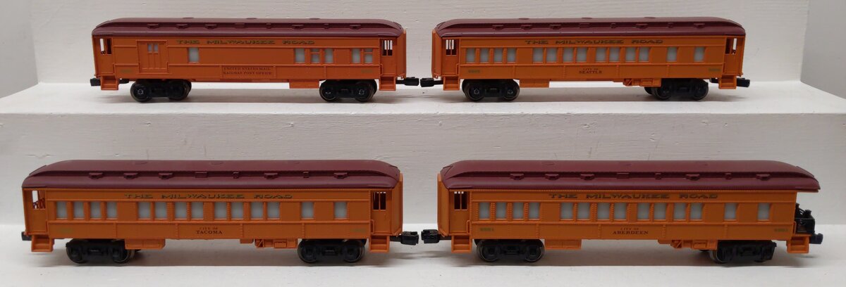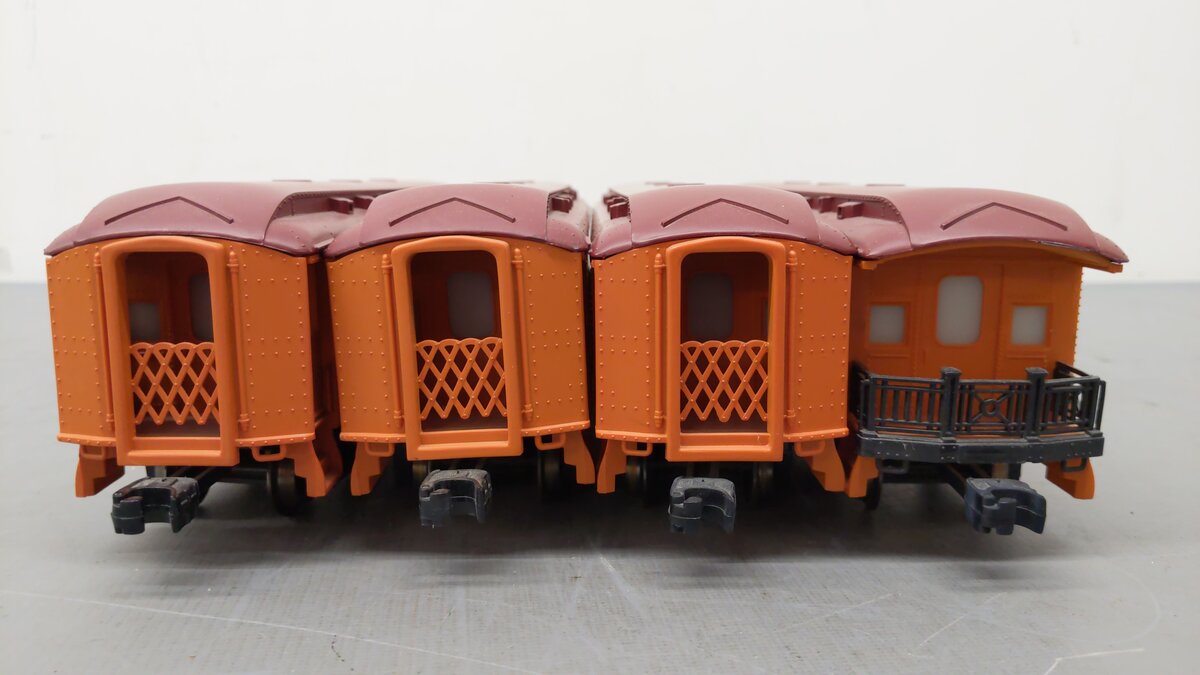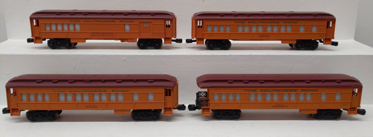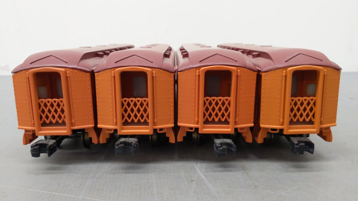 Here are some Lionel O Gauge Assorted Passenger Cars: 9500, 9511, 9502, 9506 [4]. Features include plastic construction and trucks, metal wheels and axles, knuckle couplers, and rolling pickups.
