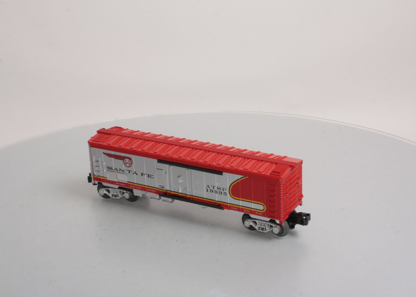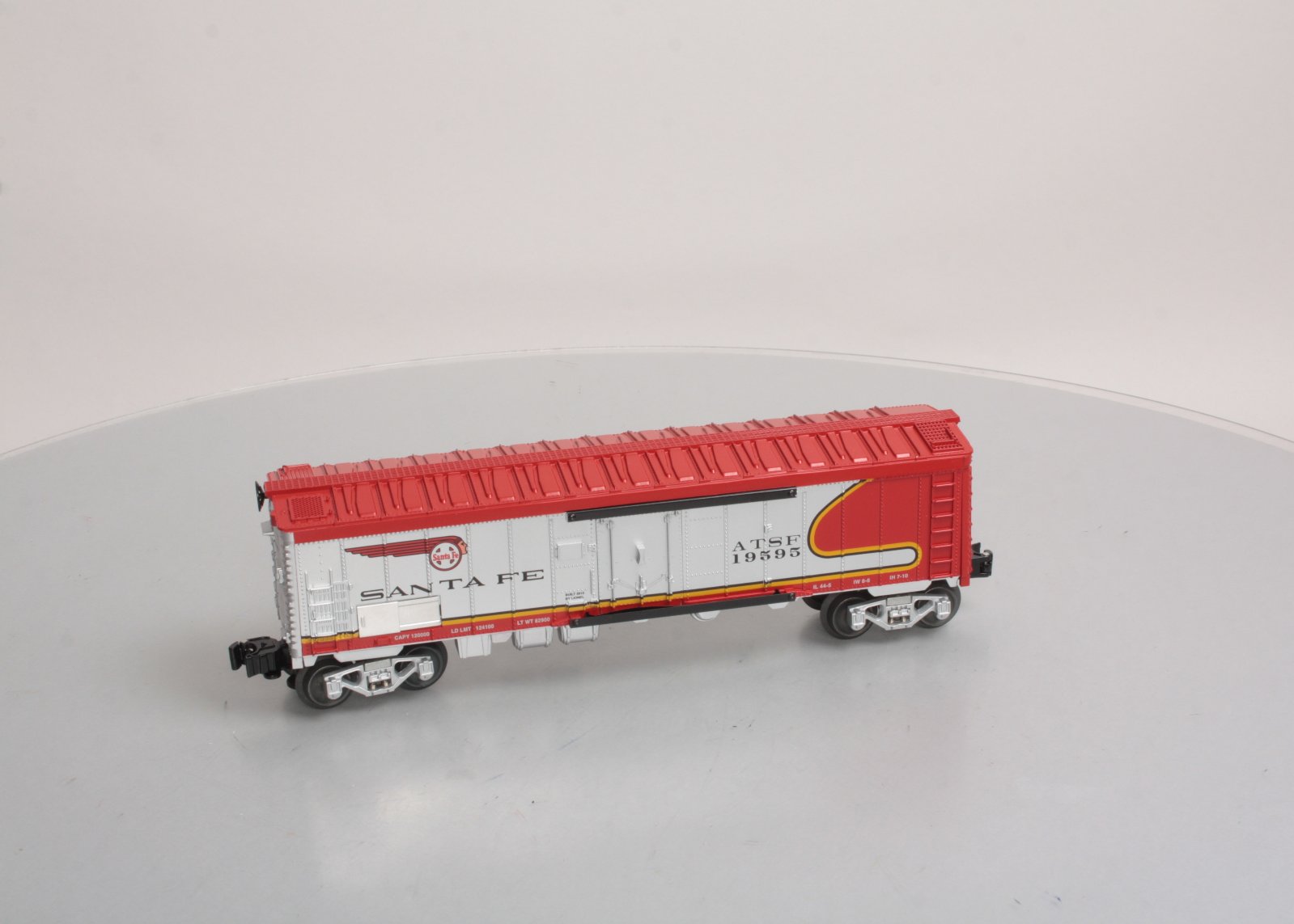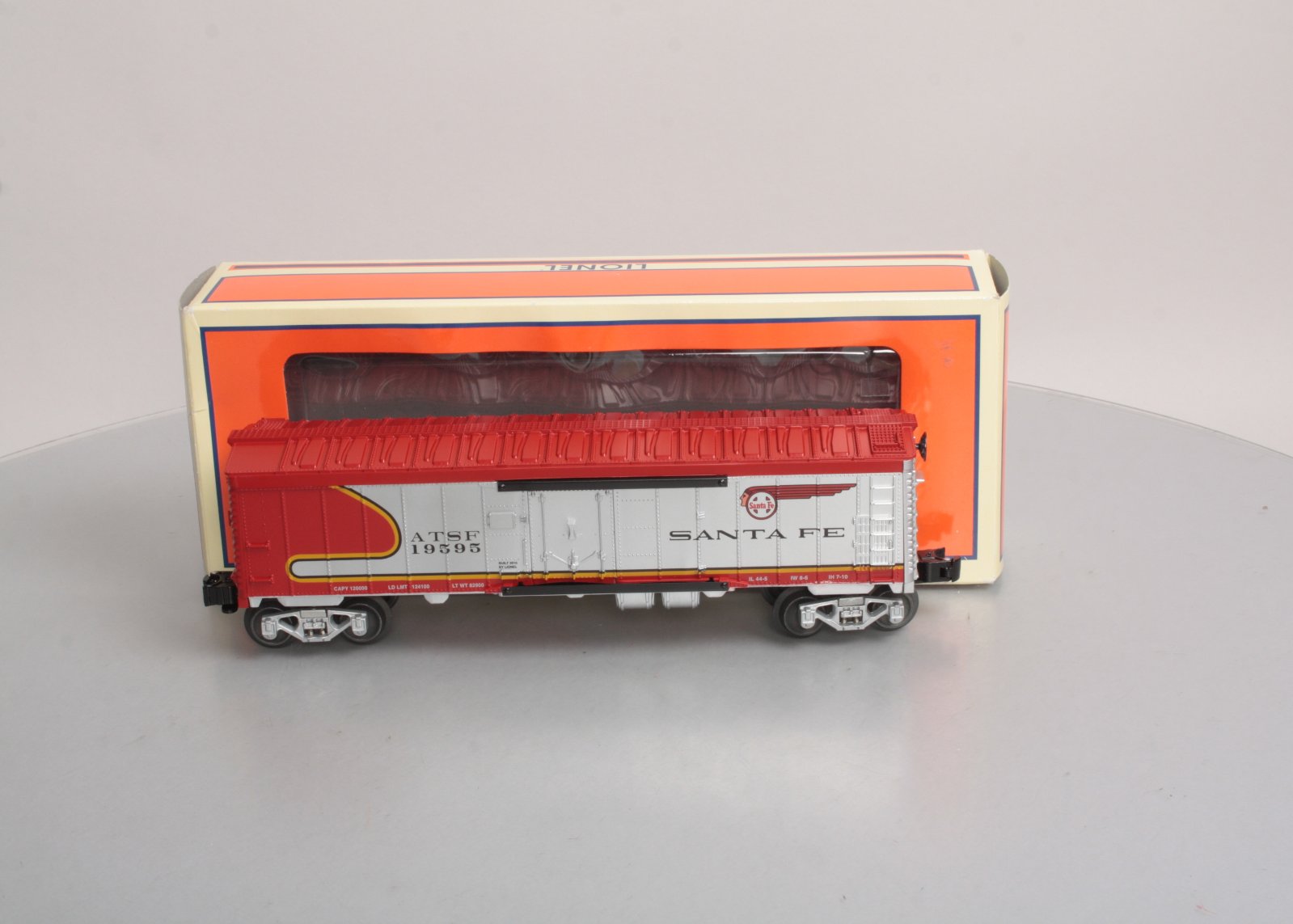 Here is a Lionel 6-19595 O Gauge ATSF Warbonnet Reefer Car. Includes Die-Cast Metal Spring-Action Trucks, Opening Doors, Sliding Metal reveals Control Panel, O Gauge, Length 11 ¼ inches.