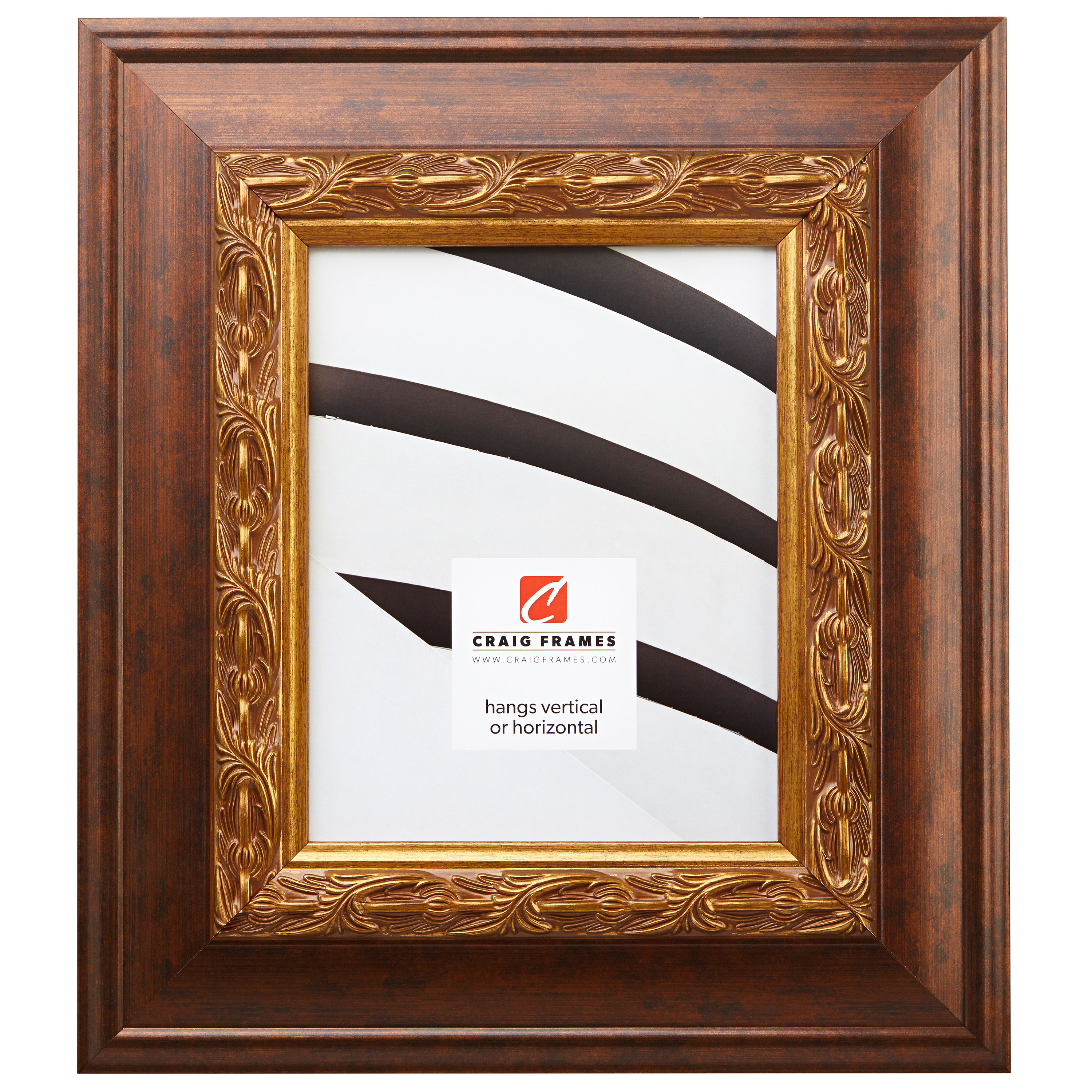 The ornate leaf detail and high quality wrap of this 9146 solid wood core frame showcases rich gold coloring with varied undertones, a visible brushed appearance and a wide ornate finish. The antique gold and darker undertones combined with the look of the ornate gold detail gives the frame a feel of aged beauty. The ornate design of this 3½″ wide moulding creates a noticeable frame style that adds plenty of presence, depth and character to any print.
