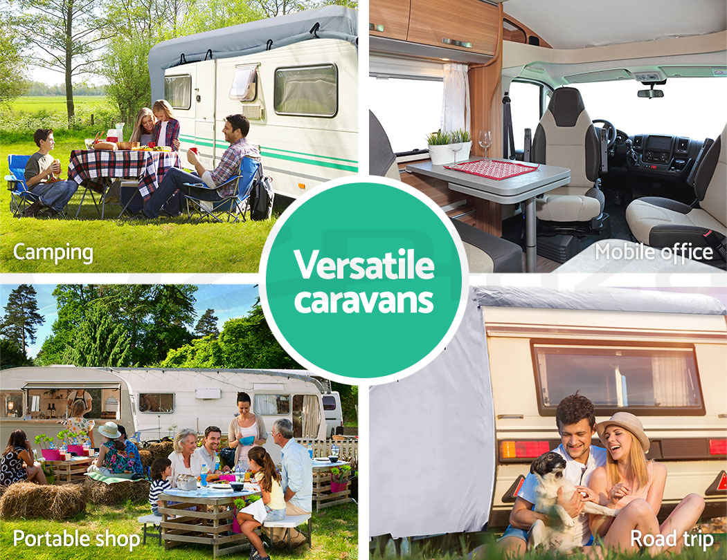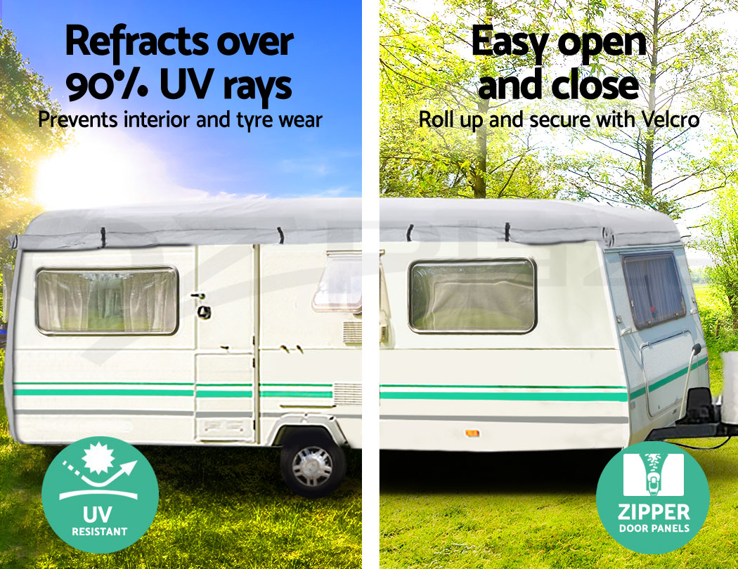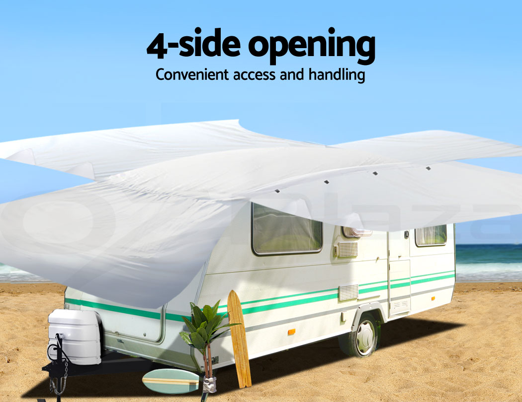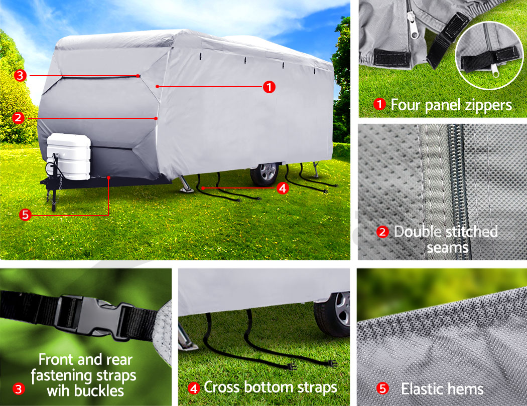 Putting on the cover is a breeze with the four sets of tie-down straps while the zipper door panels and openable four sides allow convenient access fast. The elastic hems, adjustable straps and buckles ensure a tight and secured fit. Not least, the tough interlocking seams make this caravan cover strong and sturdy in any weather condition.
