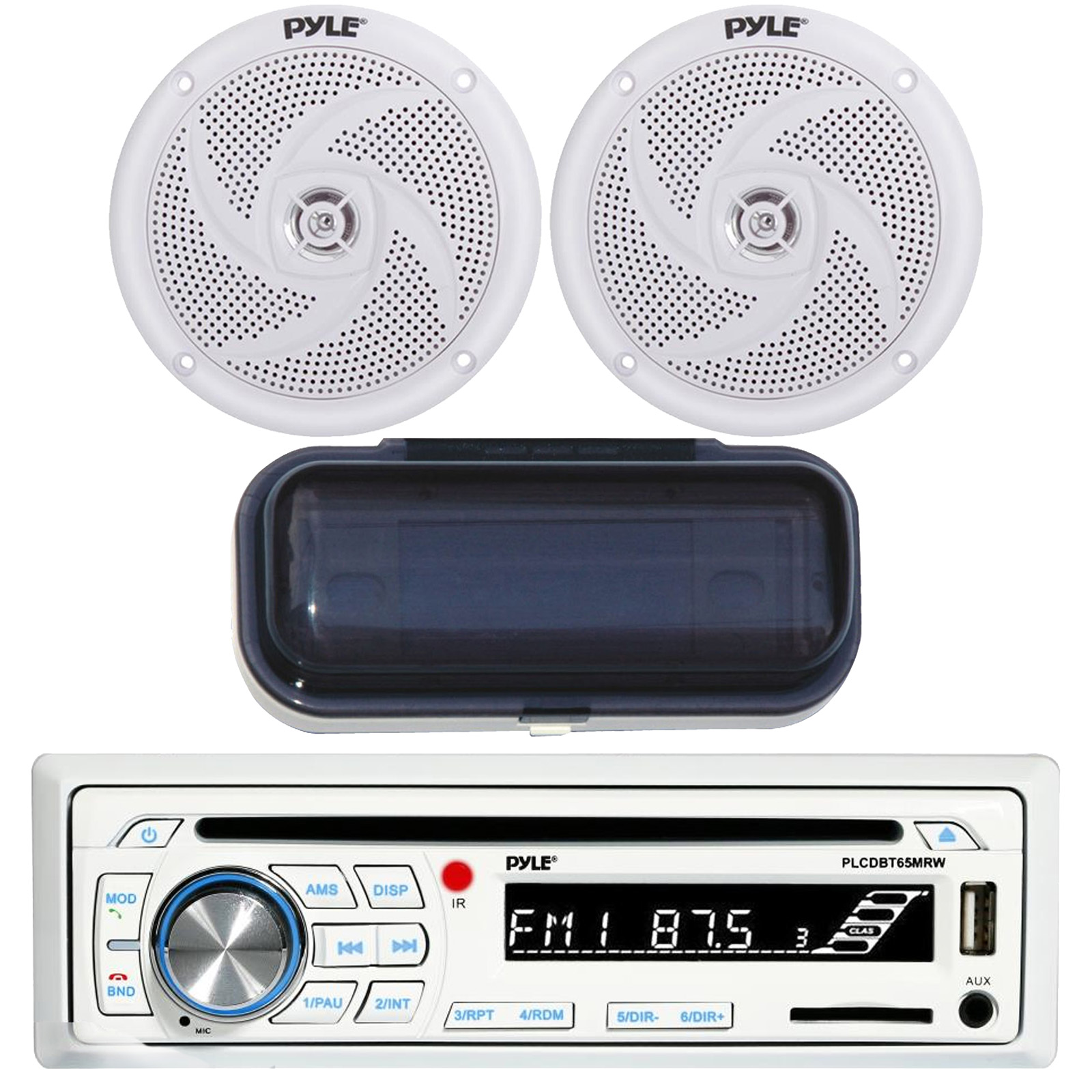 Package Includes: 1 X Kenwood KMR-D368BT Single DIN Bluetooth In-Dash CD/AM/FM/Digital Media Marine Stereo Receiver, 1 X Pair PLMR41W Pyle 4'' Dual Cone Waterproof White Stereo Speaker System, 1 X PLMRCB1 Pyle Water Resistant Radio Shield (Black)