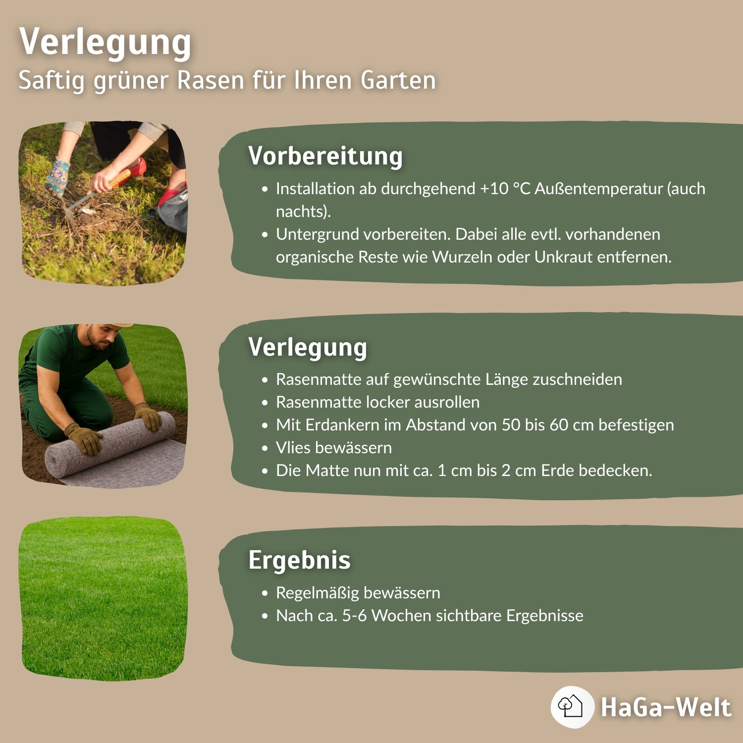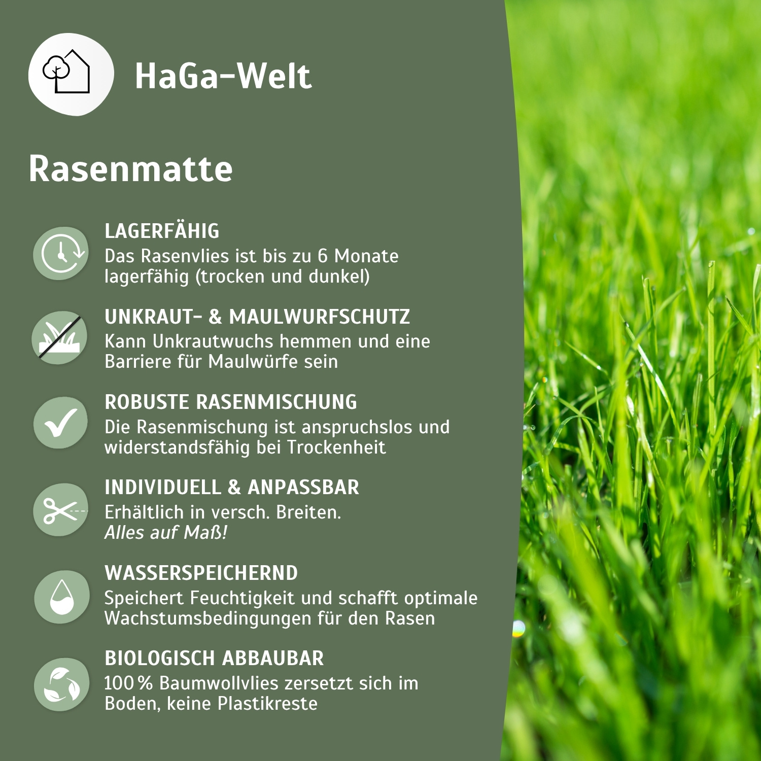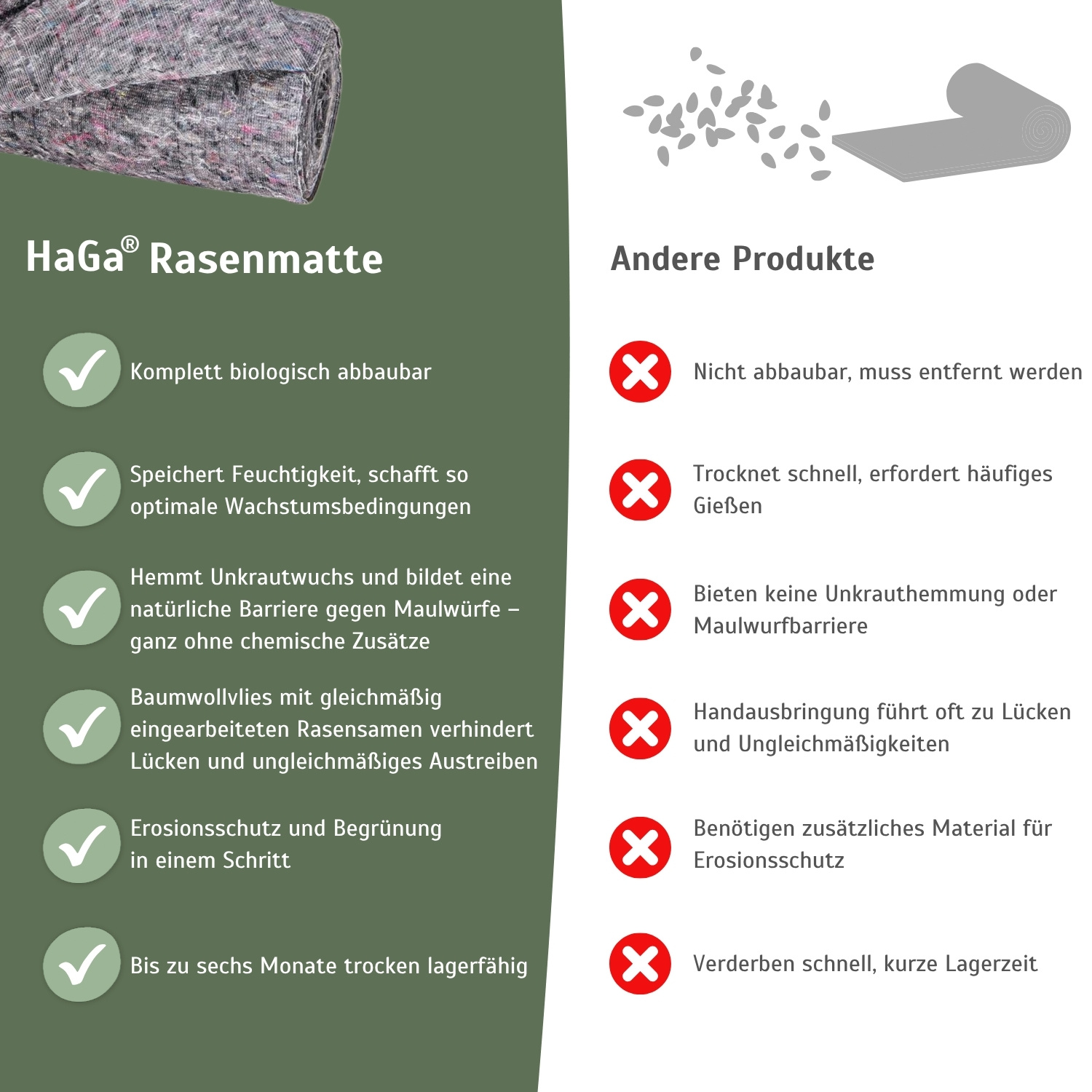 - Einfache Anwendung: Das Rasenvlies ist leicht zu verarbeiten und bis zu 6 Monate lagerfähig (trocken und dunkel).