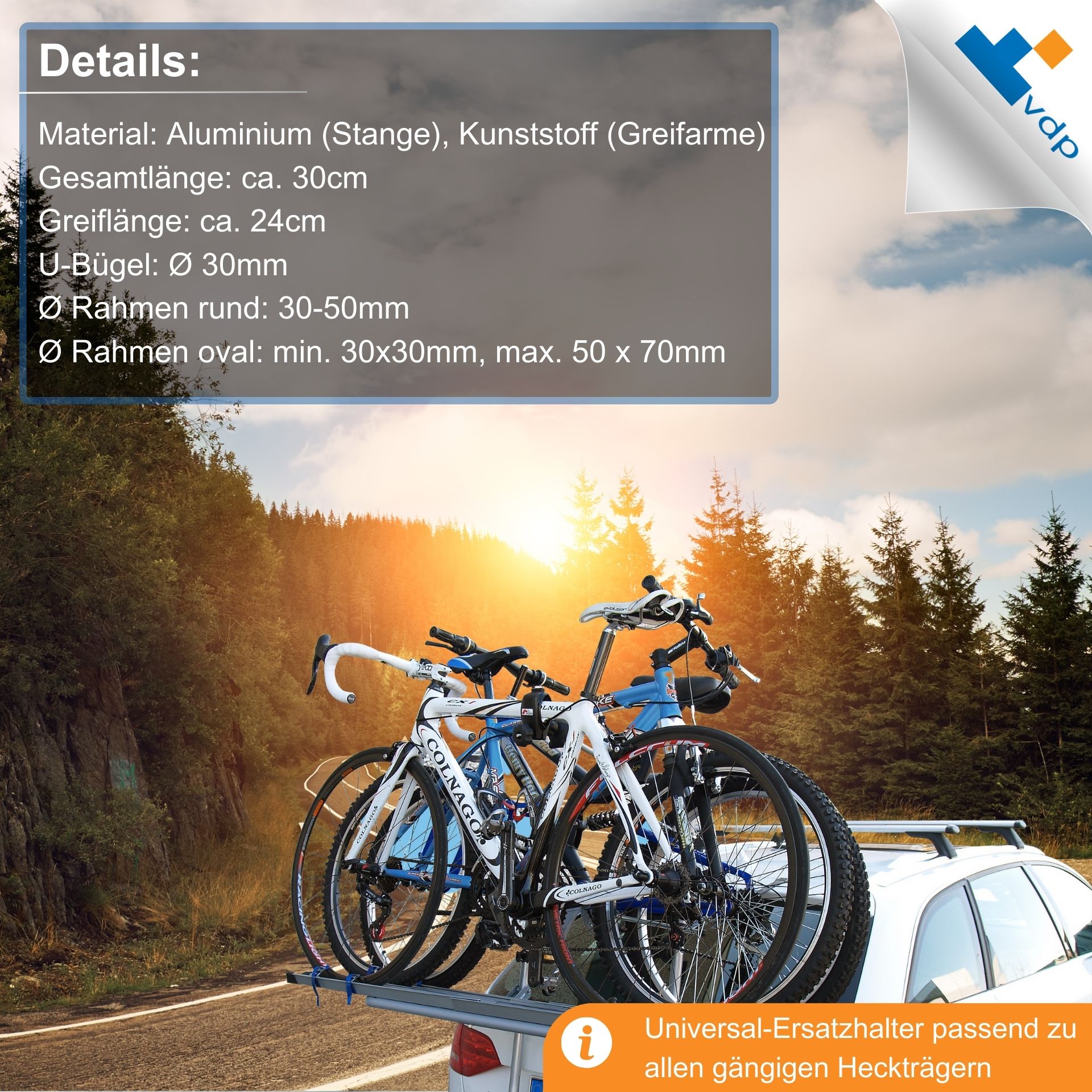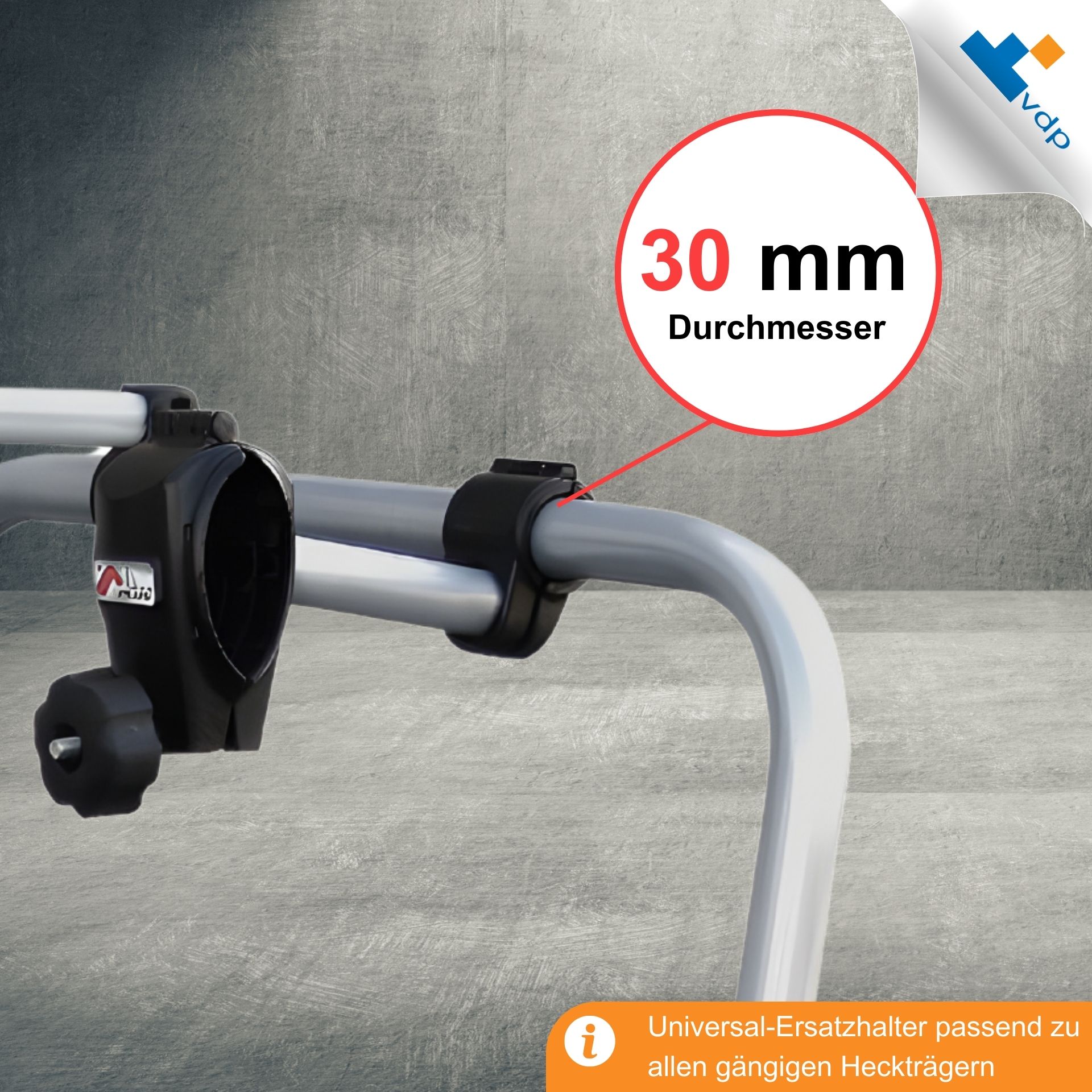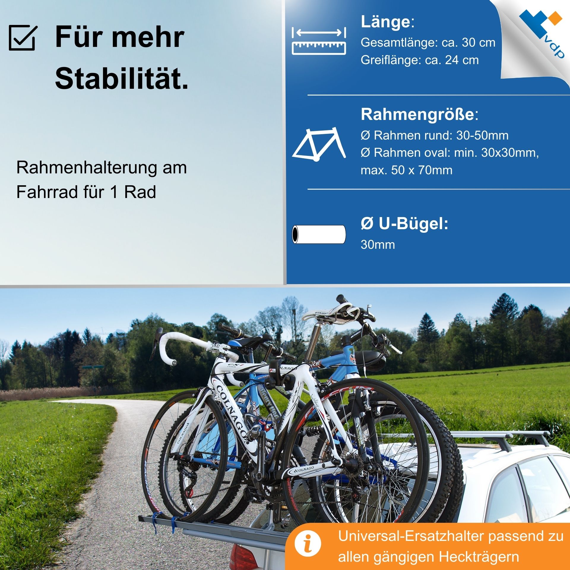 Universal-Ersatzhalter passend zu allen gängigen Heckträger, praktische Rahmenhalterung am Fahrrad einfach und schnell zu montieren. Passend für die meisten Fahrradrahmen mit einem Durchmesser von 30 bis 50 mm (rund) oder 30x30mm, max. 50 x 70mm (oval). Rahmenhalter für U-Bügelrohre mit einem Durchmesser von 3 cm.