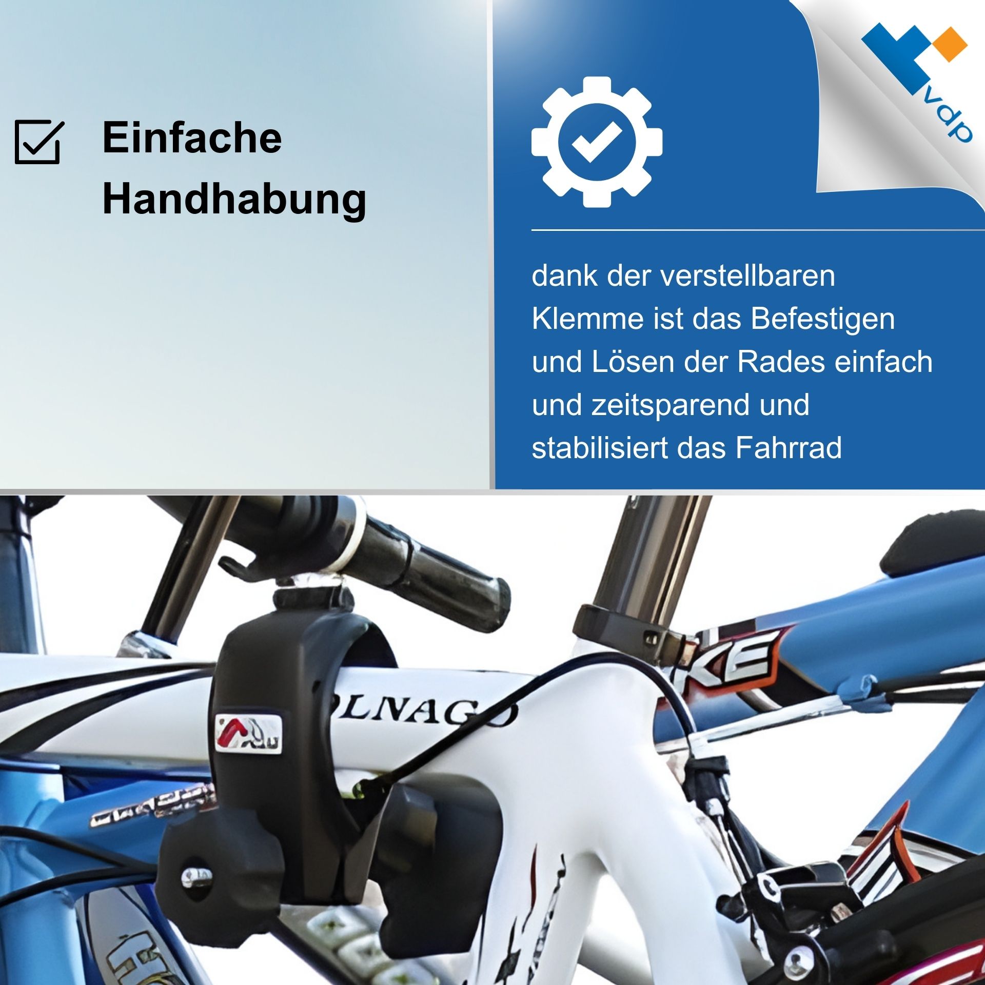 Dank der verstellbaren Klemme ist das Befestigen und Lösen der Rades einfach und zeitsparend und stabilisieren das Fahrrad, so dass das Gewicht gleichmäßig auf den Träger verteilt wird, Dies reduziert Belastungen auf das Auto und den Träger selbst.