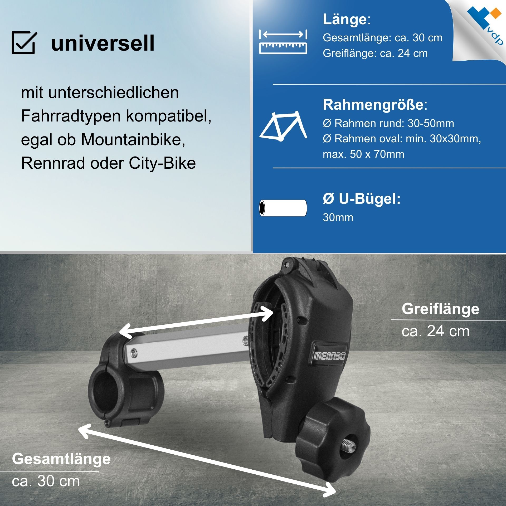 - technische Daten - Rahmenhalterung am Fahrrad für 1 Rad | Material: Aluminium (Stange), Kunststoff (Greifarme) | Gesamtlänge: 30cm | Greiflänge: 24cm | U-Bügel: Ø 30mm | Ø Rahmen rund: 30-50mm | Ø Rahmen oval: min. 30x30mm, max. 50 x 70mm
