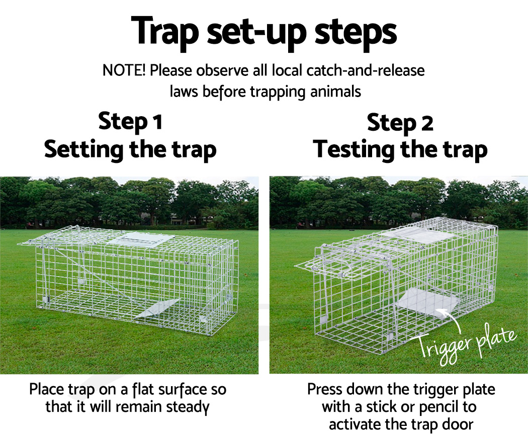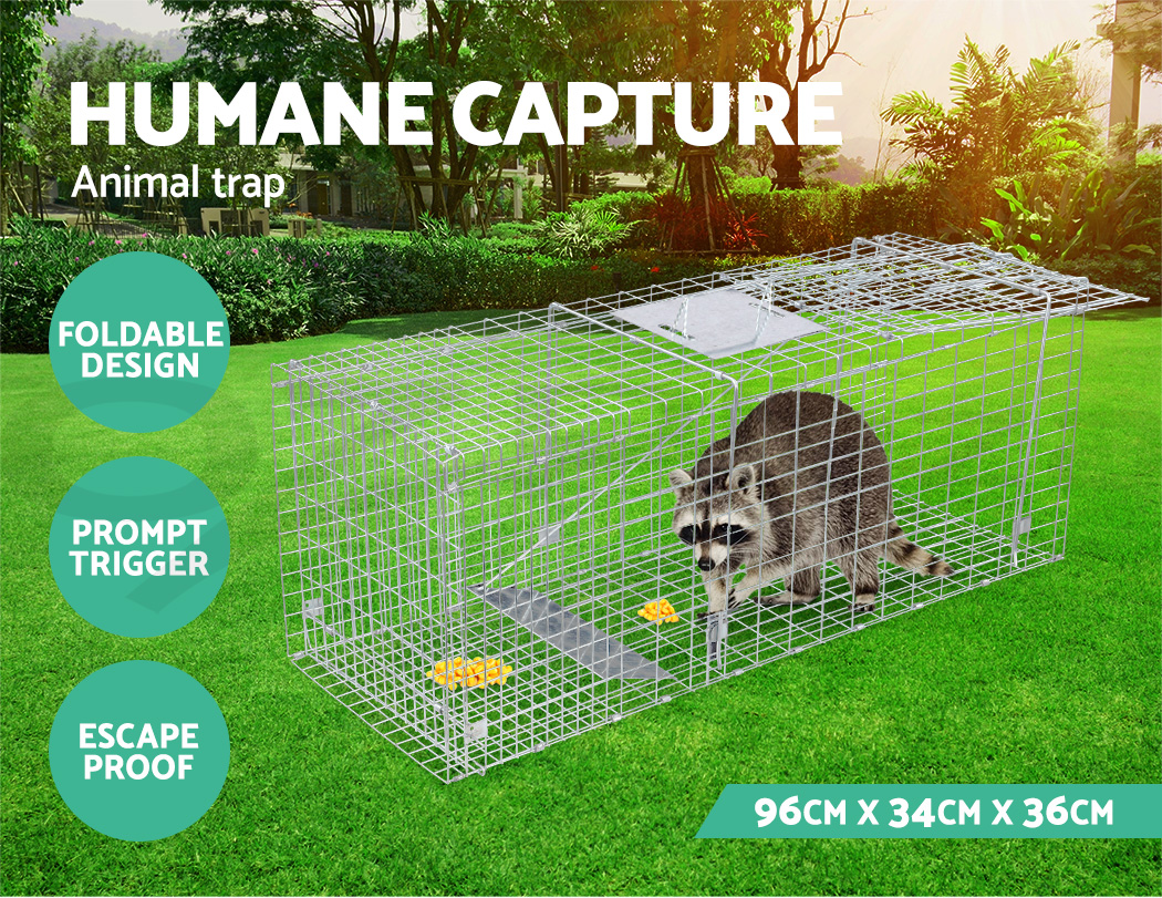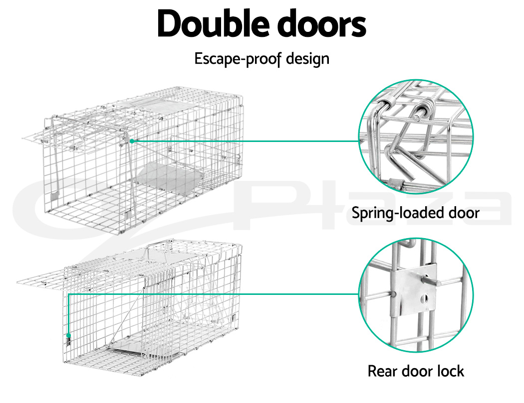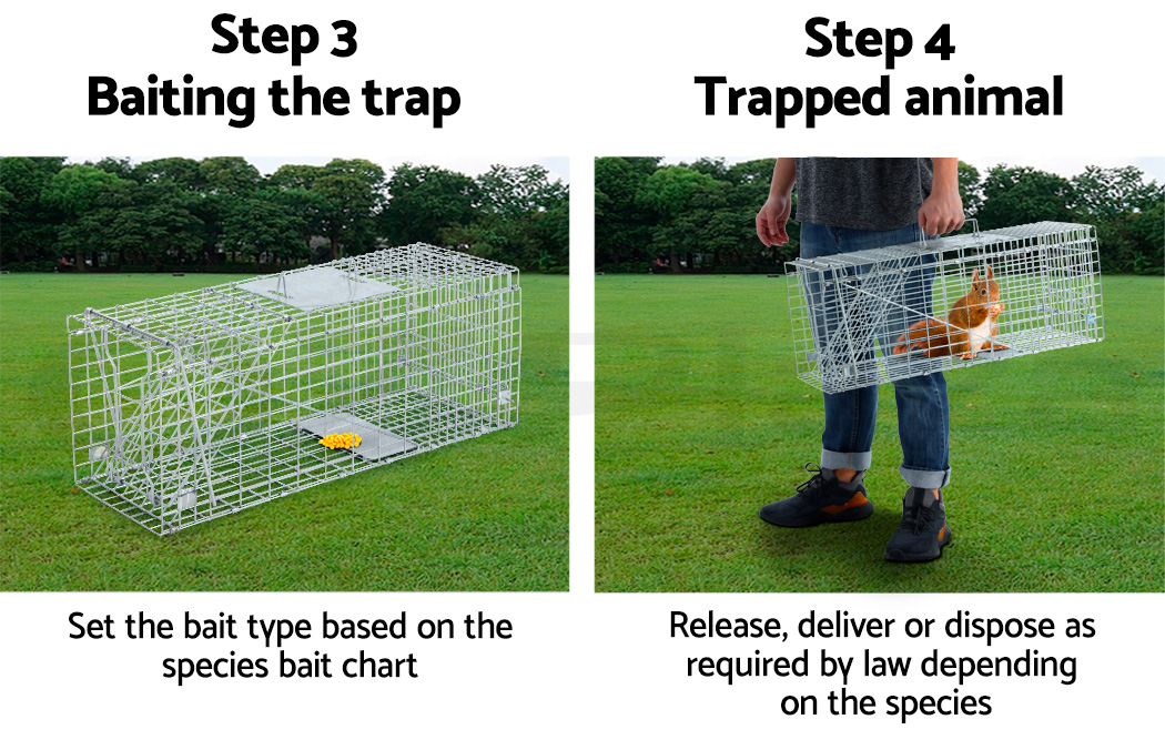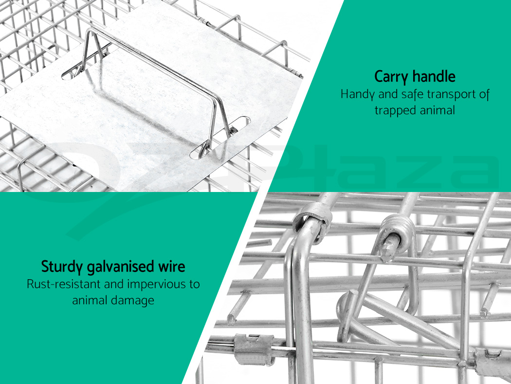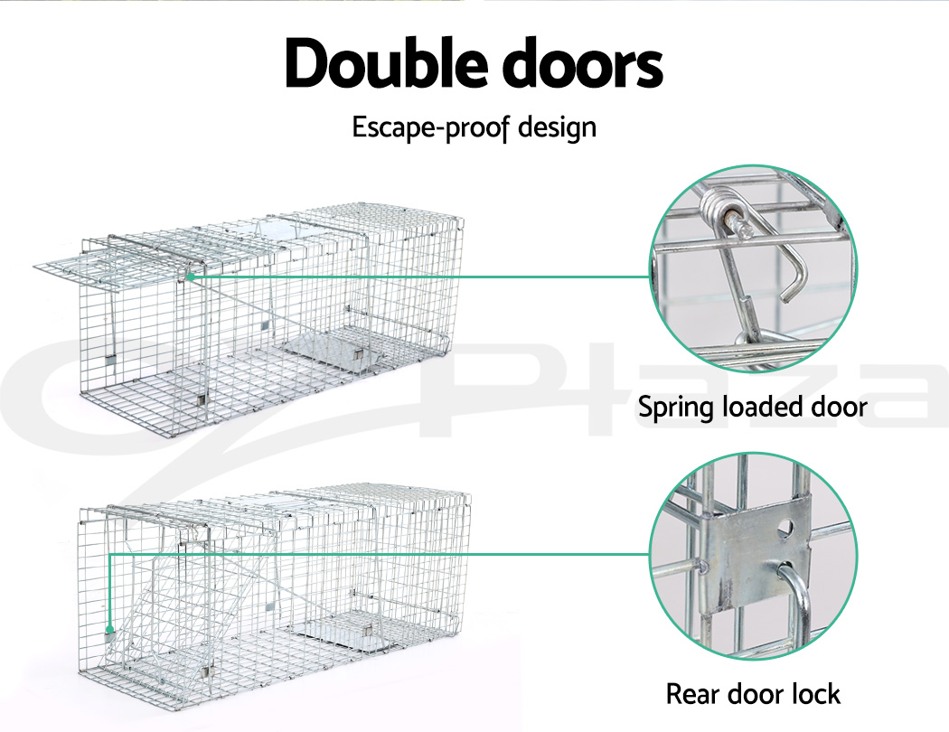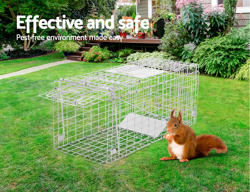 Made from quality rust resistant galvanised iron wire, this humane animal trap cage is built to last for years. Featuring spring loaded door trap with protected handle, automatic locking system that is swift in operation, this cage is designed to ensure safety of both animals and users. Perfect for removing pest animals in backyard and capturing pest alive. Collapsible design and can fold away quickly for easy storage and transportation.