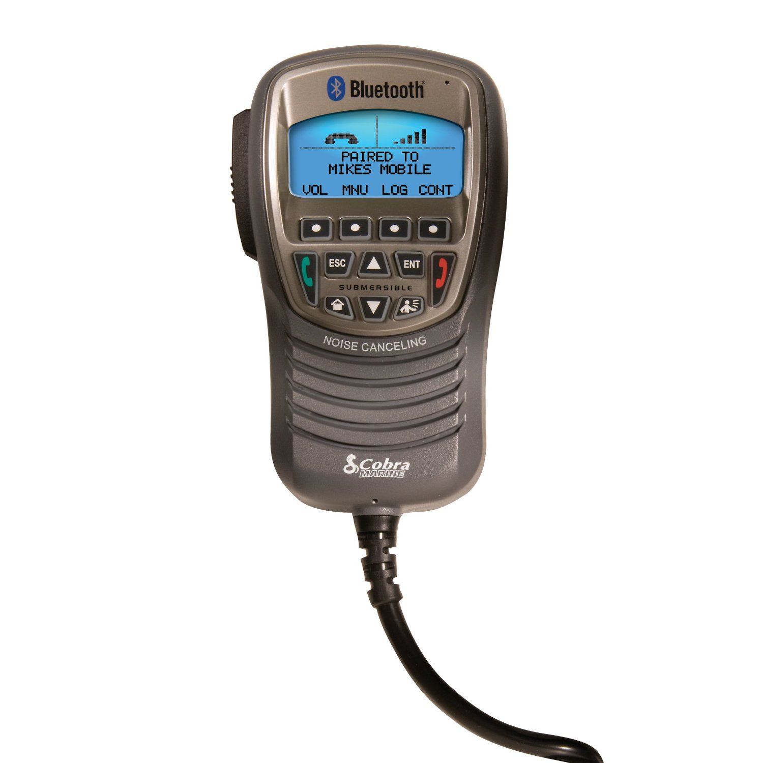 The Cobra MR F300BT is a waterproof handset with Bluetooth Wireless Technology, MicroBlue Technology (patent pending), Easy Grip, Noise Canceling Mic. This unit is waterproof to JIS7, has a large illuminated display and requires no recharging. Other features include: Easy Pair, Caller ID, easy redial operation, call log, phone book, adjustable volume, 10 selectable ring tones, backlit blue buttons and display, external audio output, waterproof deck connector, and simple installation.