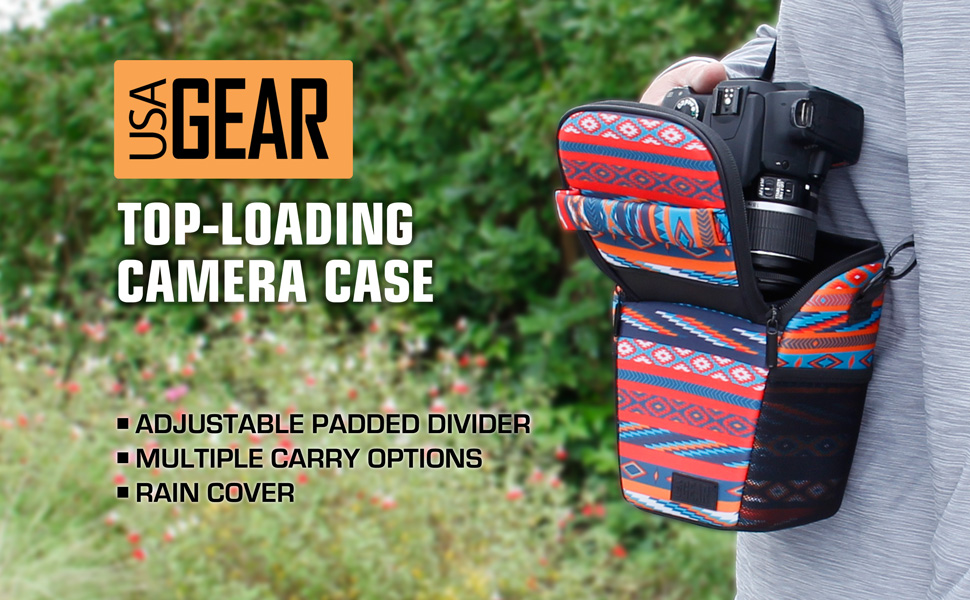 Weather resistant DSLR and mirrorless camera case with shoulder sling by USA Gear. This compact top loading camera holster bag is designed for fast access so you never miss a shot. Open the lid, grab your camera, and shoot. It is ideal as a travel camera bag, hiking camera case, or everyday carry for your Canon, Nikon, Sony, and other popular camera brands.