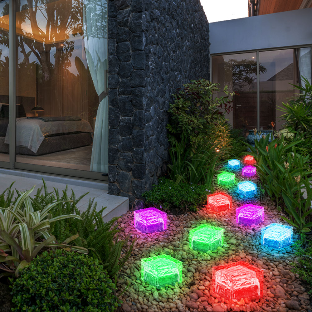 RGB LED Solarleuchte in Eiswürfelform zur Dekoration.