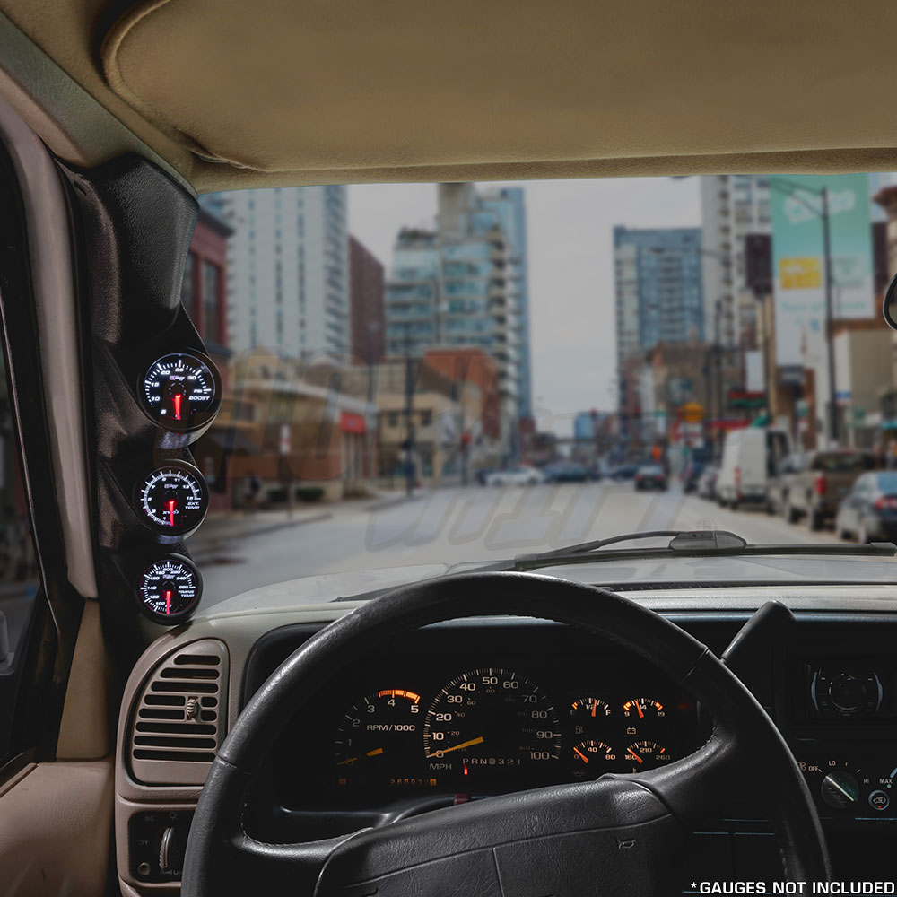 GlowShifts Black Triple Gauge Pillar Pod is custom made for any 1997-2001 Ford F-150 and mounts directly to the factory A-pillar, holding (3) 2-1/16" (52mm) gauges. This aftermarket gauge pod is manufactured from high quality ABS plastic, allowing it to withstand cracking, fading and warping. It can also be painted using ABS plastic paint to match your factory interior for a custom fit and finish. Each triple pillar pod is installed using the included color matched ABS plastic push-in mounting fasteners, ensuring that your gauge pod is secure.