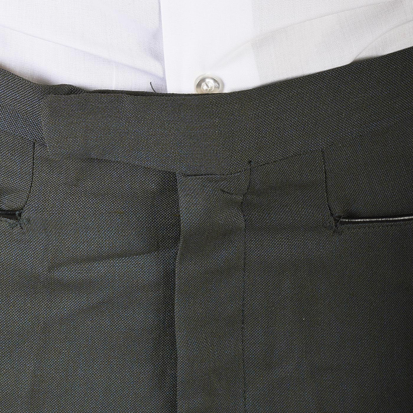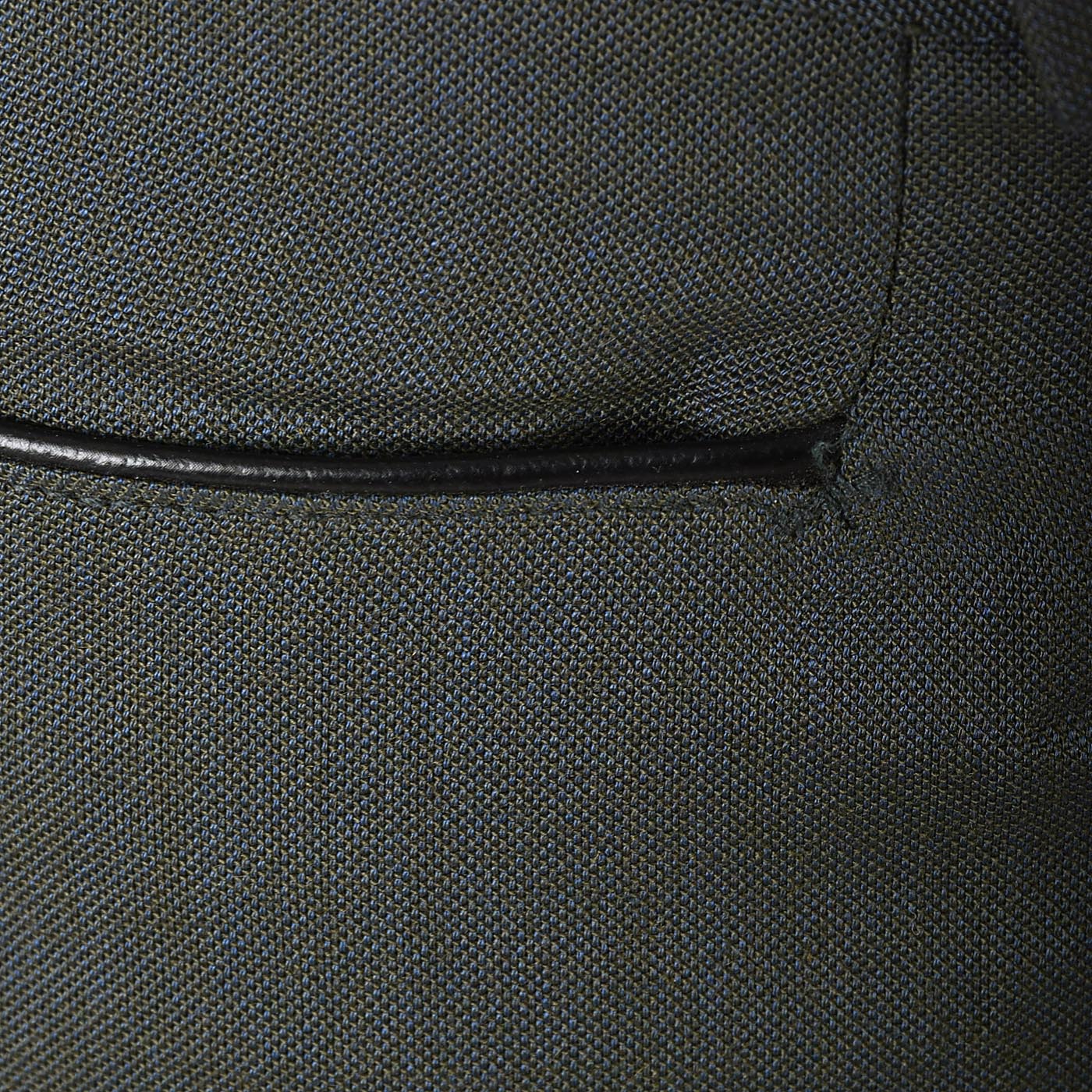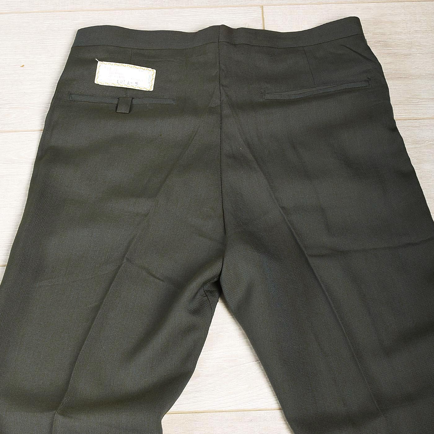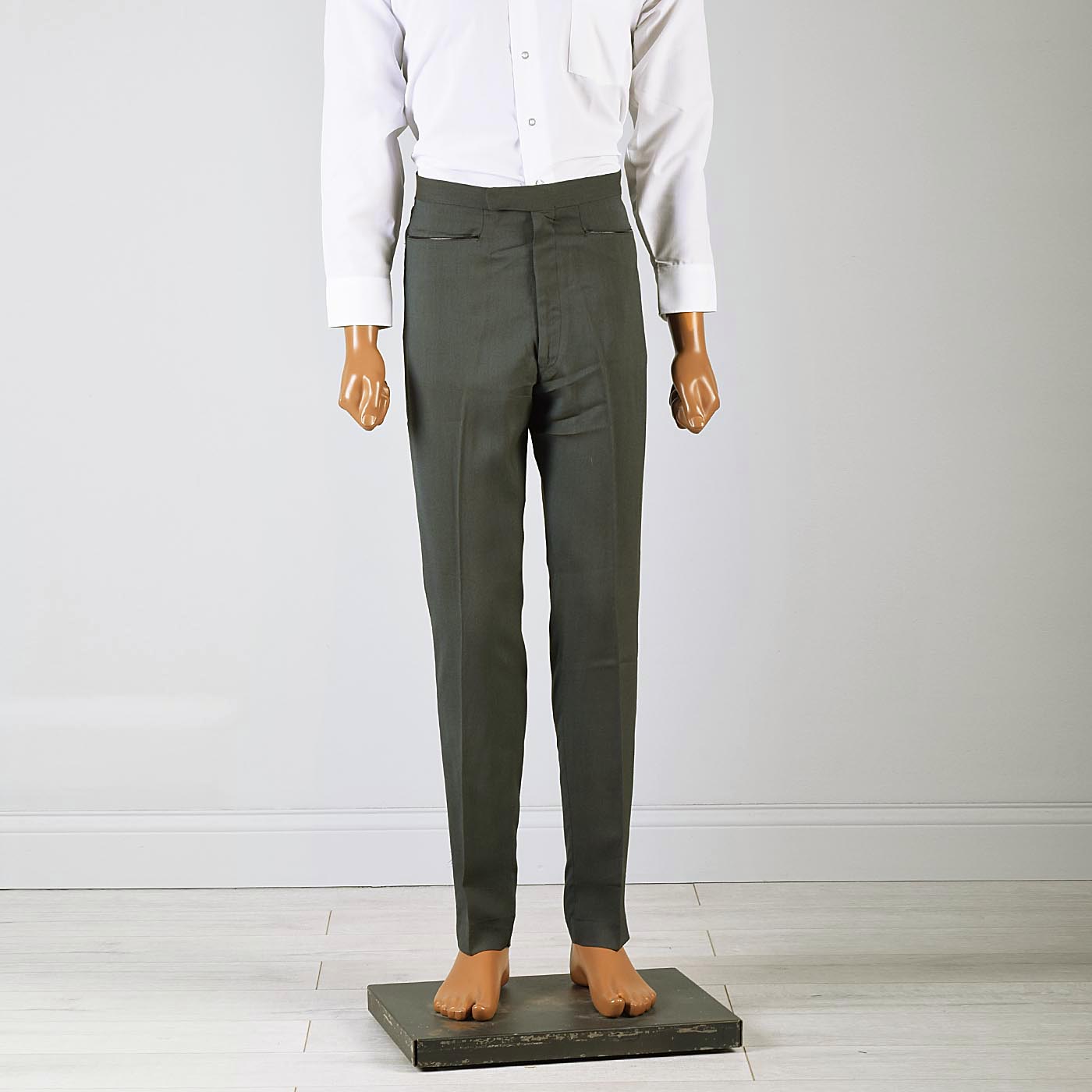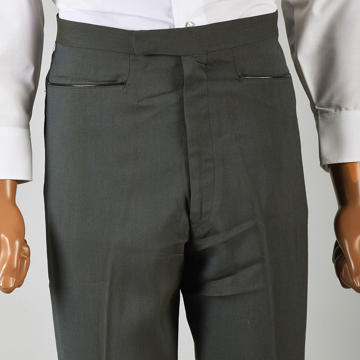 These pants are fantastic! Green sharkskin reflects a bronze color, the photos do not show the bronze reflection well. The front pockets are trimmed in black leather, or leather look vinyl (hard to tell, no labels). Flat front with no belt loops or suspender braces. The legs taper quite a bit, very tight at the ankle, no cuffs. Please note- size tags in photos may not correspond with the garment size in this listing. Not all items will have the tags shown, but they will be the same color and style. We have numerous pants in this style and color, although the title and tag may show the same size, please note that each pair may have a slight differences in measurements.