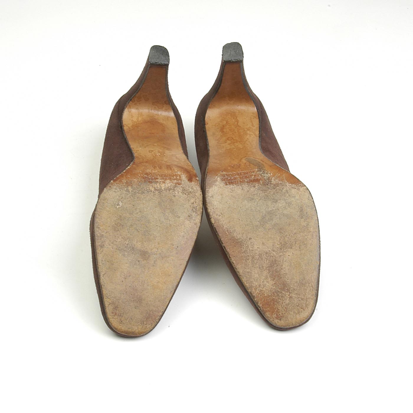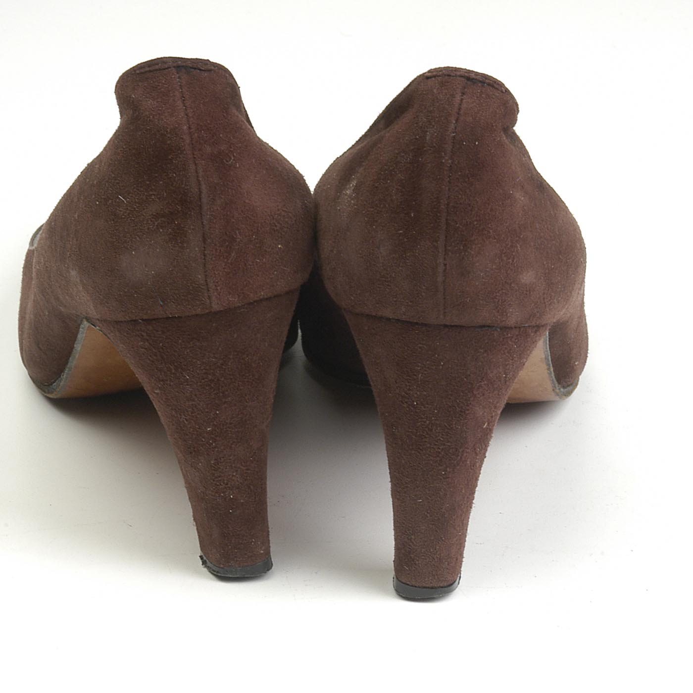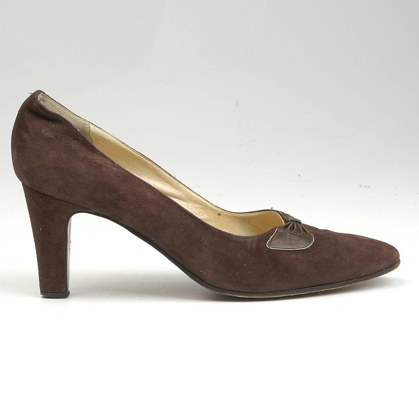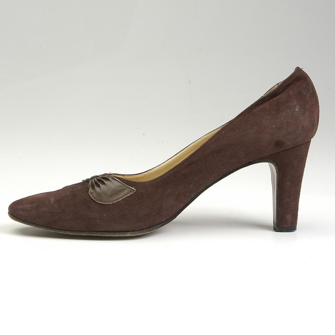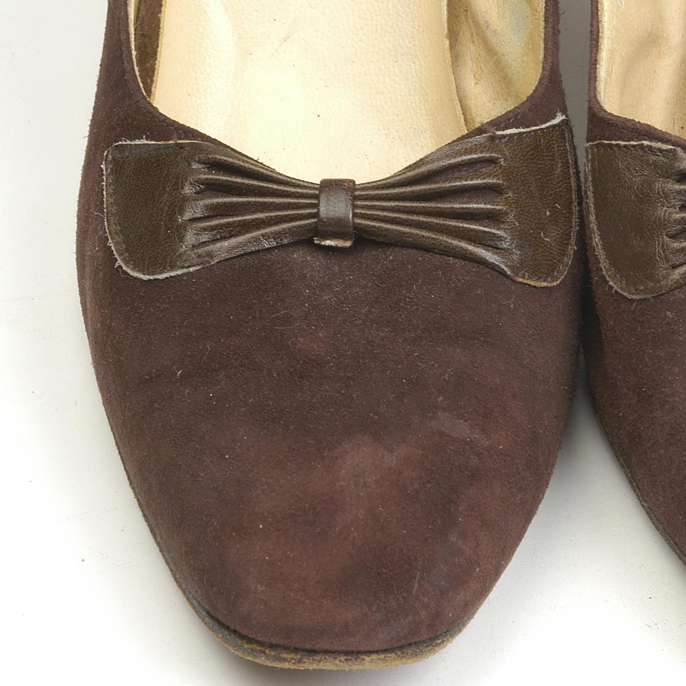 This is a pair of brown suede shoes. Closed toe with a smooth leather bow on the toe. Wide sturdy heel. Nicely made. They fit me, just a touch loose, at a small size 8. Would fit perfect with knit tights. These are marked a size 9, but double check the width, narrow shoes can fit sizes smaller than marked.