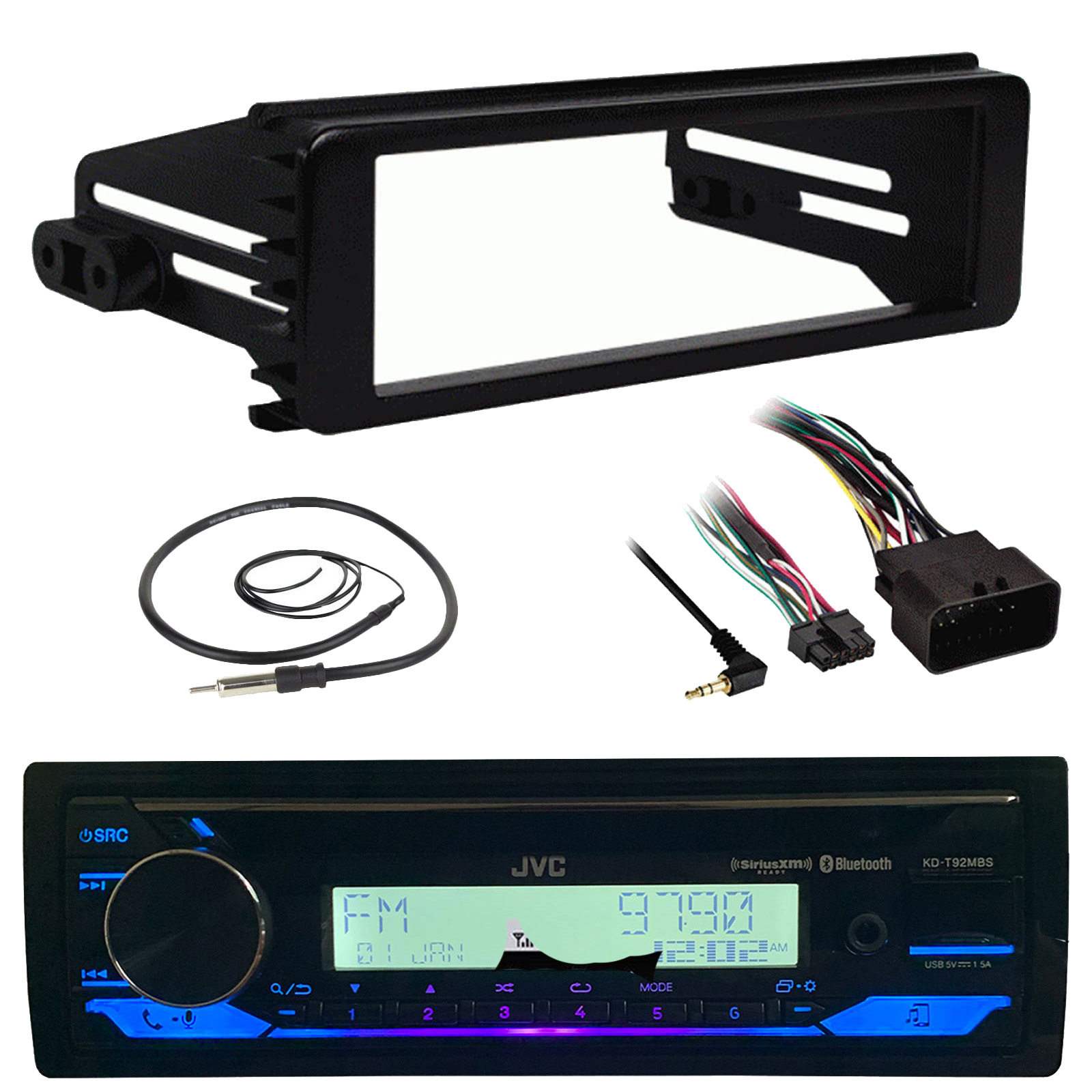 JVC KD-T92MBS Single DIN Marine MotorSports Bluetooth USB AUX Stereo SiriusXM CD Player Receiver, Stereo Install Kit, 22" Radio Antenna