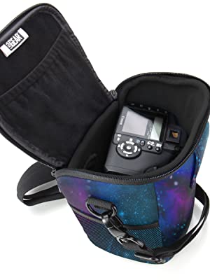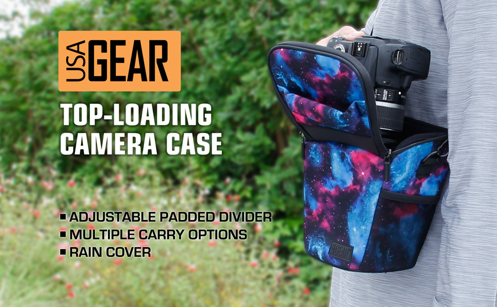 Weather resistant DSLR and mirrorless camera case with shoulder sling by USA Gear. This compact top loading camera holster bag is designed for fast access so you never miss a shot. Open the lid, grab your camera, and shoot. It is ideal as a travel camera bag, hiking camera case, or everyday carry for your Canon, Nikon, Sony, and other popular camera brands.