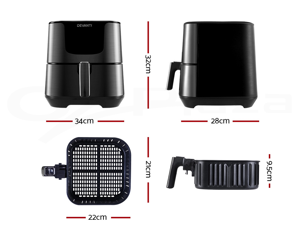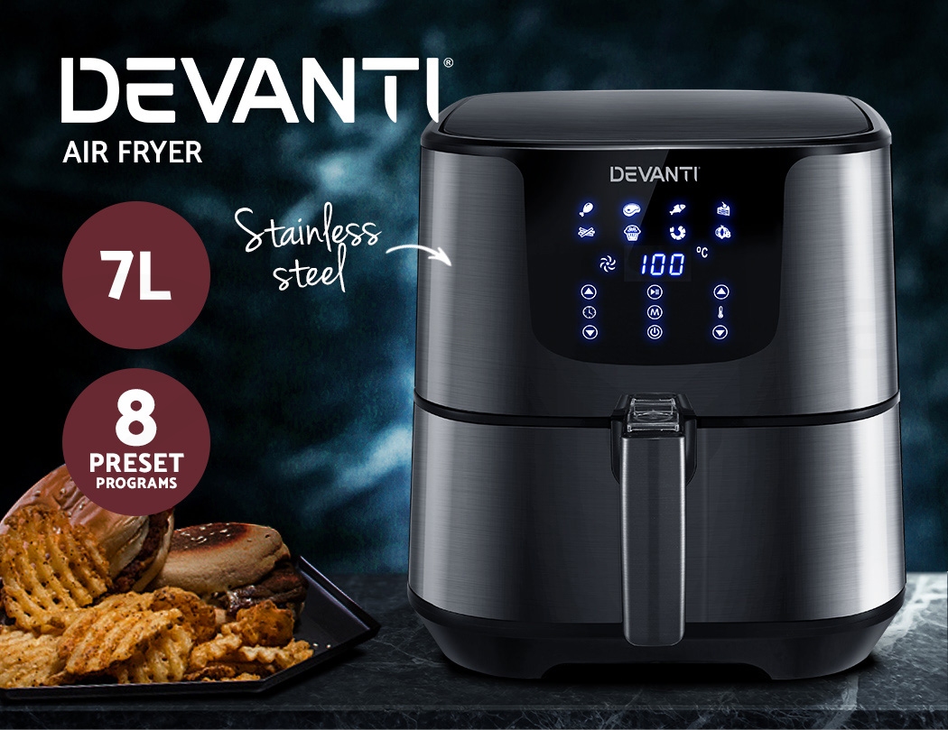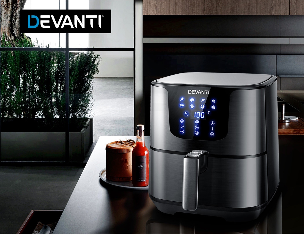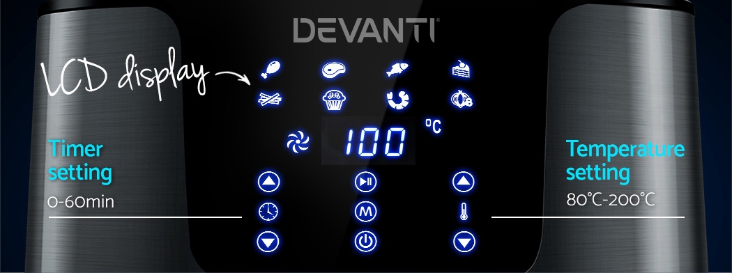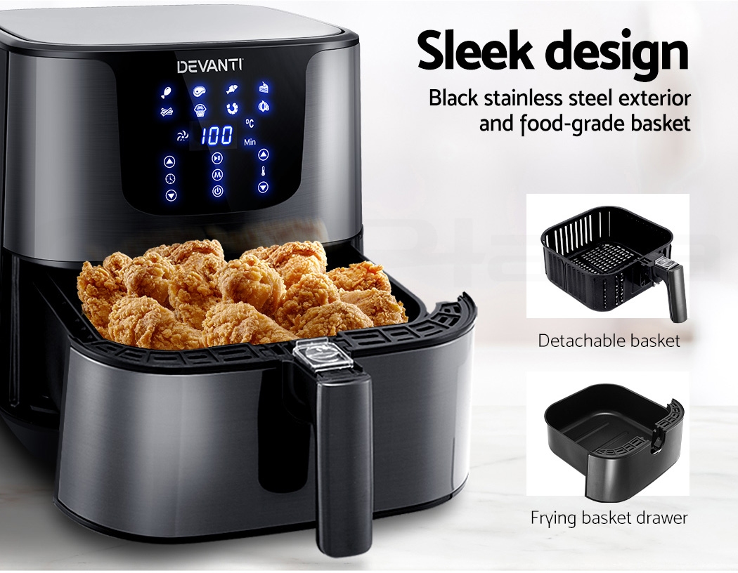 With its stunning and sleek black stainless steel exterior, our Devanti Air Fryer turns the ordinary into the extraordinary. And that goes too for its exceptional cooking abilities. With its innovative air frying technology and 1700W of power, your cooking is done efficiently and thoroughly with less odours. Better still, all the wonderful cooking is done without a single drop of oil and yet is as delicious and sumptuous as traditional methods. In fact, foods cooked in in our air fryer have up to 80% less fat than deep-fried foods. This model has an all-in-one functionality and does not only fry food, but also roasts, grills and bakes. Just set in the cooking mode (up to eight preset programs to choose from) or time (up to 60 minutes) and temperature (up to 200°) on the easy-to-use LCD touch controls, then leave all the hard work to the air fryer. Other great features include an auto shut-off function, non-stick pan and heat shield vent for good air circulation. The air fryer has a large 7L capacity making it suitable for most families. Most importantly, the components are dishwasher-safe, which makes the cleaning up process as easy as the cooking process.