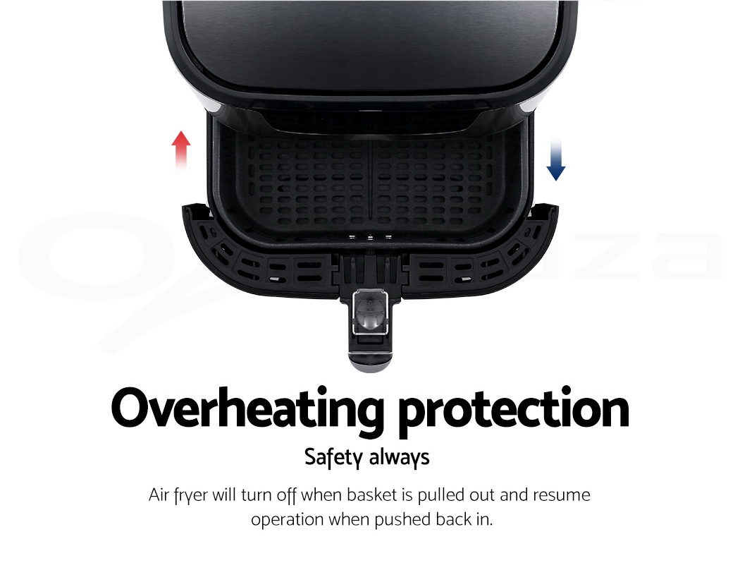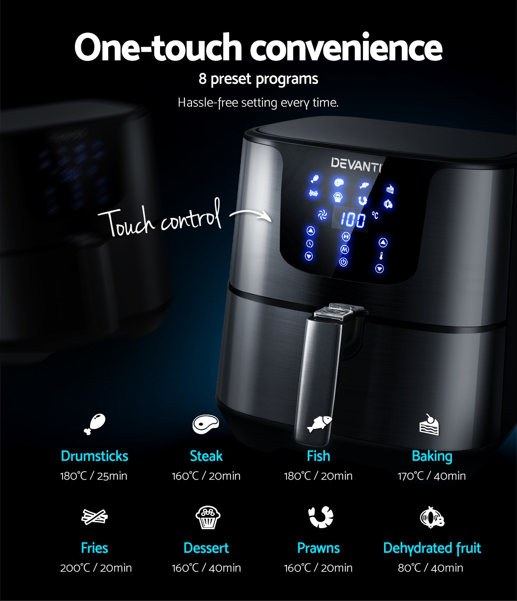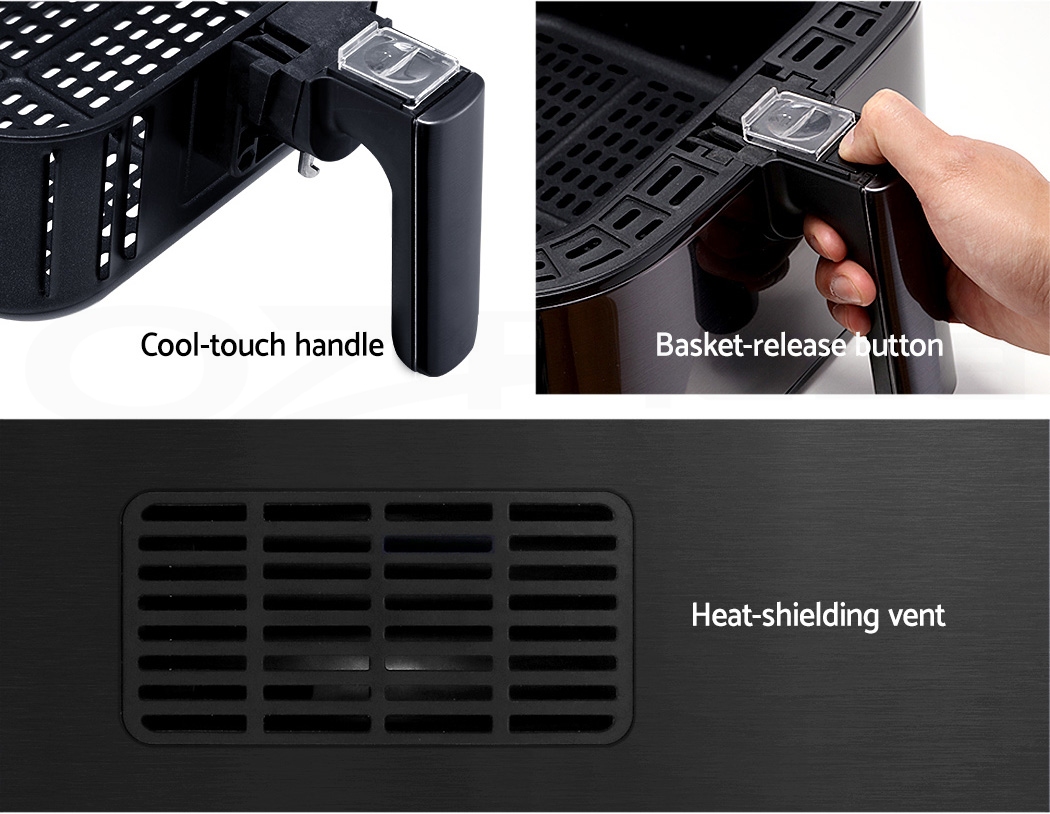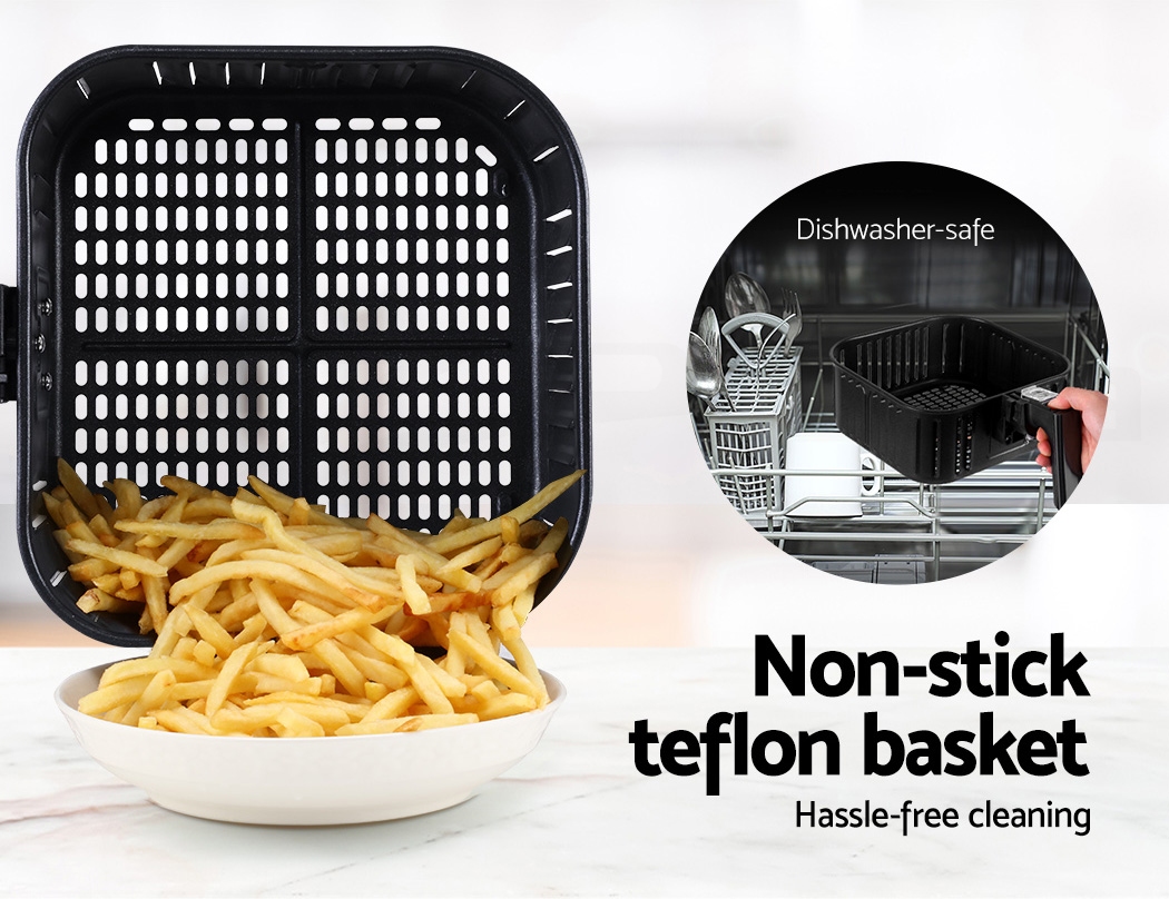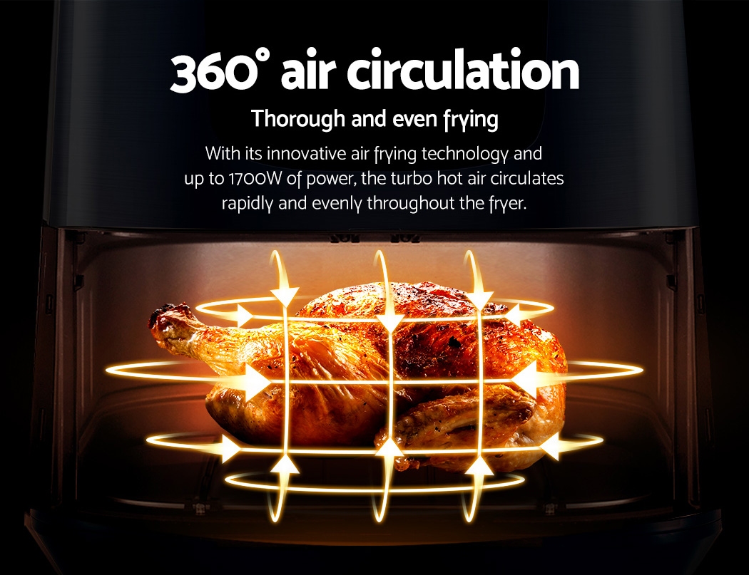 With its stunning and sleek black stainless steel exterior, our Devanti Air Fryer turns the ordinary into the extraordinary. And that goes too for its exceptional cooking abilities. With its innovative air frying technology and 1700W of power, your cooking is done efficiently and thoroughly with less odours. Better still, all the wonderful cooking is done without a single drop of oil and yet is as delicious and sumptuous as traditional methods. In fact, foods cooked in in our air fryer have up to 80% less fat than deep-fried foods. This model has an all-in-one functionality and does not only fry food, but also roasts, grills and bakes. Just set in the cooking mode (up to eight preset programs to choose from) or time (up to 60 minutes) and temperature (up to 200°) on the easy-to-use LCD touch controls, then leave all the hard work to the air fryer. Other great features include an auto shut-off function, non-stick pan and heat shield vent for good air circulation. The air fryer has a large 7L capacity making it suitable for most families. Most importantly, the components are dishwasher-safe, which makes the cleaning up process as easy as the cooking process.