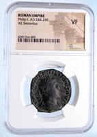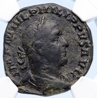 Philip I 'the Arab' - Roman Emperor: 244-249 A.D. Bronze Sestertius 29mm (14.76 grams) Rome mint, struck circa 244-249 A.D. Reference: RIC 171a; C 51 Certification: NGC Ancients VF 4281764-009 IMP M IVL PHILIPPVS AVG, Laureate, draped and cuirassed bust right. FIDES EXERCITVS, Four legionary standards; SC in exergue. You are bidding on the exact item pictured, provided with a Certificate of Authenticity and Lifetime Guarantee of Authenticity.