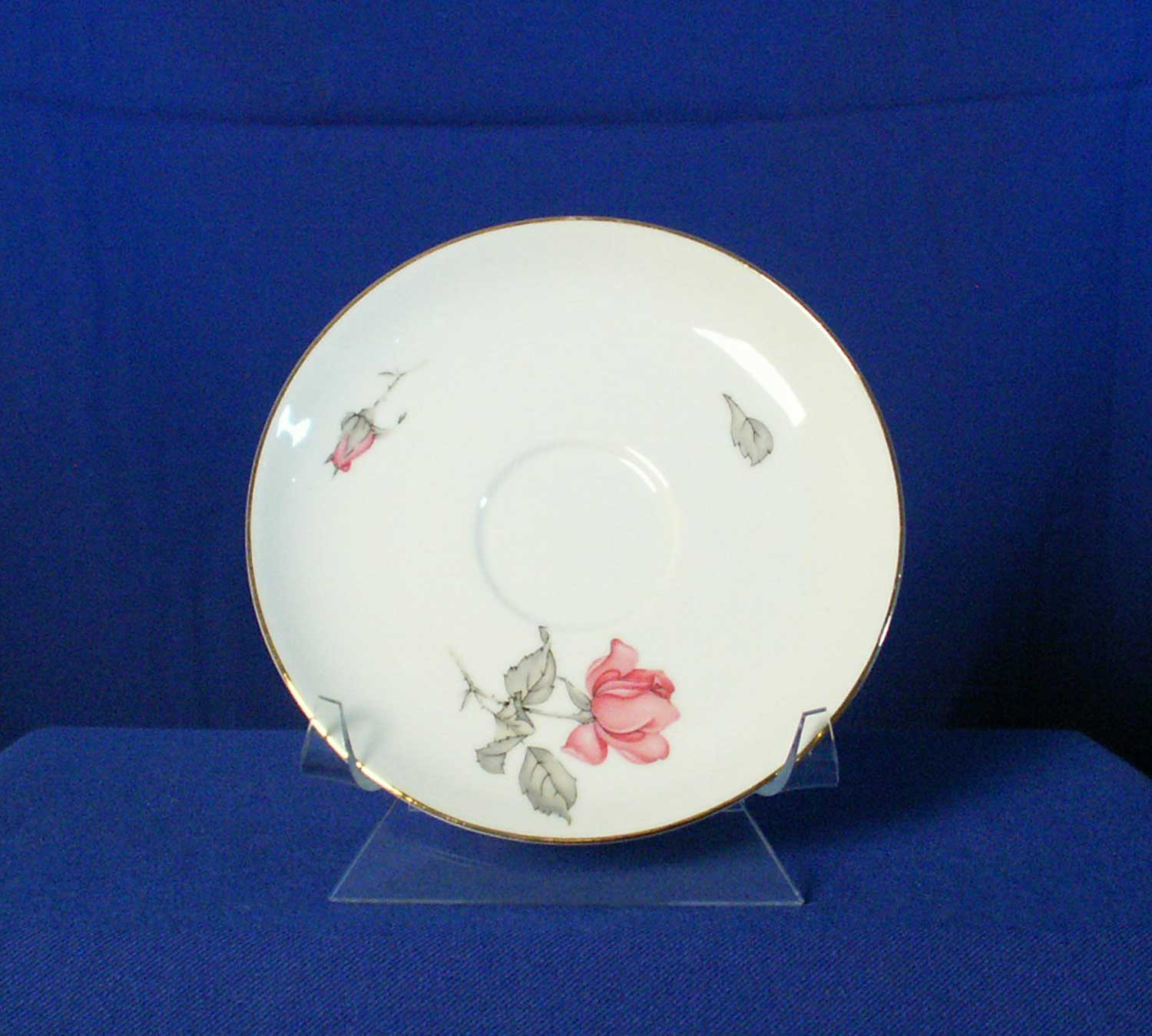 KPM (Konigliche Porzellan-Manufaktur) 675 Saucer Gold Trim Rose Krister Mark Germany | We are offering a round saucer in the 675 pattern made by KPM (Konigliche Porzellan-Manufaktur) of Germany. This piece's base color is white with pink rose motif on lip, and gold trim. Production has been discontinued.