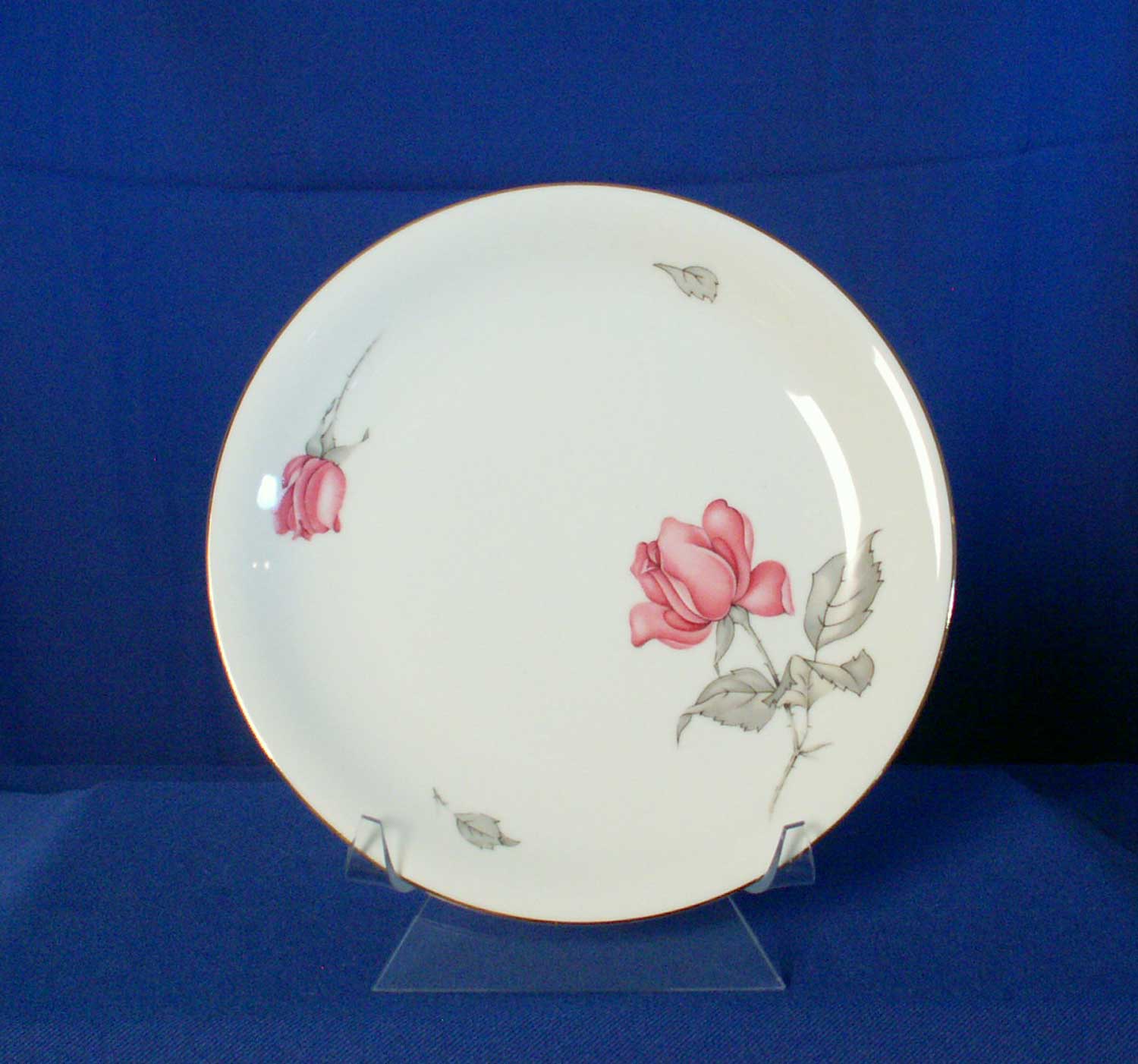 We are offering a round salad plate in the 675 pattern made by KPM (Konigliche Porzellan-Manufaktur) of Germany. This piece's base color is white with pink rose stem motif center, and gold trim. Production has been discontinued.