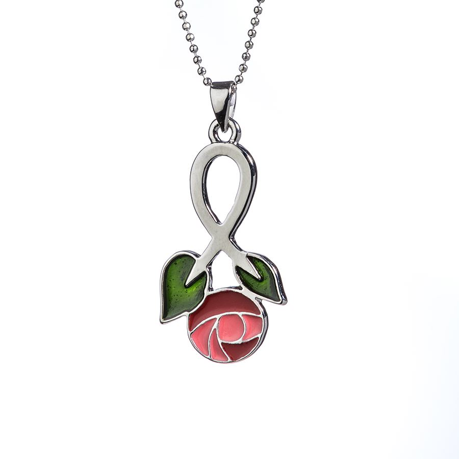 Rhodium plated silver enamel pendant & chain - Large rose design