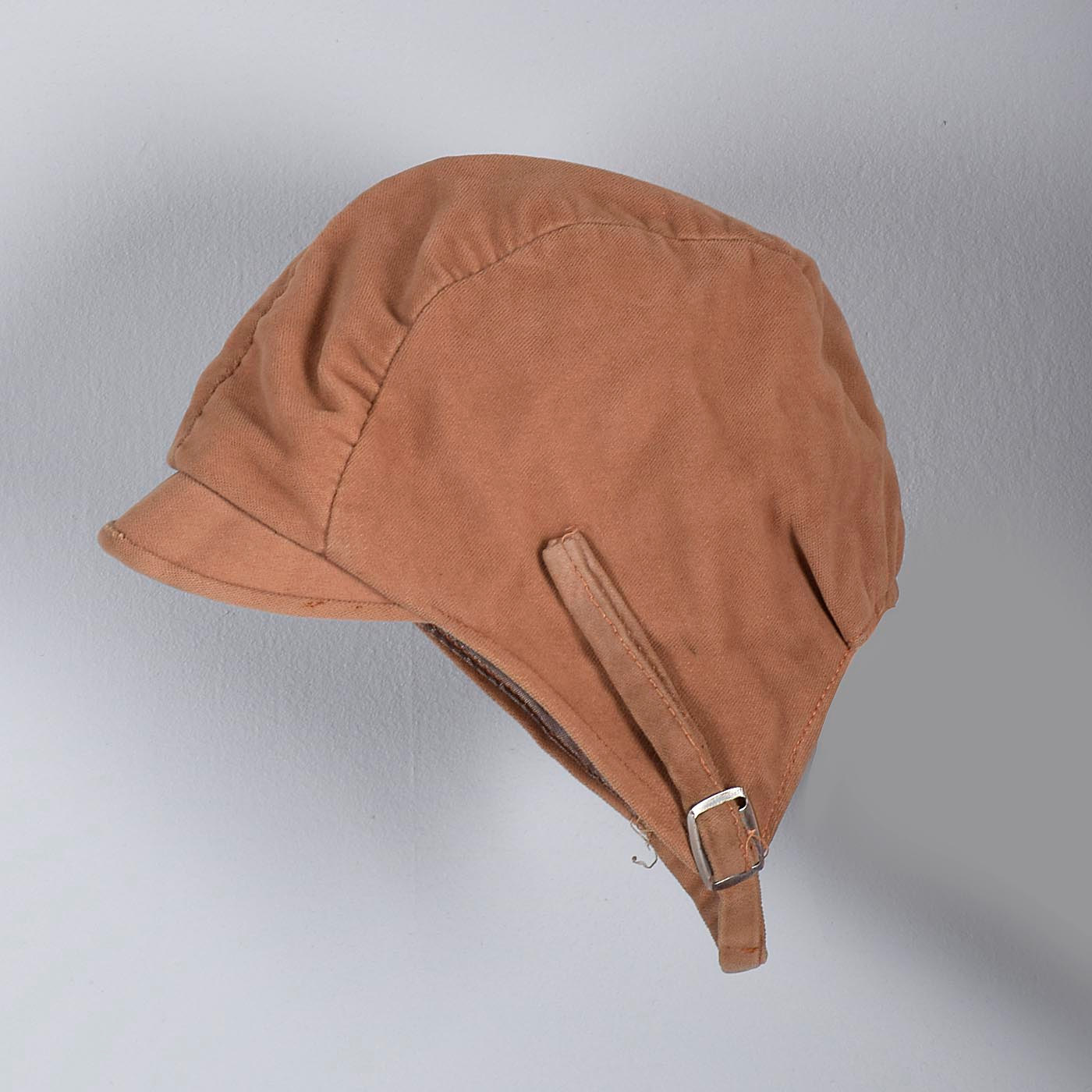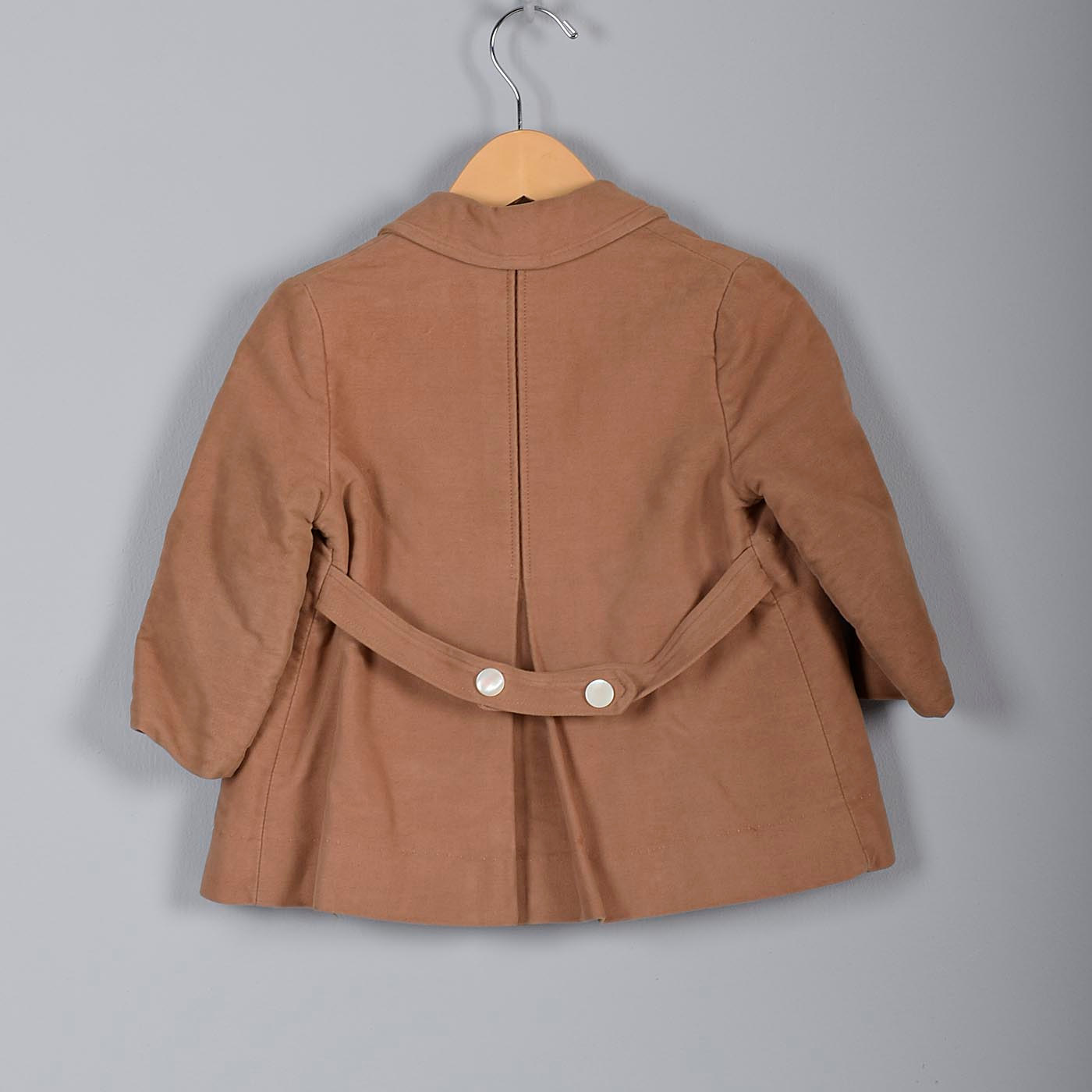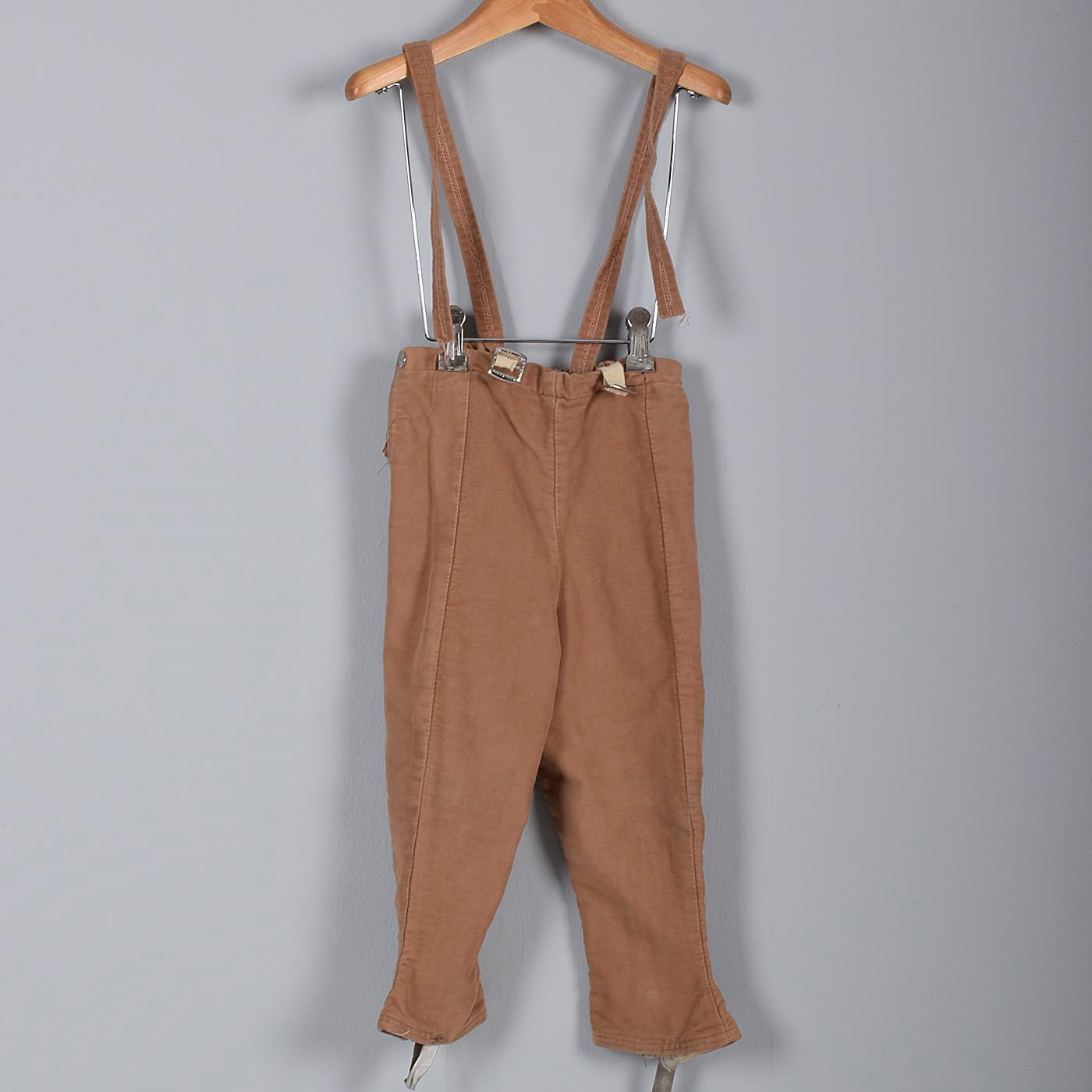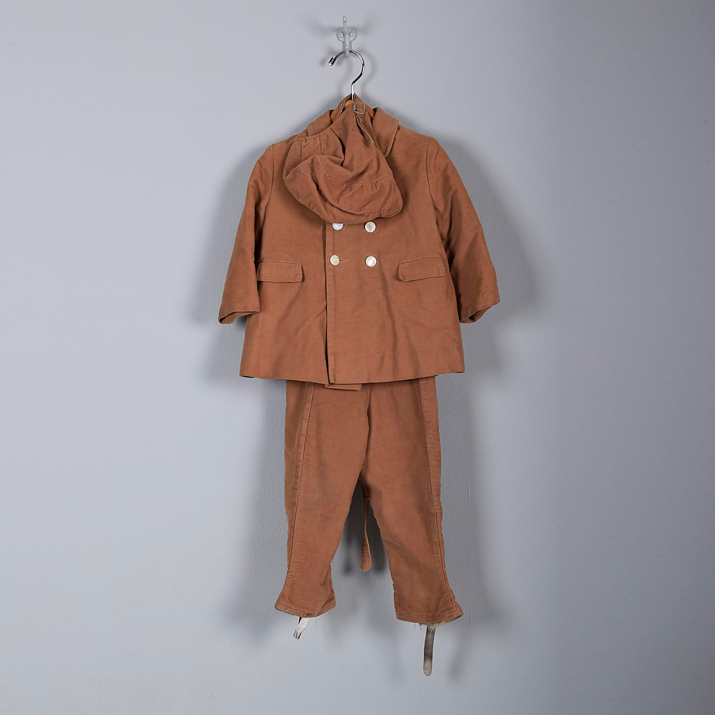 Details: This is a boy's brown three piece outfit. This set comes with a double breasted coat, pants with suspenders and leg zippers, and a hat with an adjustable bottom strap. Right side of pants, under side snap is a bit torn. This does not affect the look or wearability of this set.