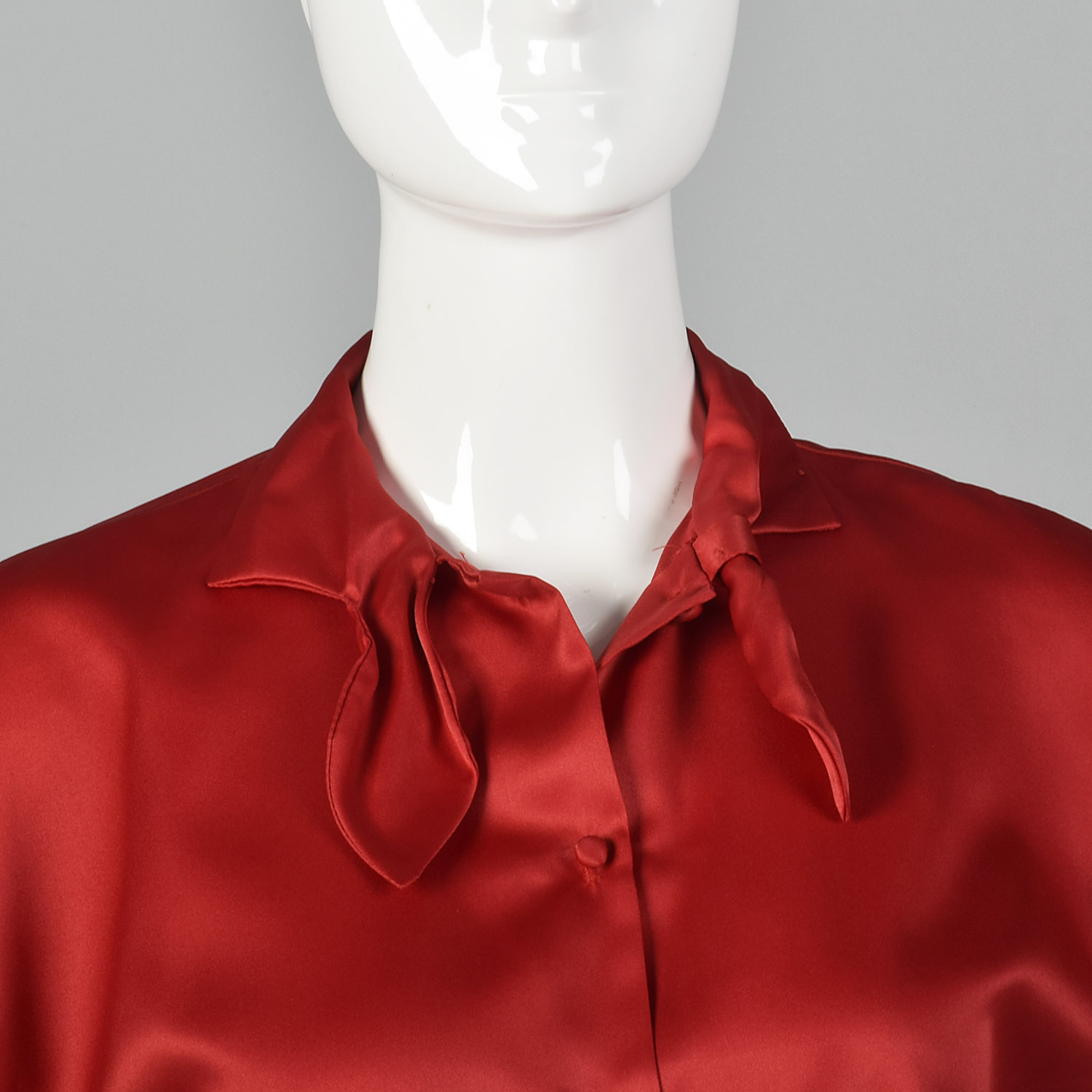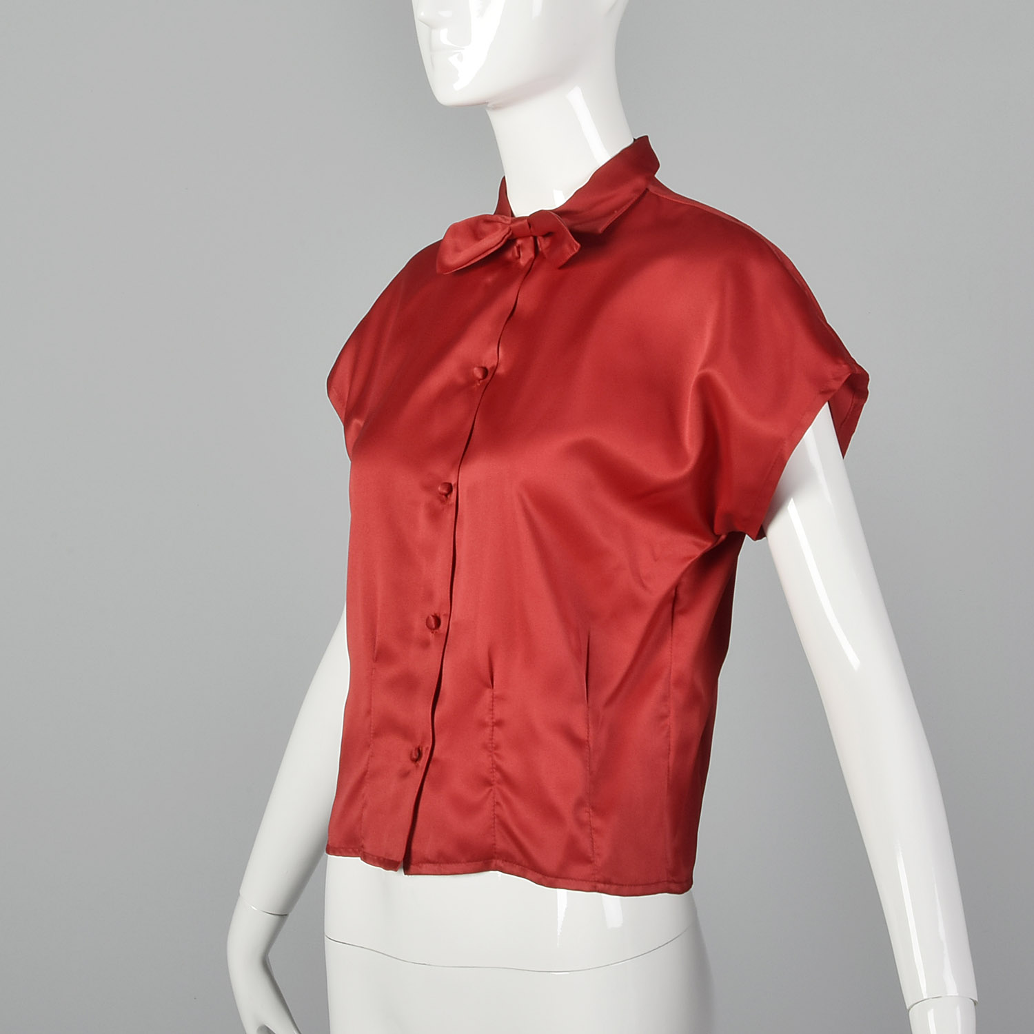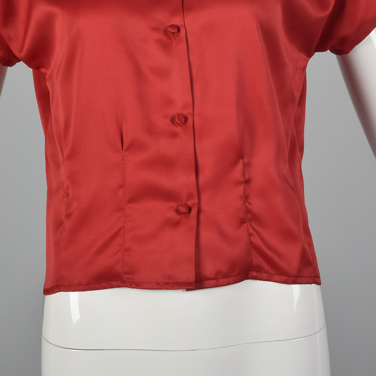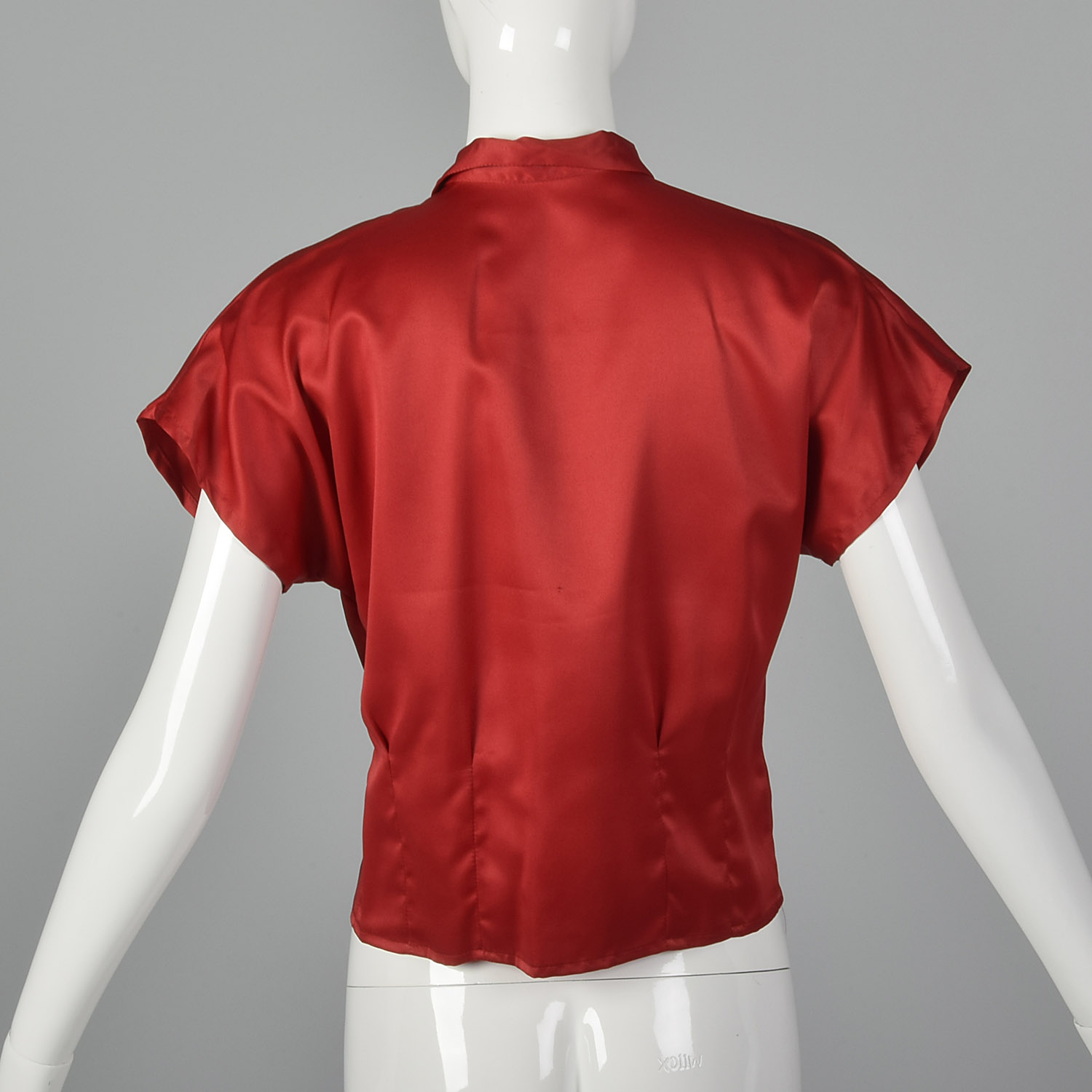 This listing is for one top. The textile is unmarked in a silky red and is lightweight. This top has short, dolman sleeves, a bow at the neck, and a button front. There is one snag on the back of the blouse, but this piece is still very wearable.