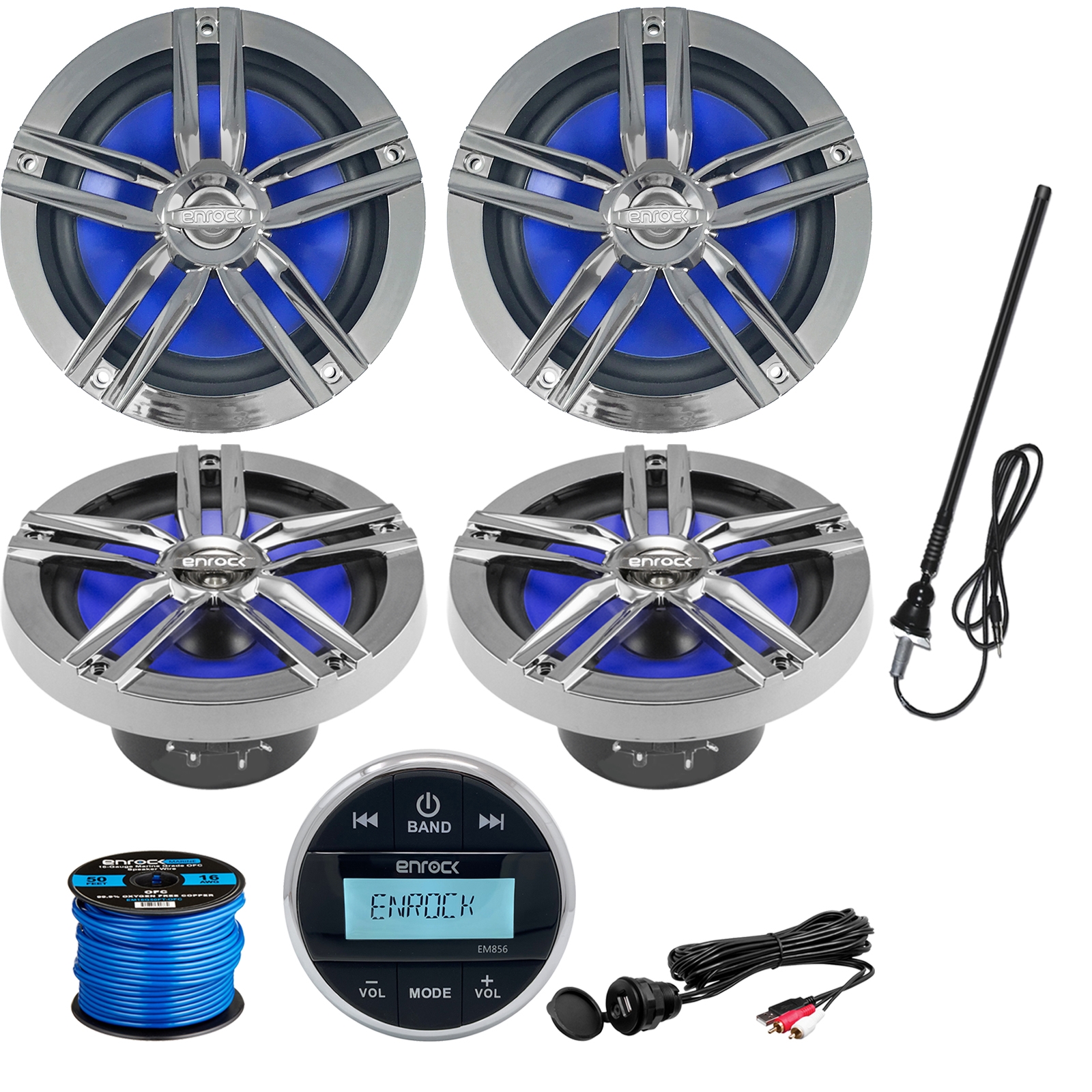 PACKAGE BUNDLE INCLUDES: Enrock EM856 Gauge Mount Media Center Marine Grade Receiver, 4 x Enrock EM265C Marine 2-Way 180W High-Performance 6.5" Water-Resistant Loudspeakers (Charcoal), Enrock Universal USB/3.5MM Auxiliary Interface Mount, Enrock Flexible Rubber Mast Long-Range Marine Boat/Yacht Radio Antenna (Black).