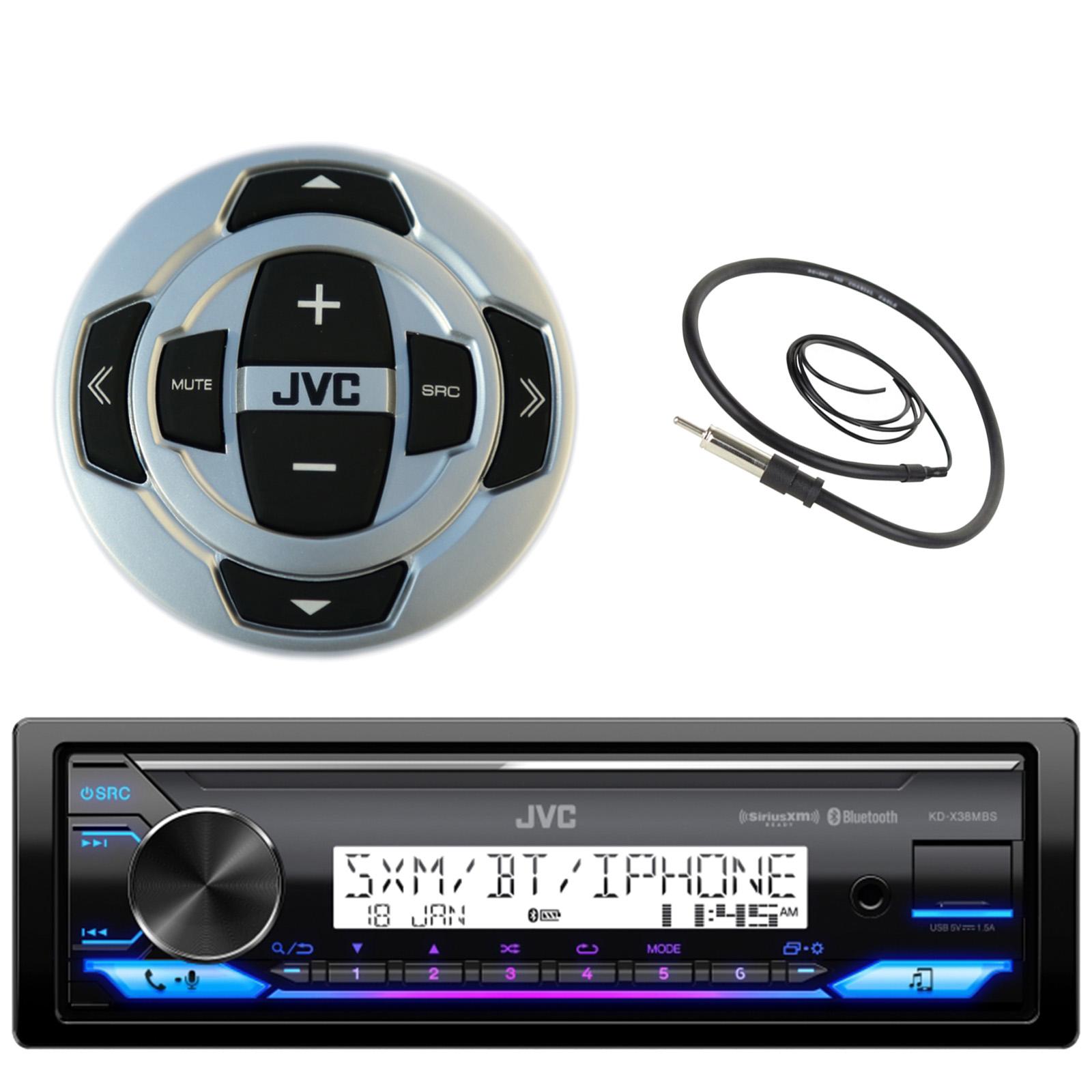 • PACKAGE BUNDLE INCLUDES: JVC KD-X38MBS Single DIN Marine MotorSports Bluetooth USB AUX LED Stereo Receiver, Wired Remote, 22" Enrock AM/FM Antenna