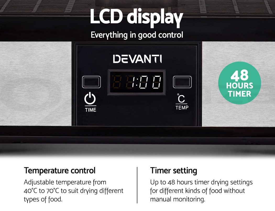 Making your favourite healthy dried foods snack is easy with the Devanti Stainless Steel Food Dehydrator. Just cut and place your fruits, vegetables, meat or more onto the food-grade PS trays, set the temperature and timer and let the machine does its magic. The transparent door allows you to keep track of the entire drying process as well as preventing heat loss from the operation.