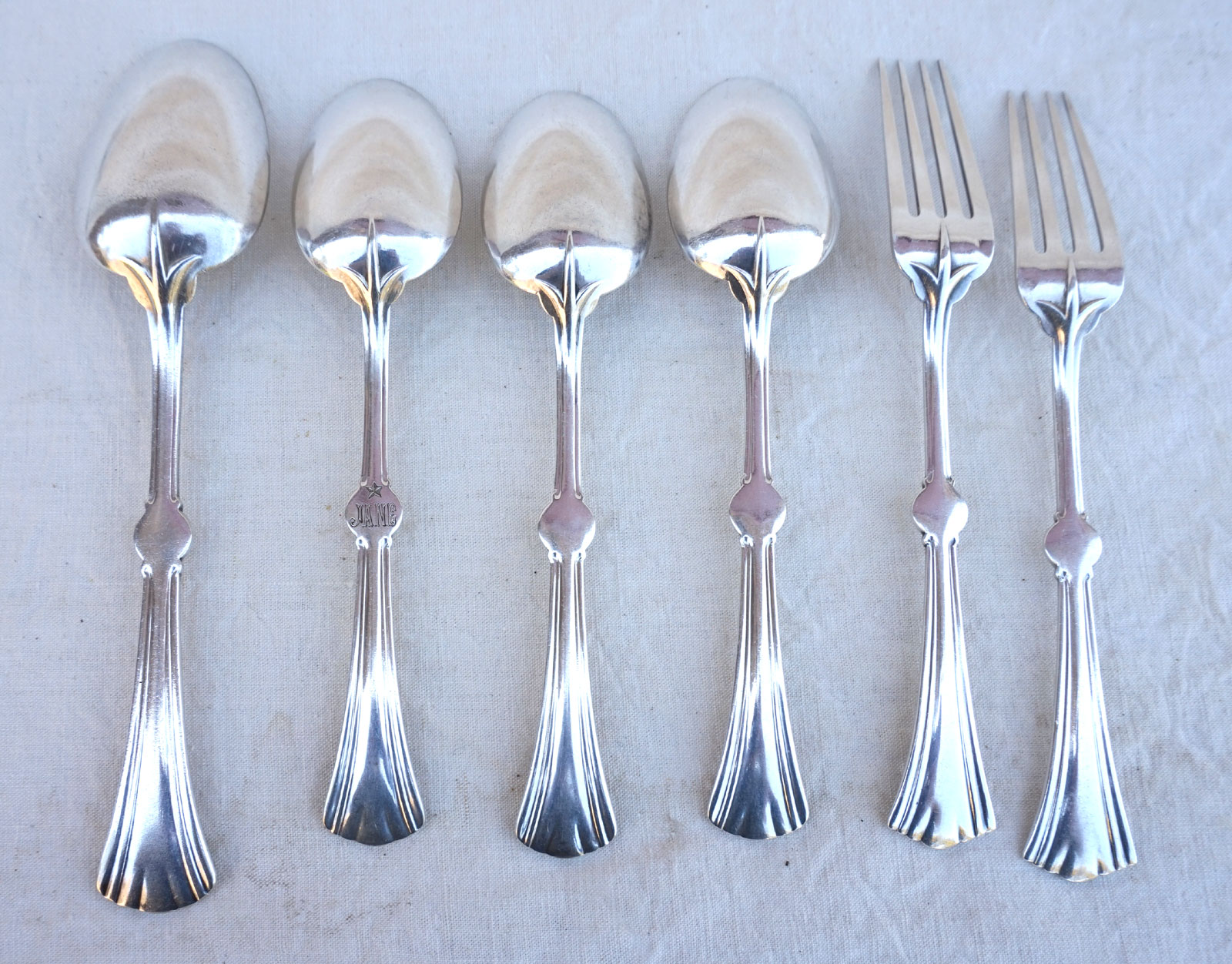 | For our French-speaking friends:Ensemble de couverts: 1 cuillère de table (longueur 20.6cm), 3 cuillères dessert (longueur 18.1cm) , dont une monogramée Jane, 2 fourchettes dessert (longueur 19cm), modèle Lotus de chez Christofle , période Art Nouveau. Tous les pièces sont estampillés Christofle. Bel état. |
