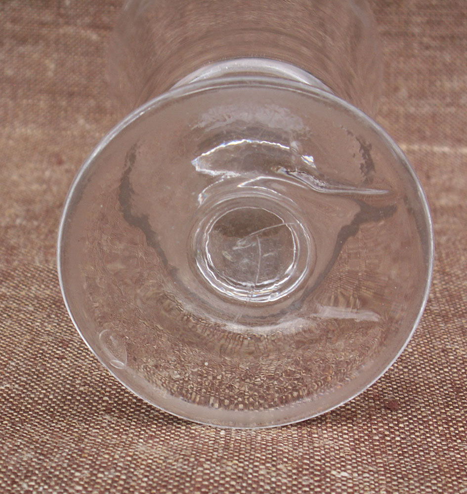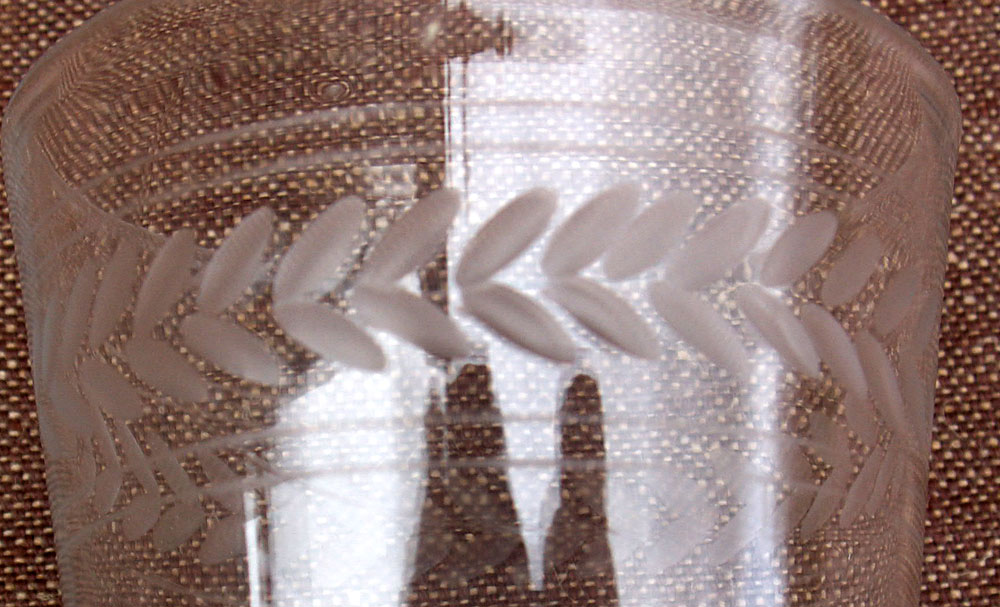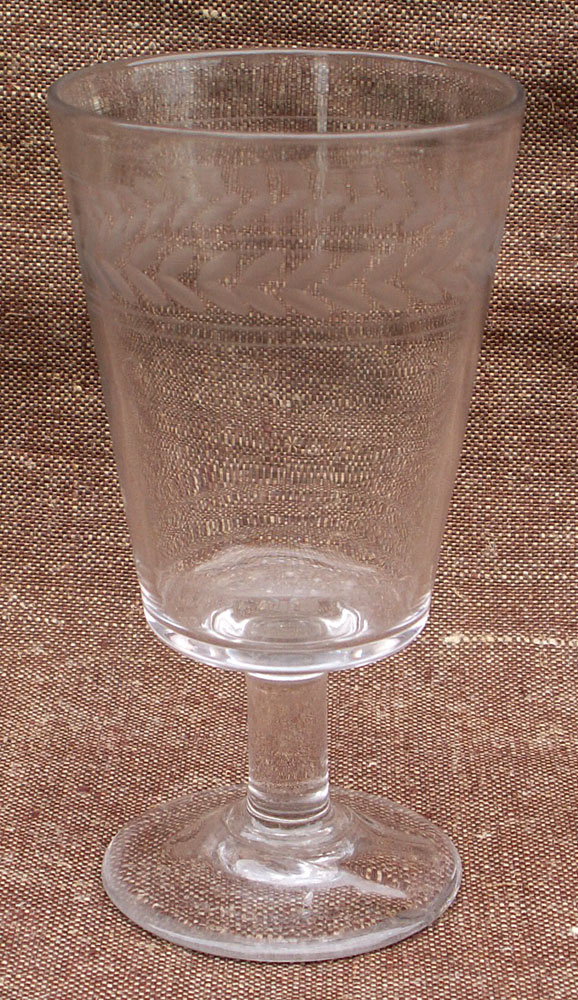 | For our French-speaking friends: Verre gravé sur pied à décor de couronnes d'épis, vers 1900. Très bel état, pontil cassé. Hauteur 13.8cm,diamètre 7.4cm. |