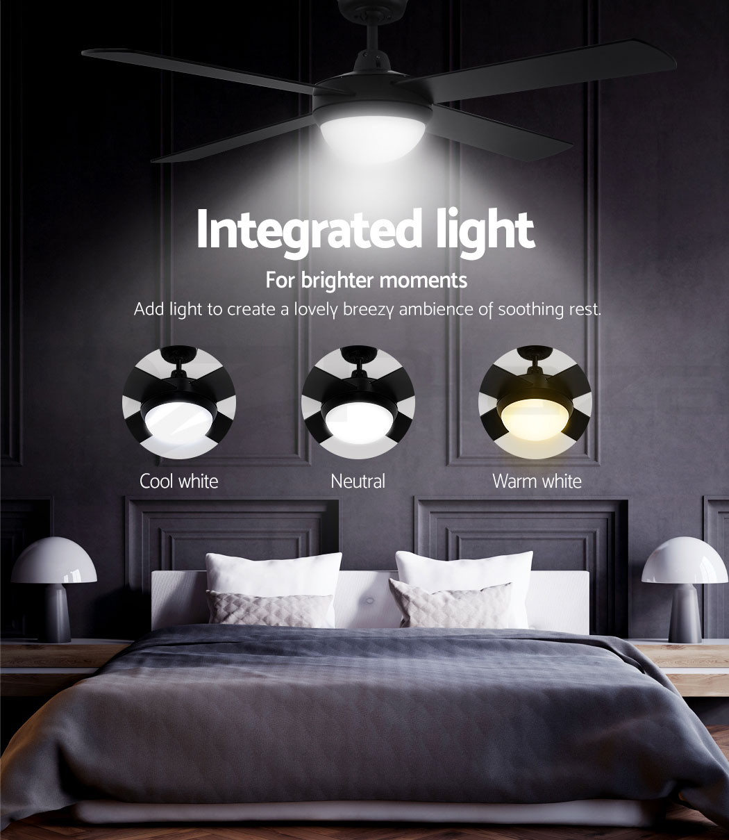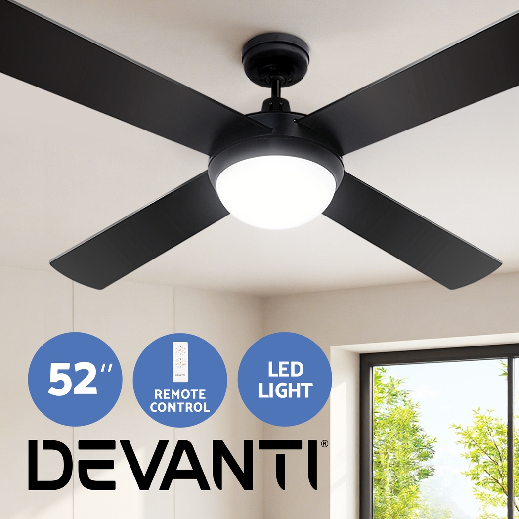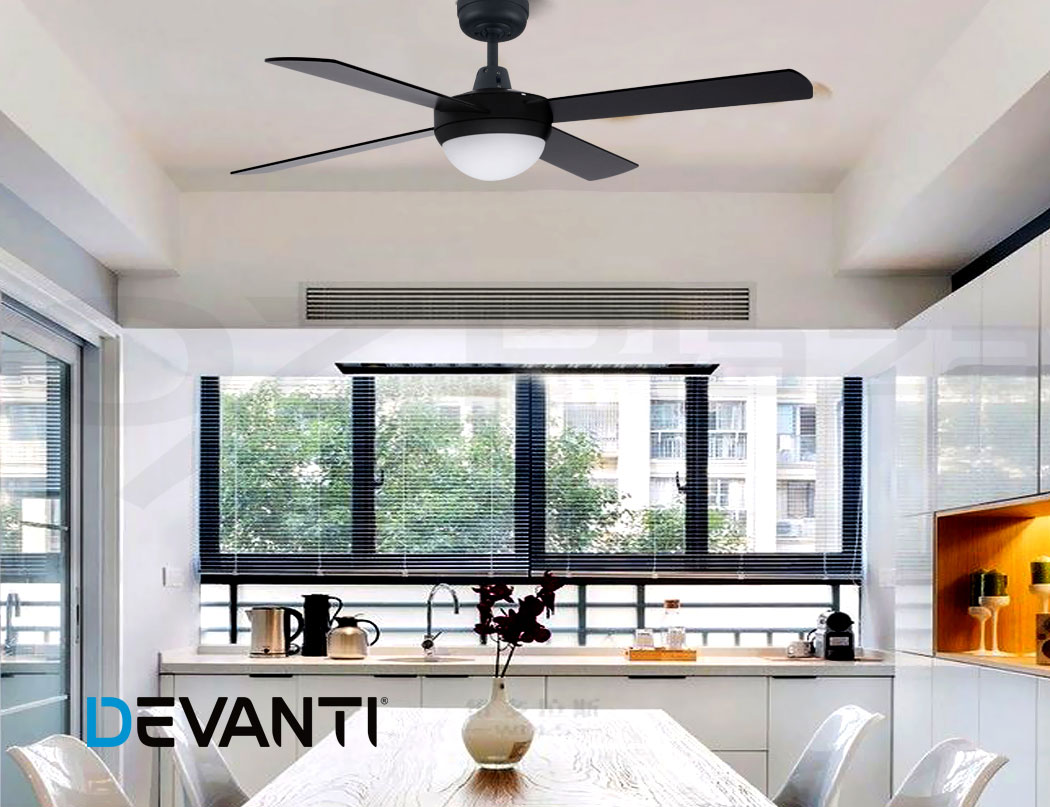 Gentle breezes, light drafts or high winds, the Devanti 52" Ceiling Fan is ever ready to meet your requirements easily. With six fan speeds, the contemporary-design ceiling fan also has a reverse cycle motor that can create downdrafts during summer or updrafts during winter for greater comfort. Its four high-quality wooden blades are pitched at an airflow-inducing 12 degree for more effective wind creation. Plus, its energy-efficient 35W motor operates ever so quietly. Also featured is built-in memory-enabled LED lighting that can bring on a cool white, warm white or neutral lighting ambience to go with the fanning function. Better still, the fan can be set for up to 8 hours of timed operation and the handy remote control makes this fan a breeze to use from anywhere in the room. The ceiling fan also comes with all the accessories for an easy installation including an extension rod. Available in black, white or silver colour to match your decoration easily.