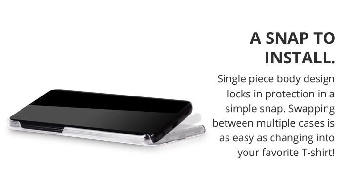 A Snap to Install. Single piece body design locks in protection in a simple snap. Swapping between multiple cases is as easy as changing into your favorite T-shirt!