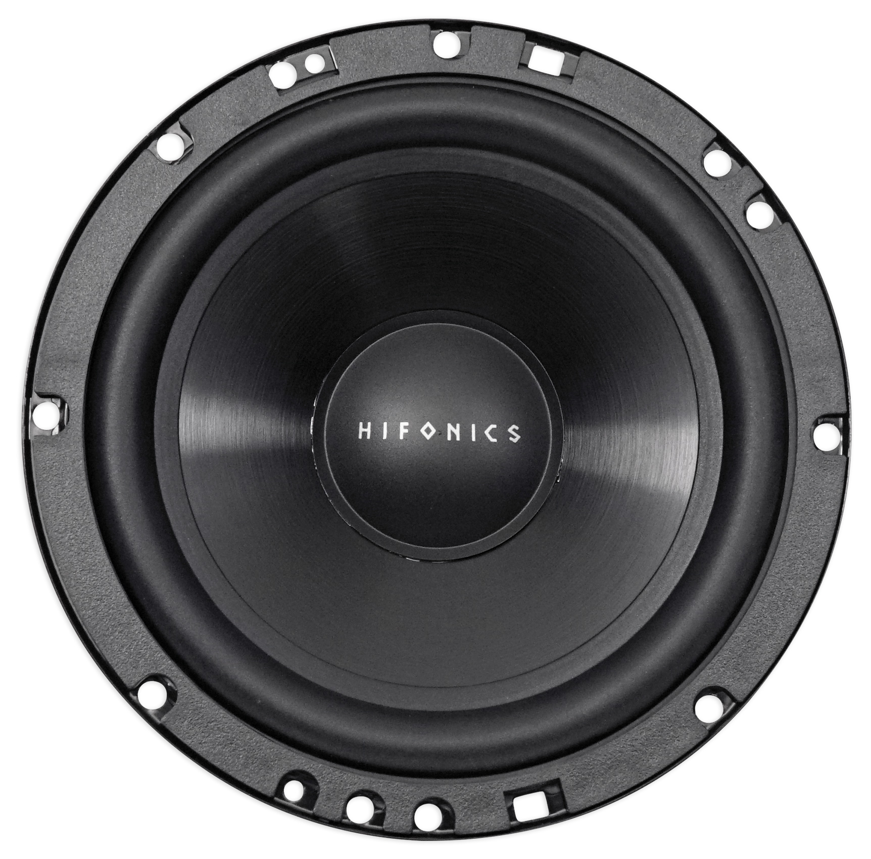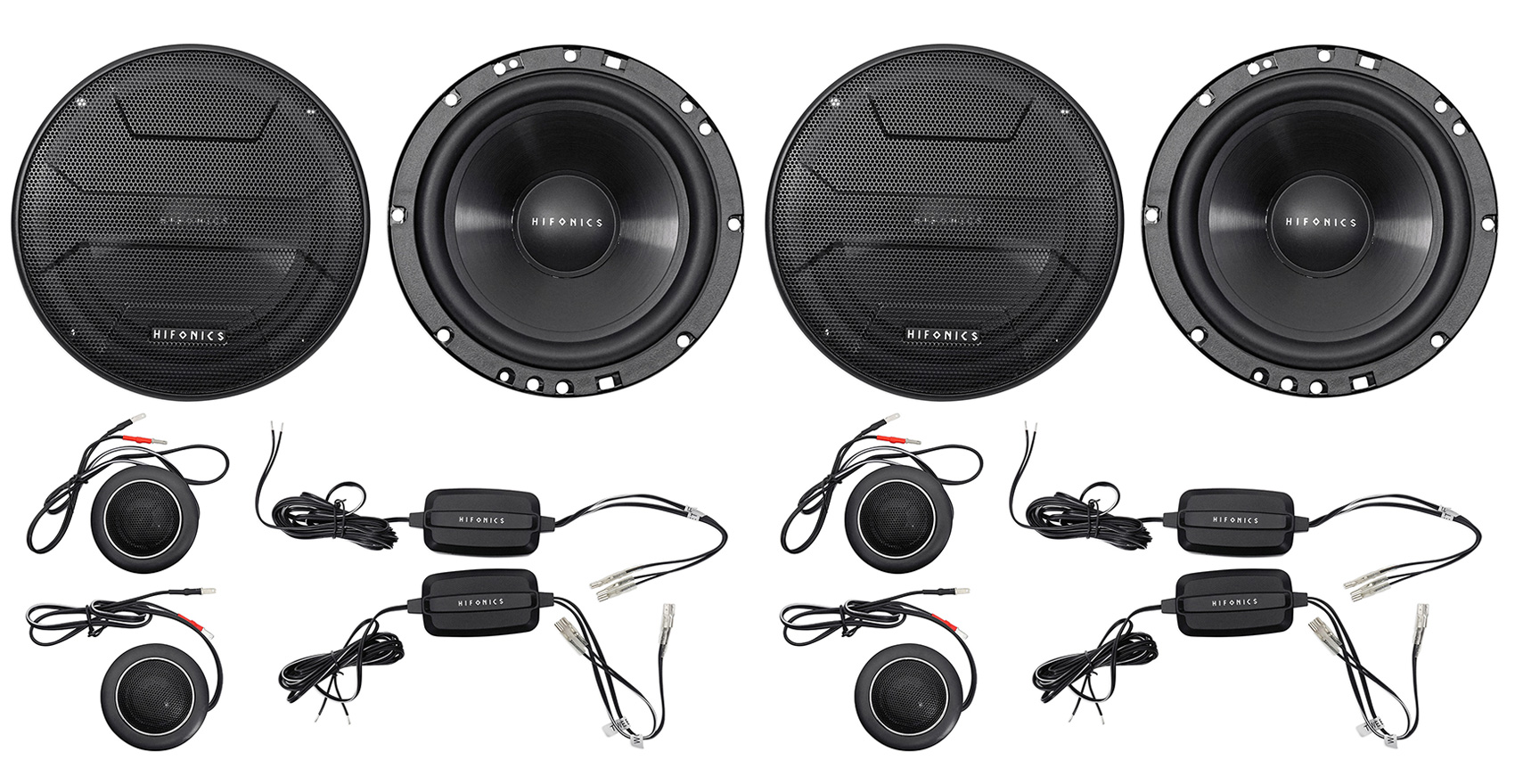 Hifonics Zeus 6.5 inch 2 way car audio component speaker system with neo-Mylar dome tweeter and Alpha-Cellulose Poly Woofer Cones nylon surrounds (pair) Includes 12dB in-line crossover and all tweeter mounting hardware and grills for the mid/woofers.