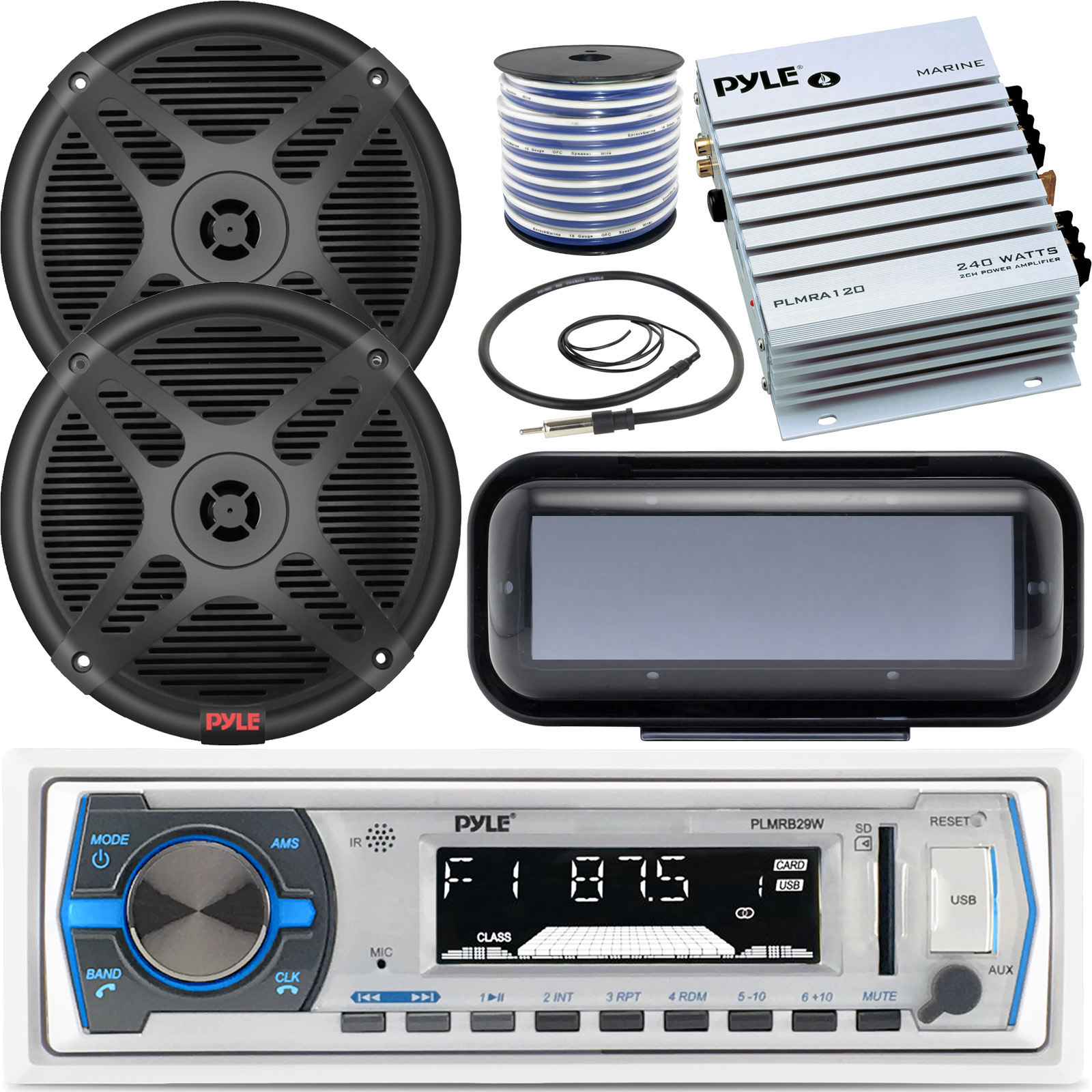 PACKAGE BUNDLE INCLUDES: Pyle PLMRB29W 300W Marine Boat AM/FM USB AUX Radio Receiver, 2 x Pyle PLMR652B Dual 6.5" Waterproof-Rated Marine 2-Way Coaxial Full-Range Speakers, Pyle PLMRA120 2-Channel 240W Waterproof Marine Amplifier, Enrock EMCBK1 Marine Universal In-Dash Water Resistant Waterproof Tinted Radio Shield Black Receiver Cover, Enrock EM18G50FT-OFC Marine Grade Spool of 50 Foot 18-Gauge Speaker Wire, Enrock EKMR1 Marine Universal Wired AM/FM 22" Radio Antenna.