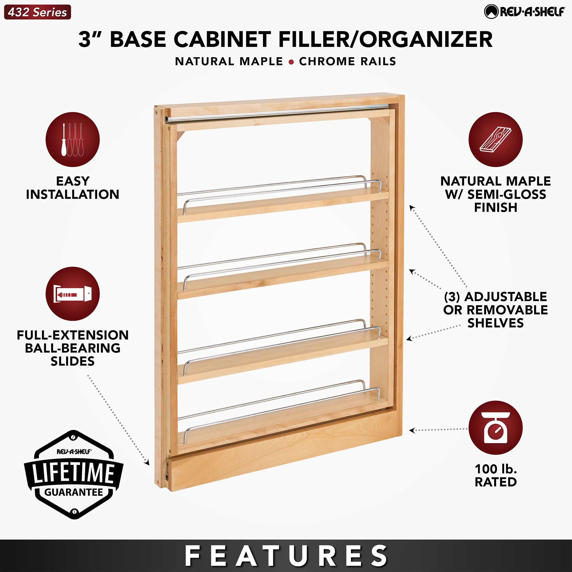 This filler features a 3-piece zinc-plated full-extension ball-bearing slide system, ensuring smooth and effortless operation. The adjustable and removable shelves offer versatility to accommodate your storage needs, while the absence of scribe rails allows you to determine the proper furniture offset of your cabinets. Once the organizer is installed, attach your matching panel or door for a cohesive and customized look. Whether you’re building a new kitchen or remodeling your existing space, this filler organizer is the perfect solution for optimizing your layout. Please note that fillers are not suitable for existing kitchen cabinets.