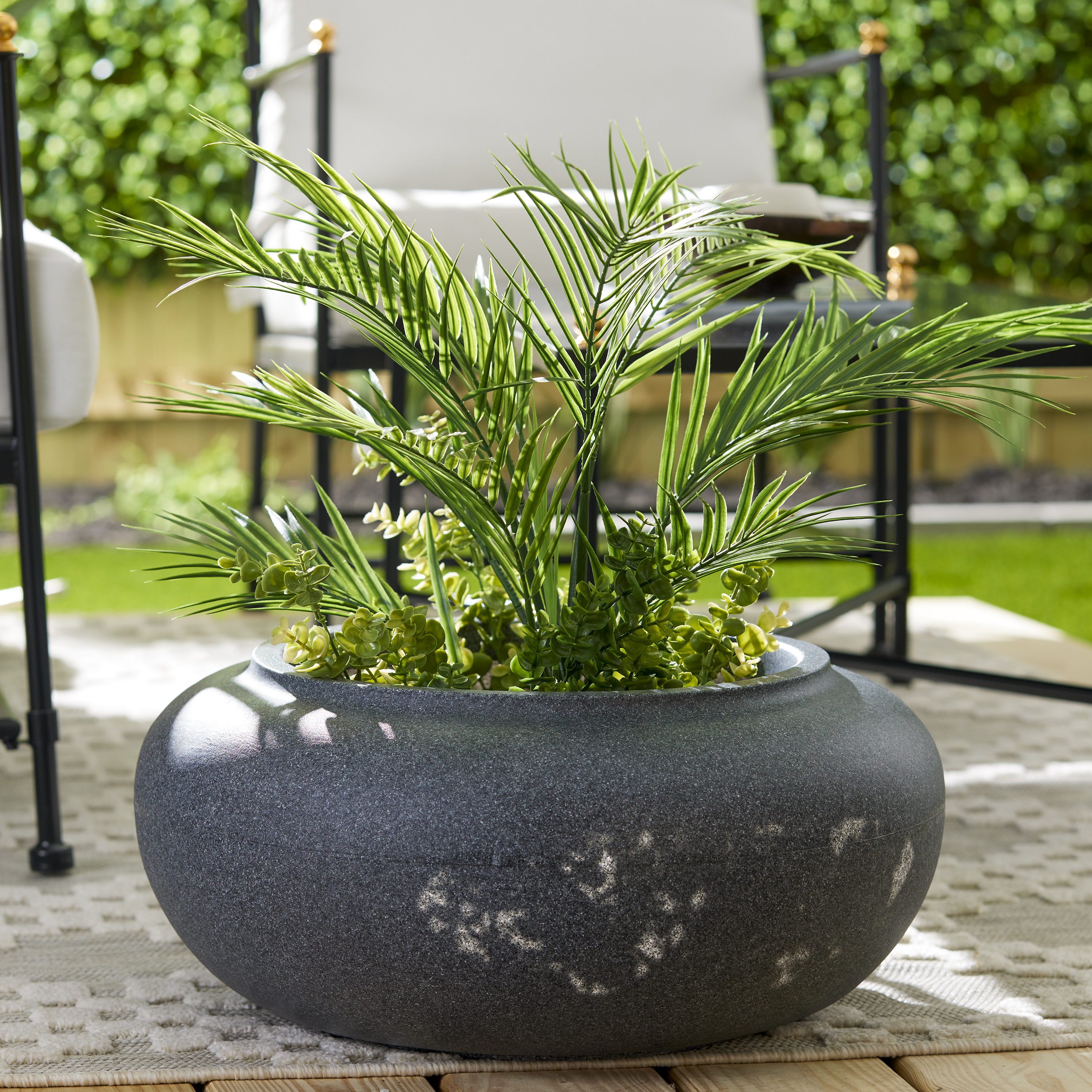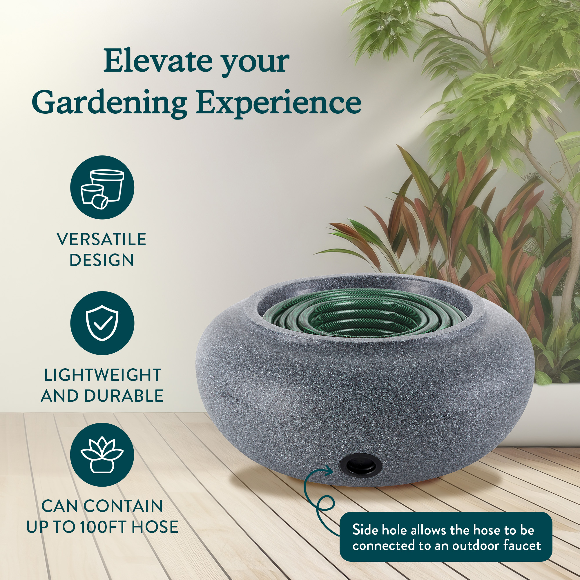Nothing could be easier than gently coiling your hose into this holder after use. No longer will you have to deal with annoying knots and tangles, just grab your hose and start watering. An integrated side hole allows you to connect your hose to an outdoor faucet. Designed to look like handmade pottery, its rustic appearance is bound to enhance any modern or bohemian-inspired outdoor living space. Measuring 21 by 9.38 inches, this pot is large enough to handle most standard-sized garden hoses. This outdoor storage container is also versatile enough to be used as a planter, firewood container, or for other uses.