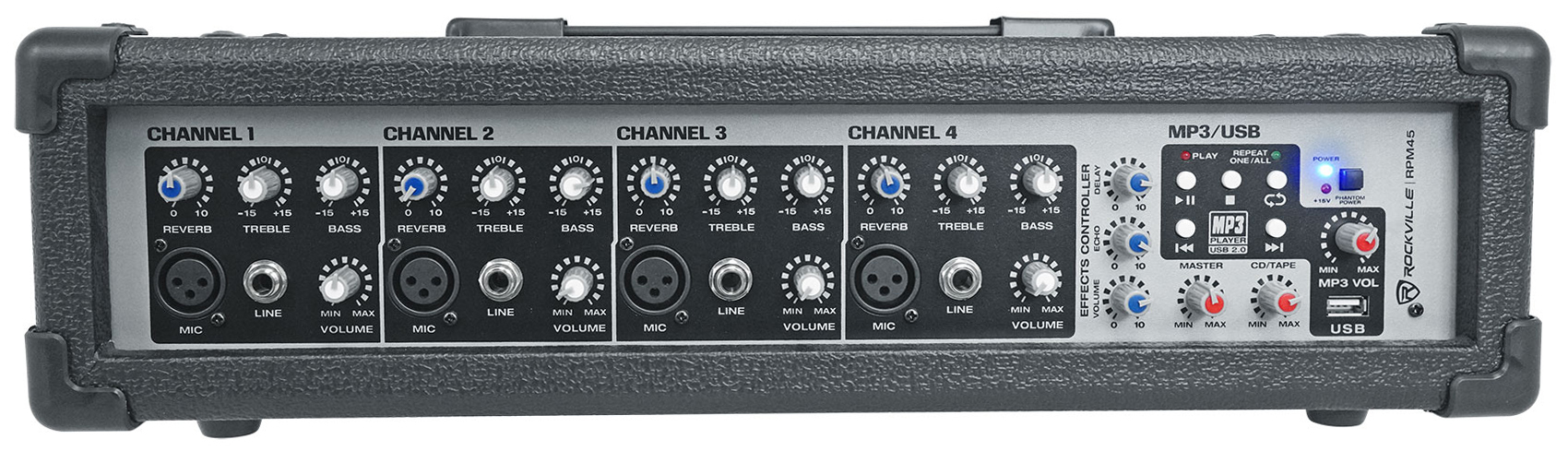 The Rockville RPM45 is a 4 channel wood cabinet powered mixer with USB. This mixer is one of the best sounding powered mixers on the market. This will compete with the most premium brands on the market in terms of sound quality and how much power this has. I personally tested our RPM series of powered mixers and I was completely blown away! I ran this to (2) Yamaha speakers and even with the volume turned up half way these were insanely loud! When I cranked the volume to 90 % the clarity was just un-believable.