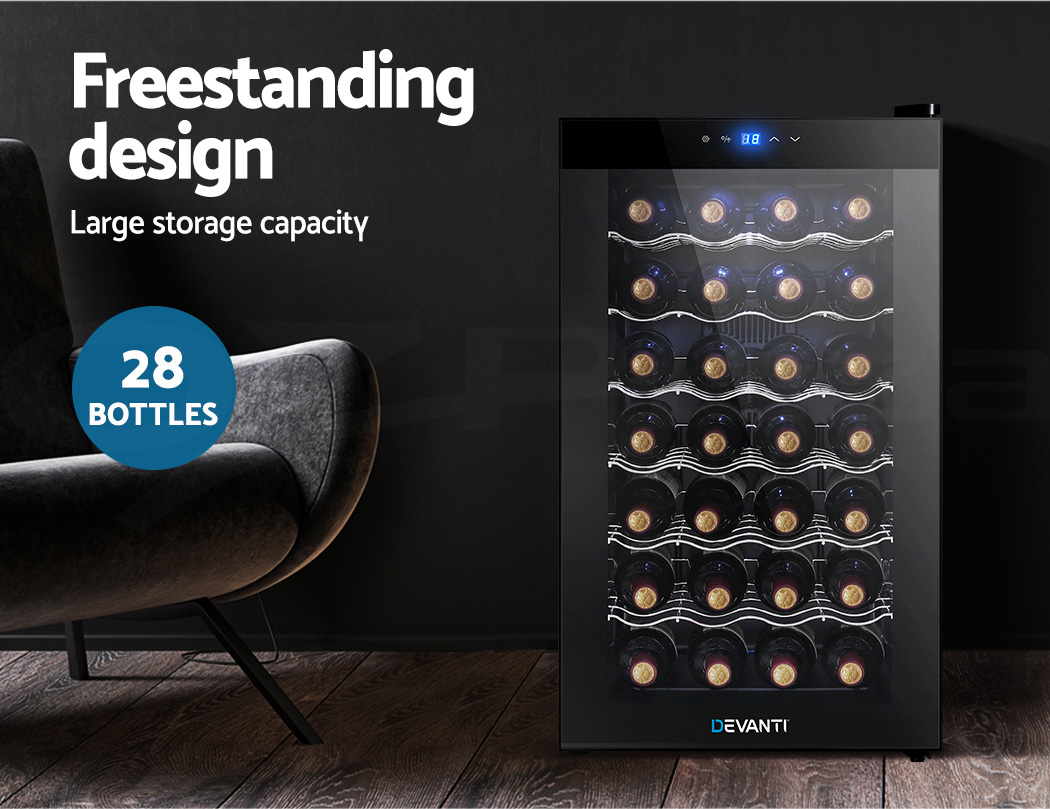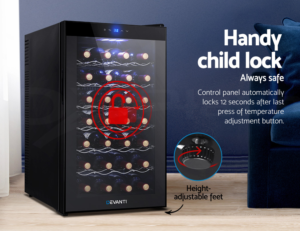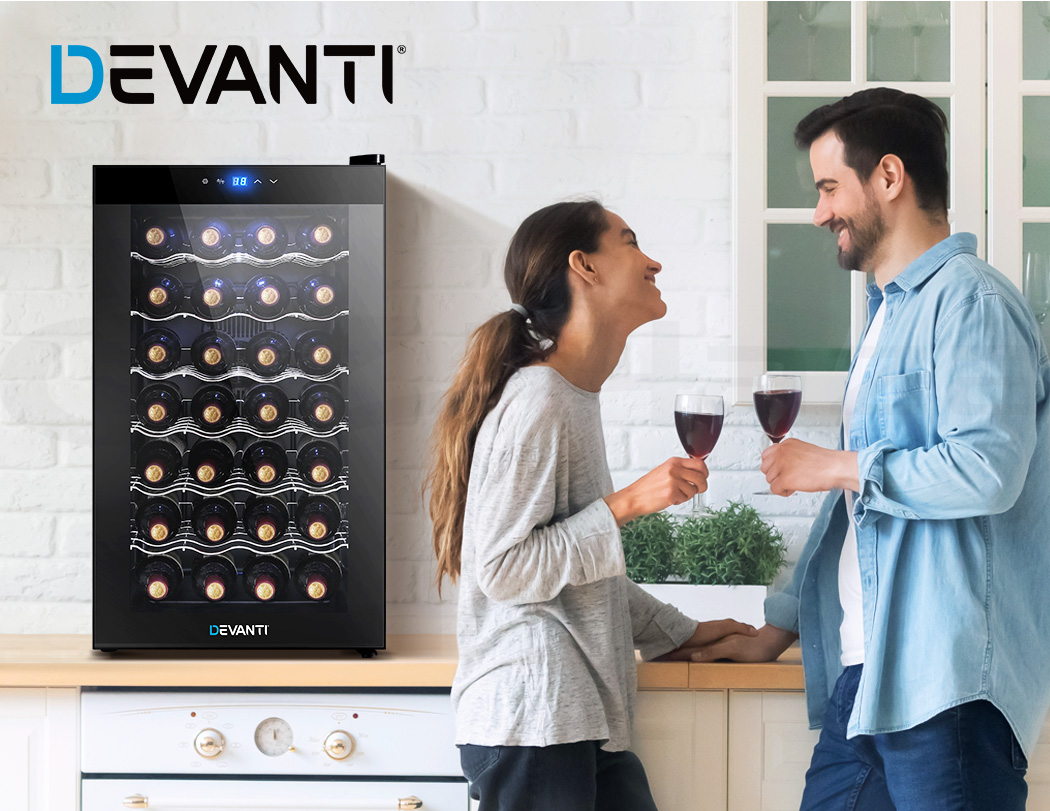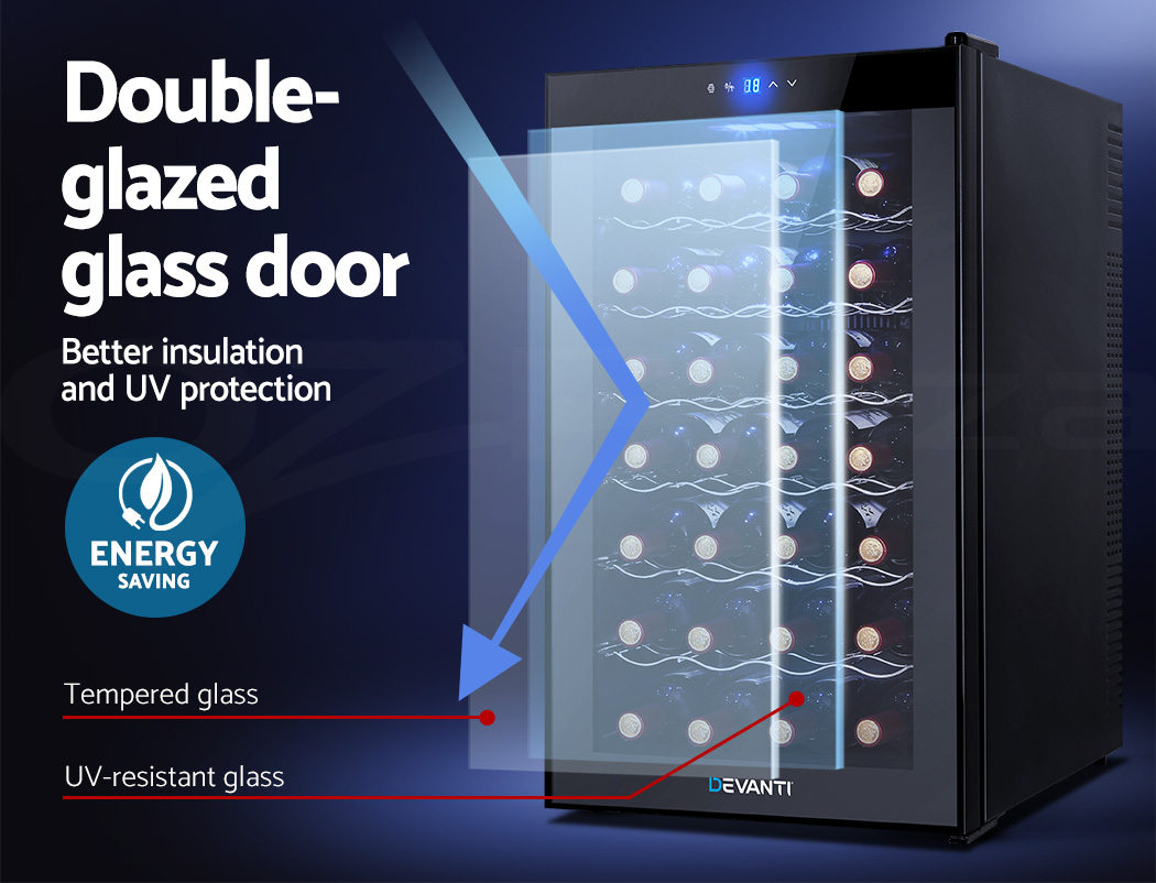 Need a good and reliable wine cooler? Look no further than our Devanti Wine Cooler. Utilising the latest high precision thermoelectric cooling technology, our wine cooler ensures your favourite vintages are kept at their prescribed temperatures with its circulated cool air. The touch control panel makes for easy temperature adjustments and the built-in interior LEDs help you to see your wines in the best light. The stylish and compact design stores up to 28 bottles of wine in a neat and tidy shelving system. Better still, the double-glazed glass door is UV-resistant and provides excellent insulation along with the 30mm thick foam wall. The ensemble works quietly and efficiently and has a handy child-lock on its control panel for total peace of mind. Don’t trust just any product with your precious vintages, trust Devanti.