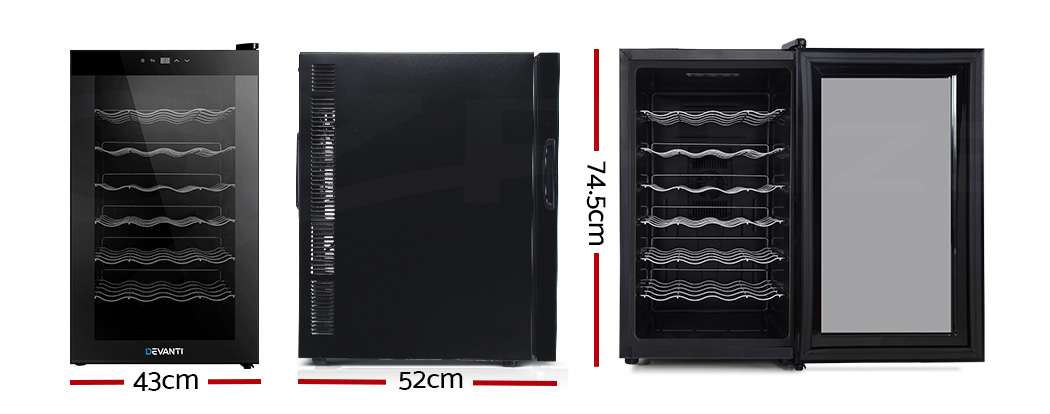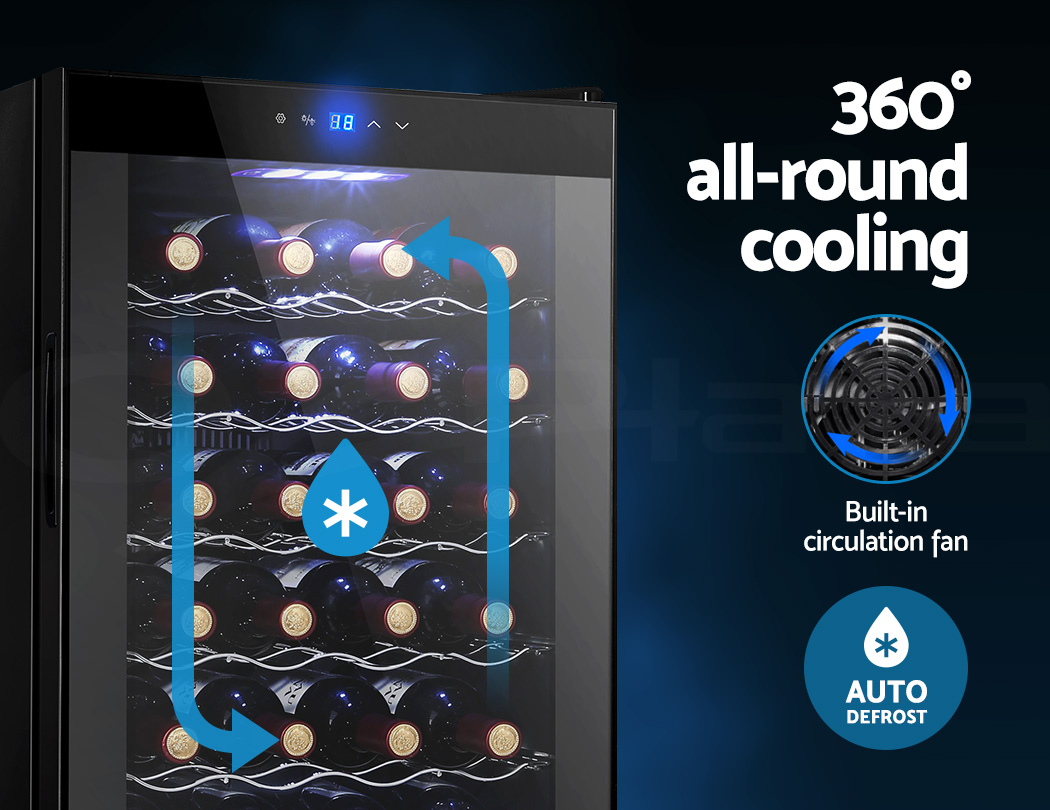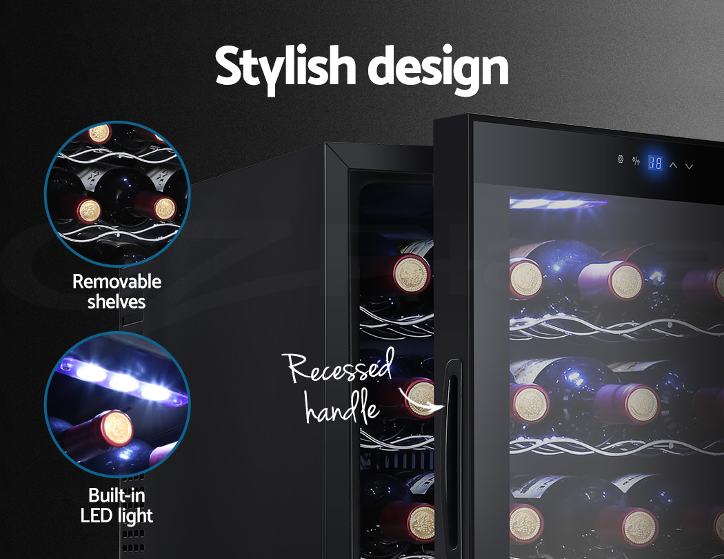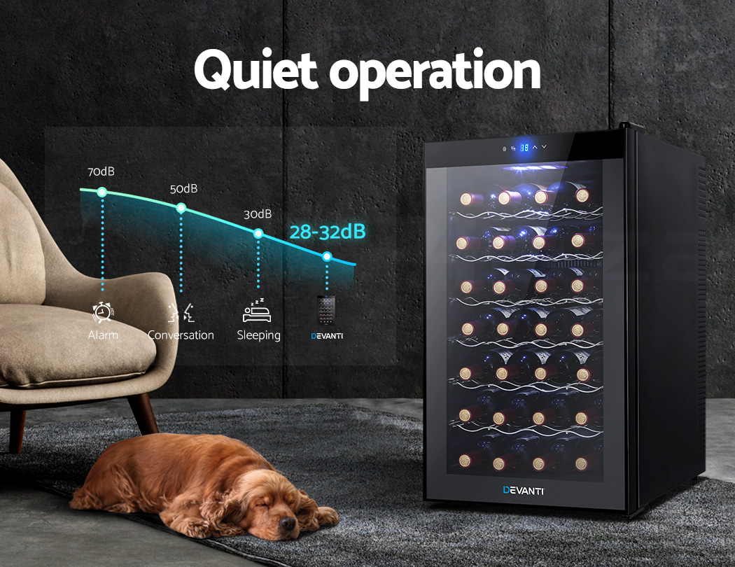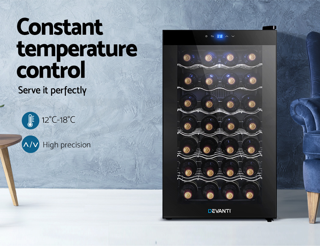 Need a good and reliable wine cooler? Look no further than our Devanti Wine Cooler. Utilising the latest high precision thermoelectric cooling technology, our wine cooler ensures your favourite vintages are kept at their prescribed temperatures with its circulated cool air. The touch control panel makes for easy temperature adjustments and the built-in interior LEDs help you to see your wines in the best light. The stylish and compact design stores up to 28 bottles of wine in a neat and tidy shelving system. Better still, the double-glazed glass door is UV-resistant and provides excellent insulation along with the 30mm thick foam wall. The ensemble works quietly and efficiently and has a handy child-lock on its control panel for total peace of mind. Don’t trust just any product with your precious vintages, trust Devanti.
