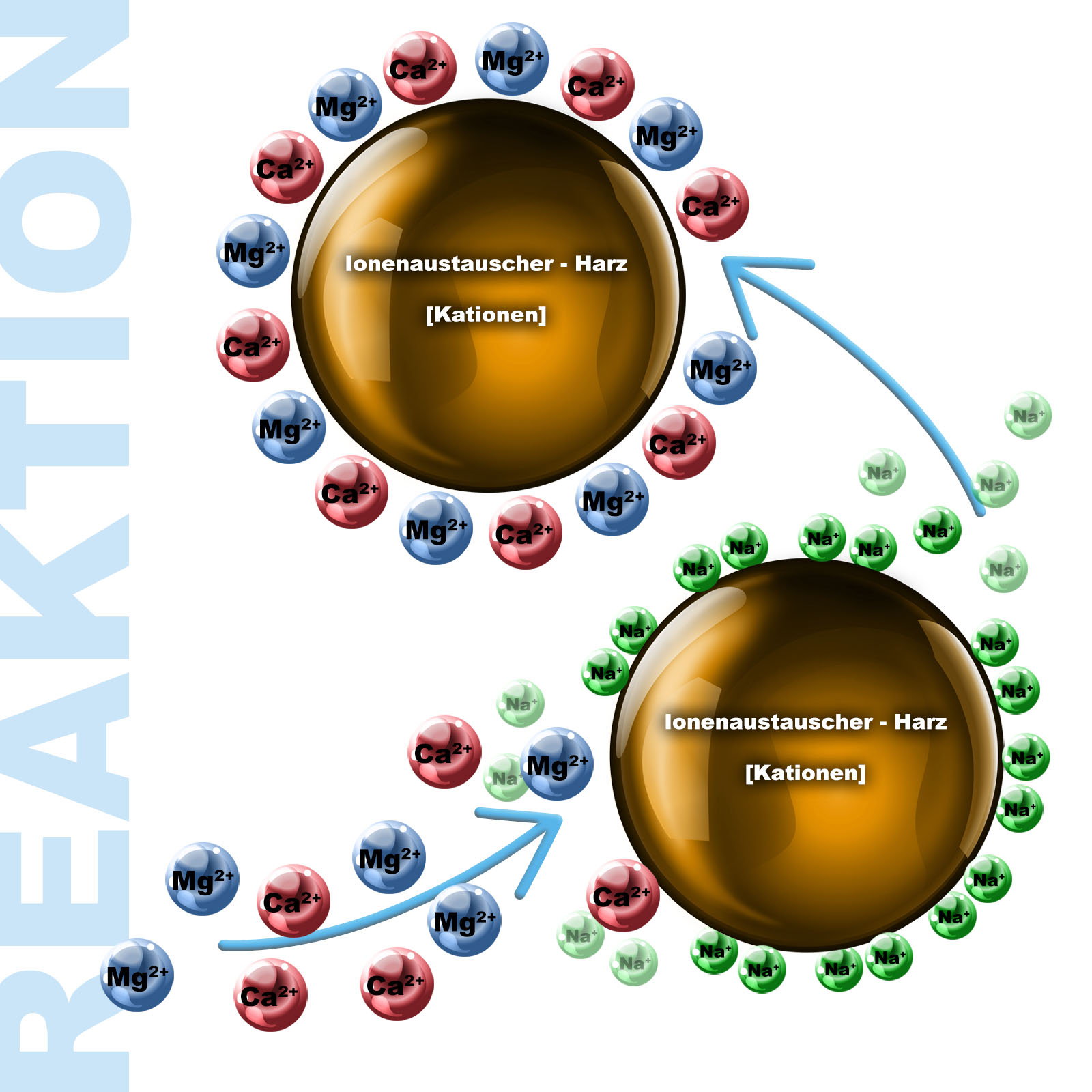 Enthärtet wird das Wasser mittels Ionenaustauschs, welcher durch ein spezielles Harz im Inneren der Wasserenthärtungsanlage mithilfe eines Masseaustausches bewerkstelligt wird. Dieses Harz ist so aufgebaut, dass es Calcium- und Magnesium-Ionen, also die Kationen, aus dem Trinkwasser bindet und das durchfließende Wasser gleichzeitig Natrium-Ionen versetzt. Somit sinkt der Härtegrad des Wassers, was den ursprünglichen pH-Wert jedoch nicht beeinflusst.