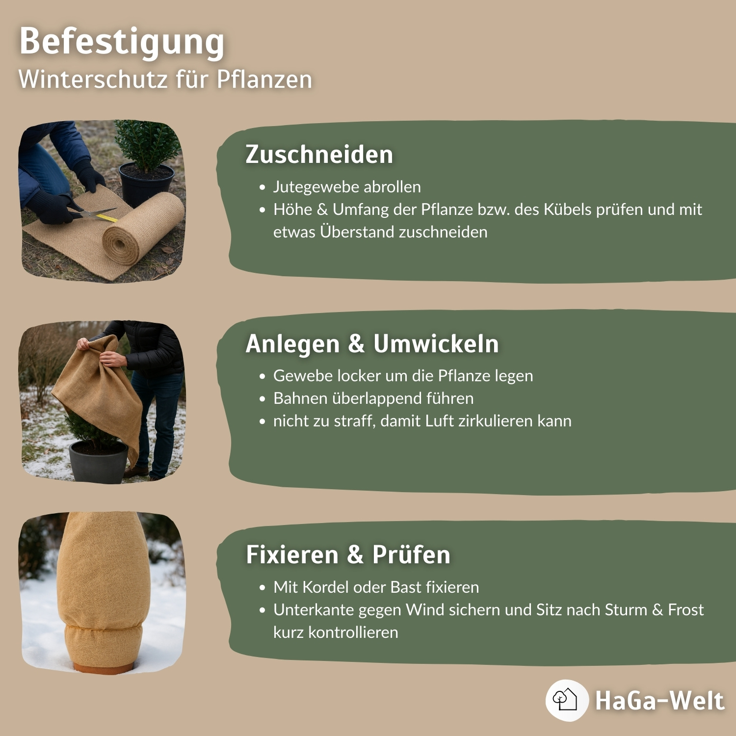 Einer der größten Vorteile des Jutegewebes ist die leichte Handhabung. Es lässt sich schnell und unkompliziert mit Jutekordeln oder Jutebändern befestigen. Wickeln Sie das Gewebe einfach um Ihre Pflanzen und sichern Sie es – fertig! Ob um Bäume, Sträucher oder Pflanzkübel: Das Jutegewebe passt sich flexibel an und bietet zuverlässigen Schutz.