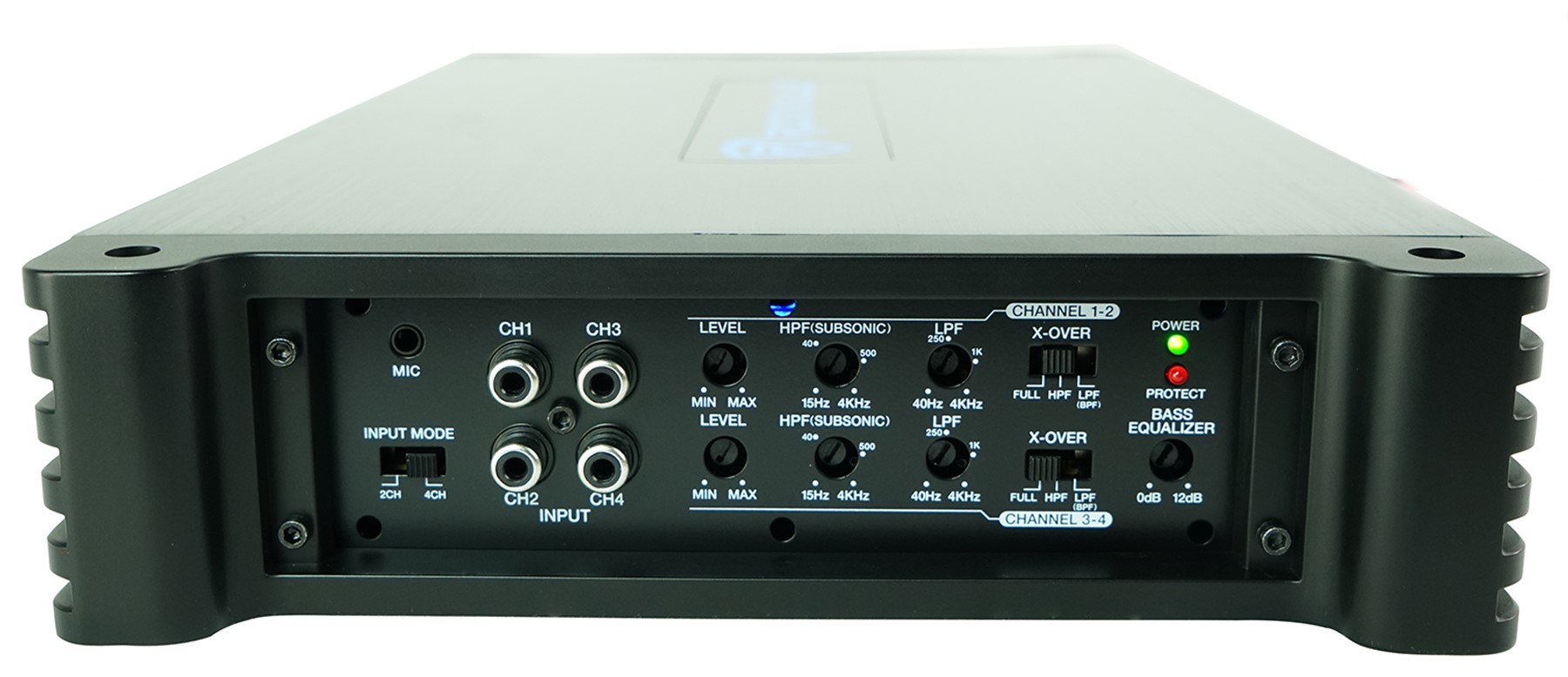 This amp has a very cool fully adjustable 12dB/Octave crossover. What is cool about it is that our crossover supports low pass, high pass, bandpass, and subsonic. This makes our amp ideal for subwoofers (sealed and vented), full range speakers, and midrange speakers. In high pass mode we allow you to filter out frequencies between 15Hz - 4K Hz. In full mode you will not be filtering any frequencies. The really cool part is in low pass mode you can use the high pass and low pass mode. So for example you can set the low pass mode to 50 hz, and then you can set the high pass to 15 Hz. In this case you would be playing frequencies in the range of 15-50 Hz on this channel. This would be an example of using the subsonic filter. Another option you have is for midrange speakers, you can use our low pass filter and set it really high. Lets say to 150 hz. And then you can set the high pass to 3K hz and your midrange speakers will only play that frequency range. Our advanced crossover technology will allow you to really fine tune each speaker to get the sound you desire.