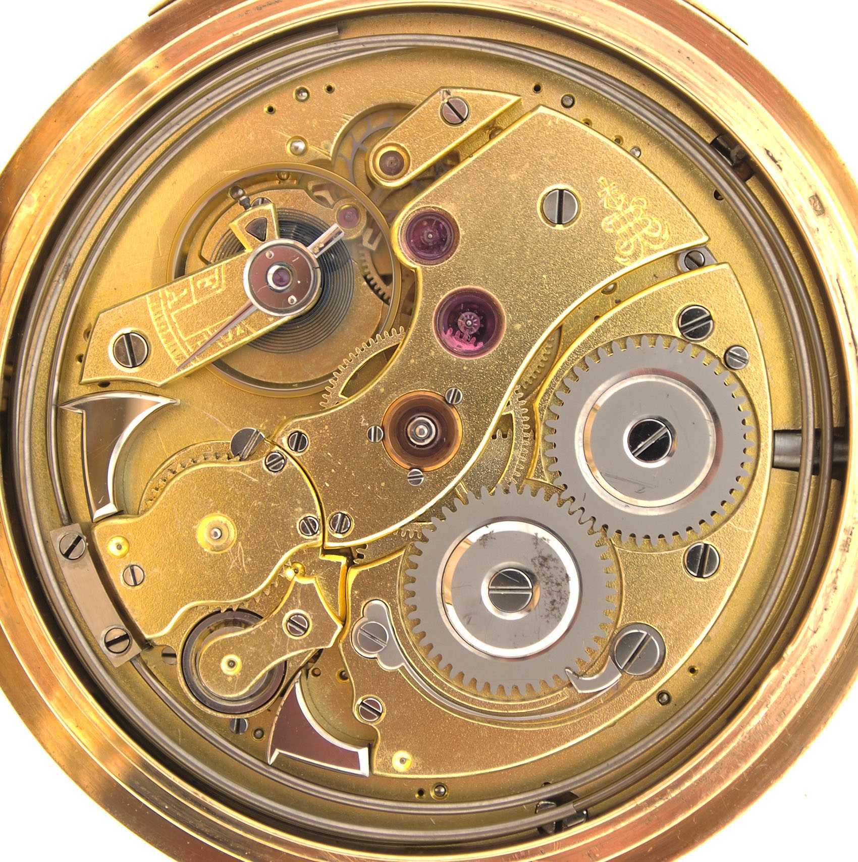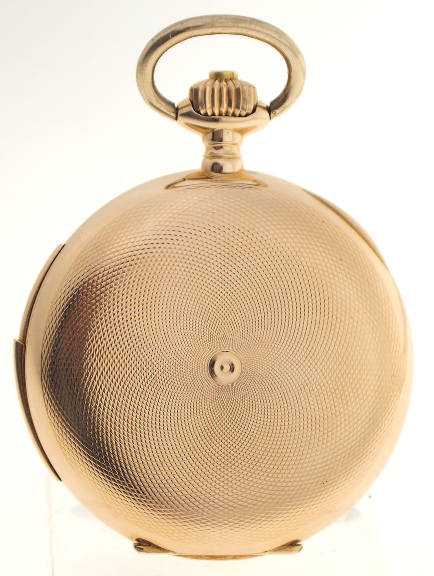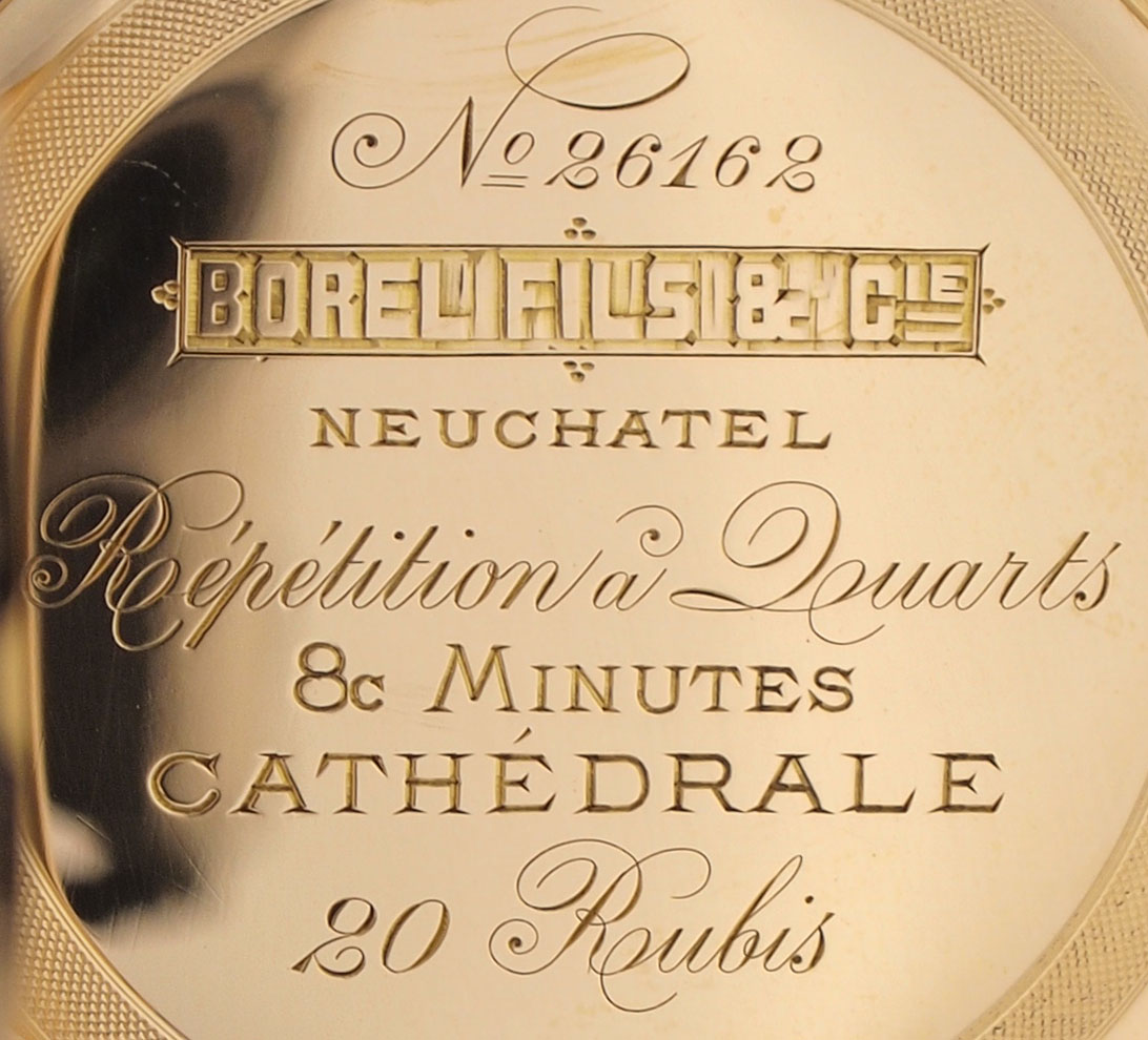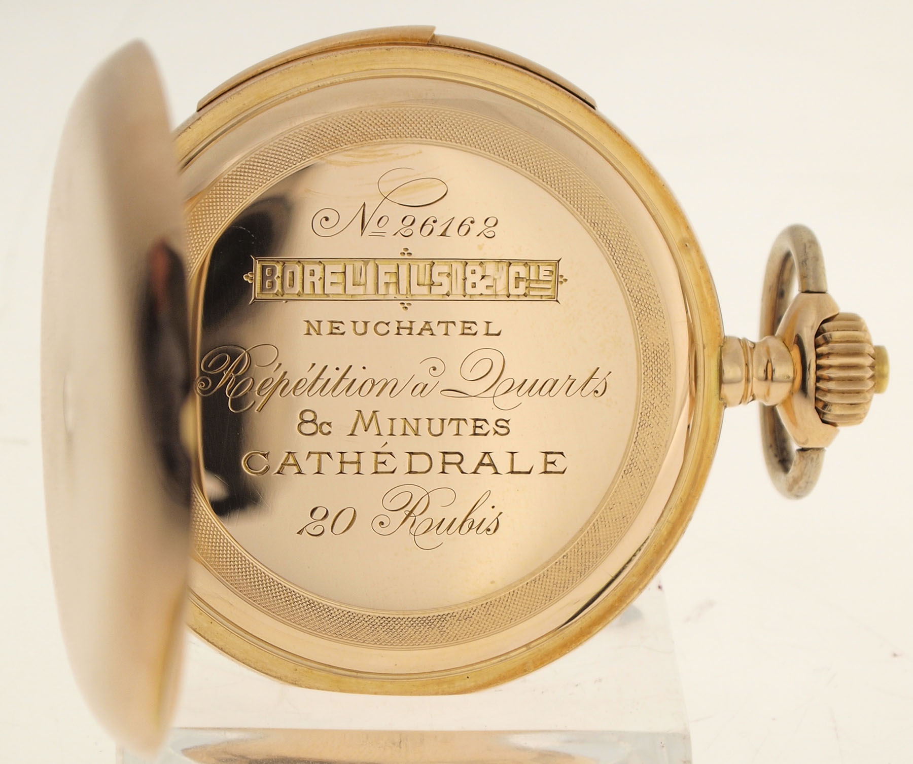 Guillochiertes Gehäuse in massiv 14ct Gold. Zwischendeckel signiert mit: No 26162 Borel Fils & Cie Neuchatel Repetition a Quarts & Minutes CATHEDRALE 20 Rubis.