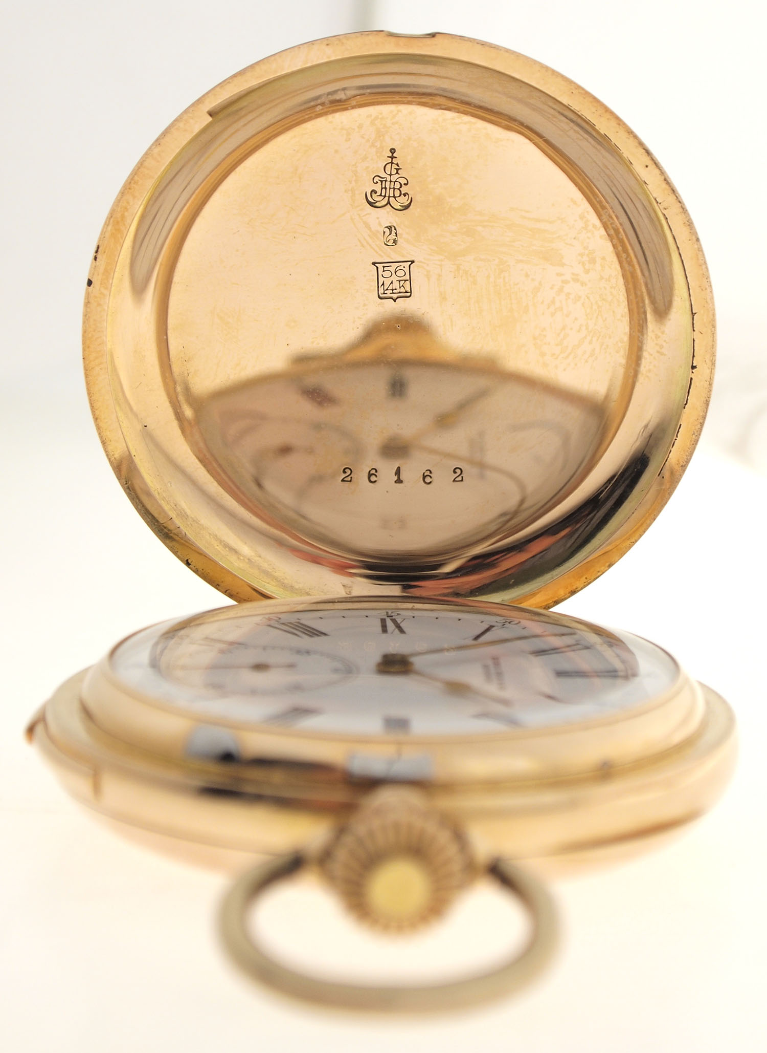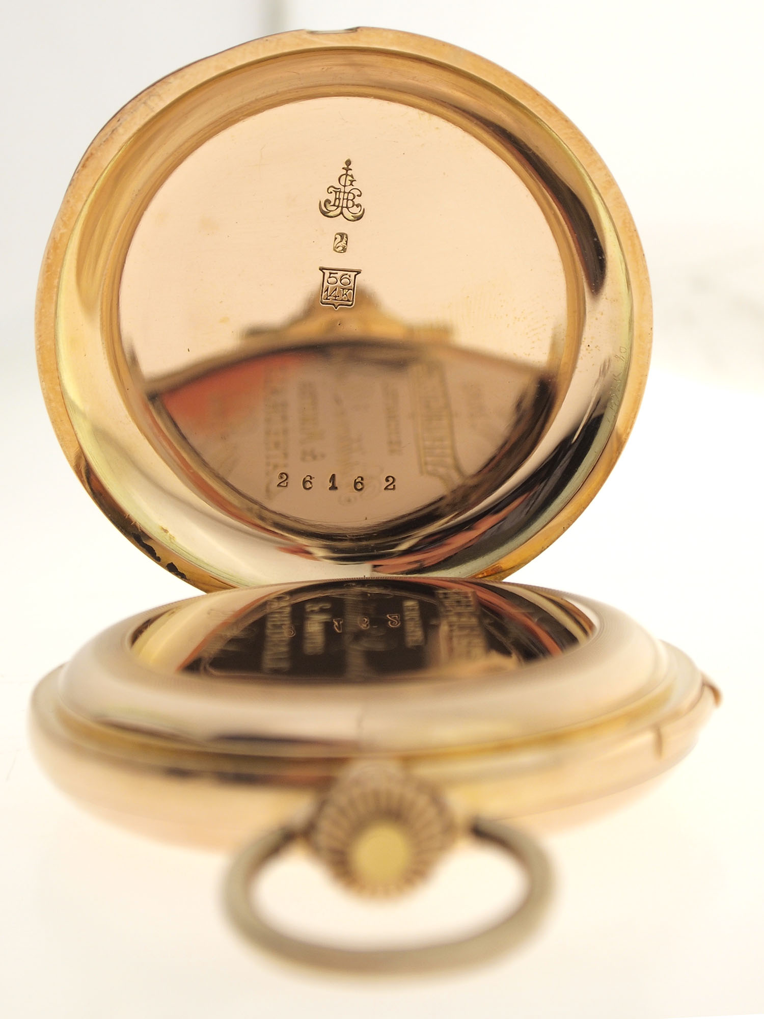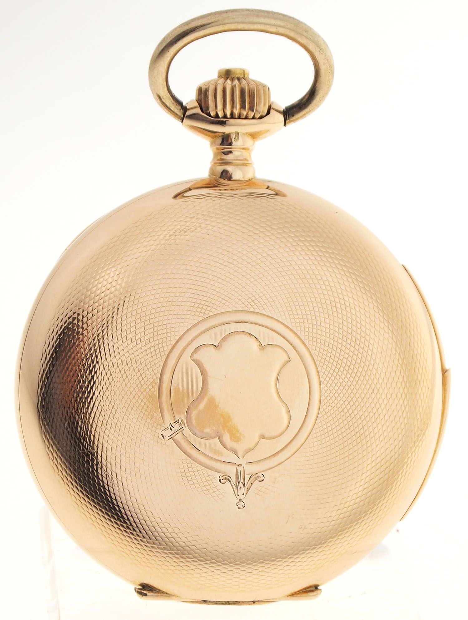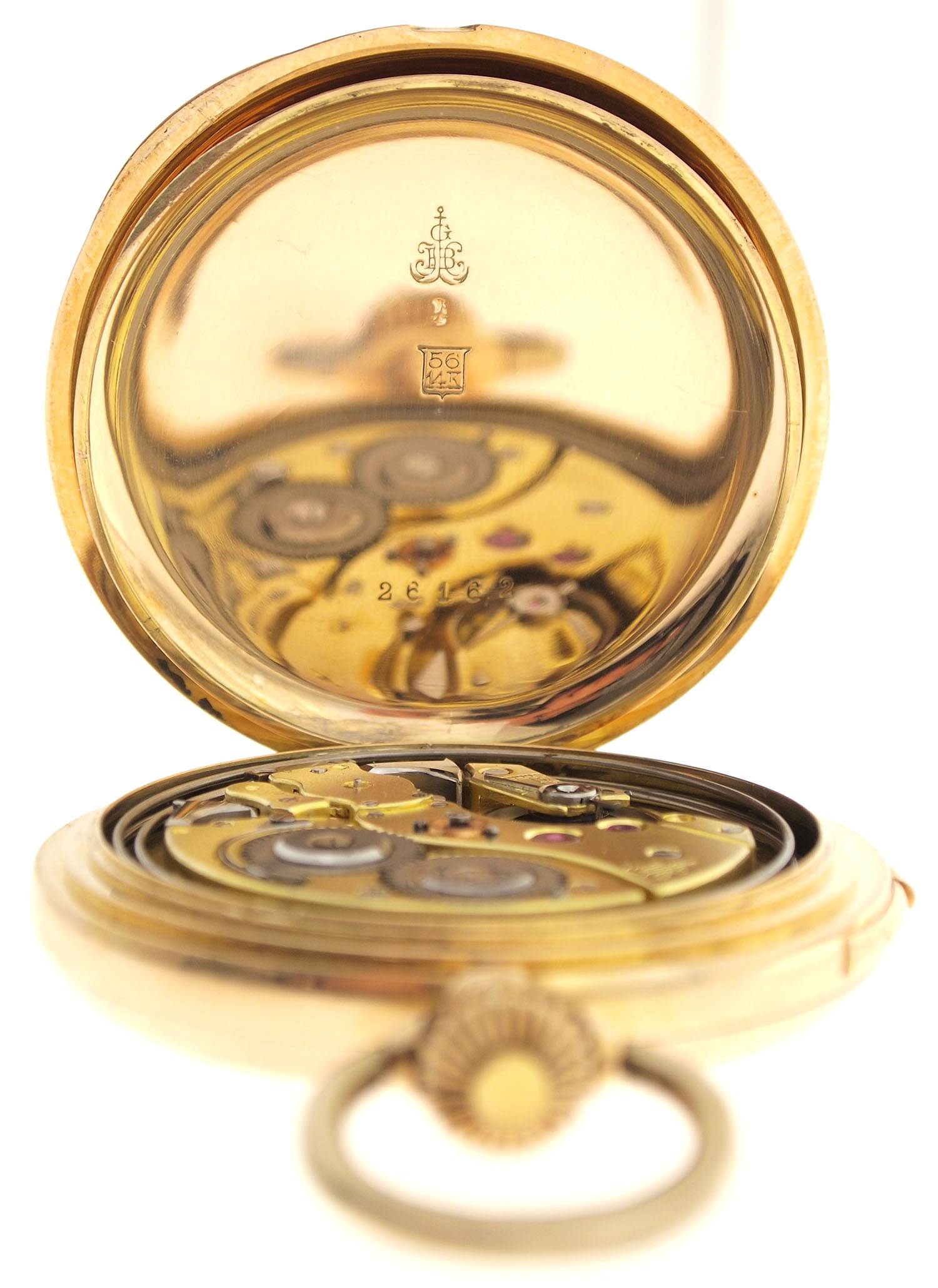 Guillochiertes Gehäuse in massiv 14ct Gold. Zwischendeckel signiert mit: No 26162 Borel Fils & Cie Neuchatel Repetition a Quarts & Minutes CATHEDRALE 20 Rubis.