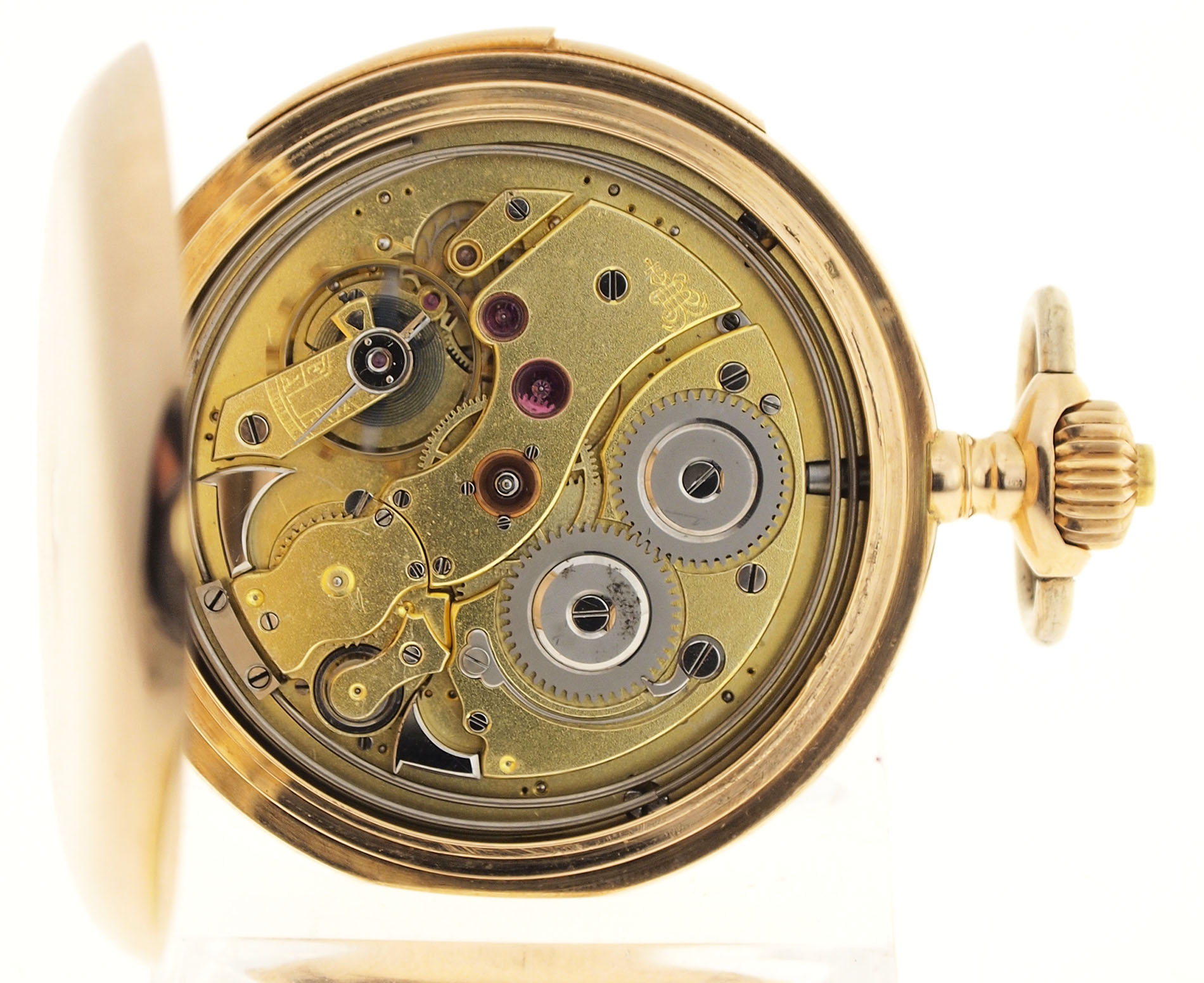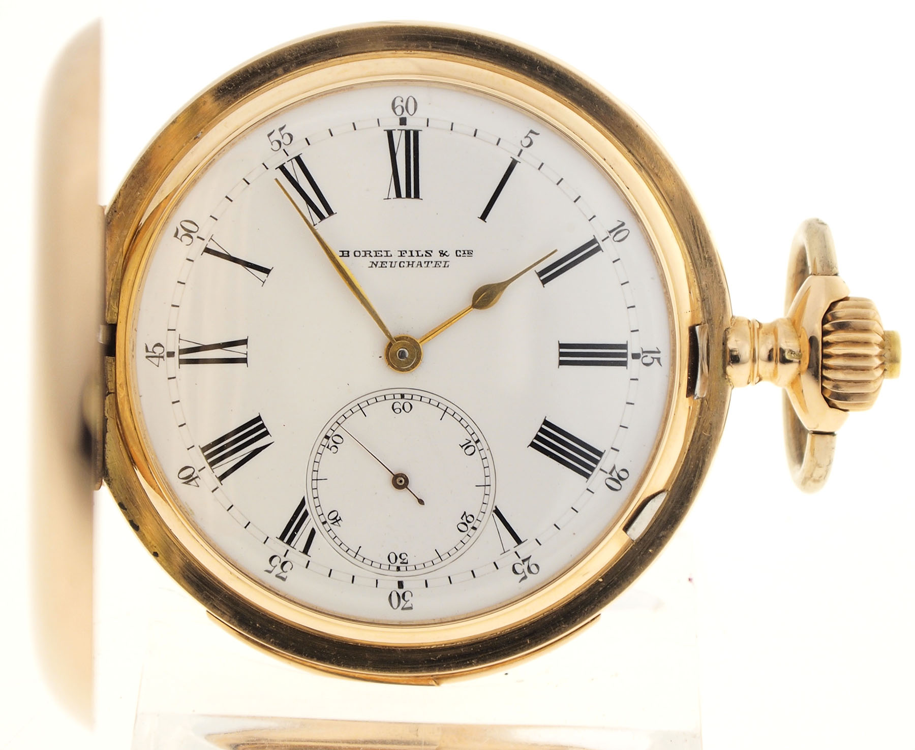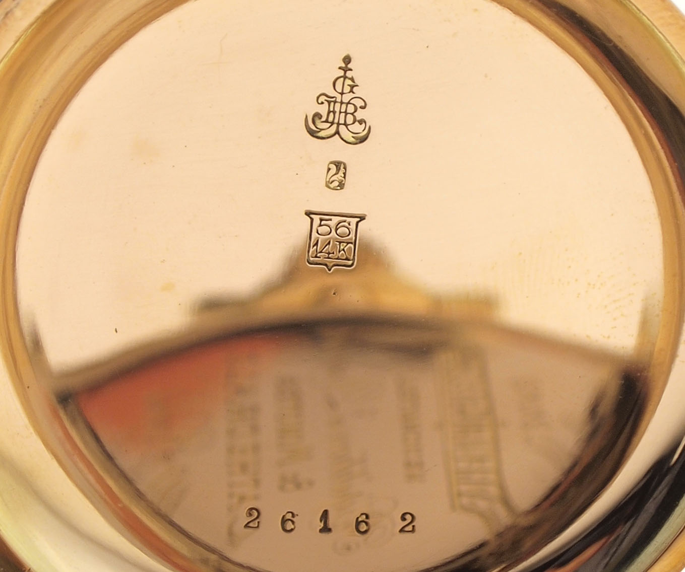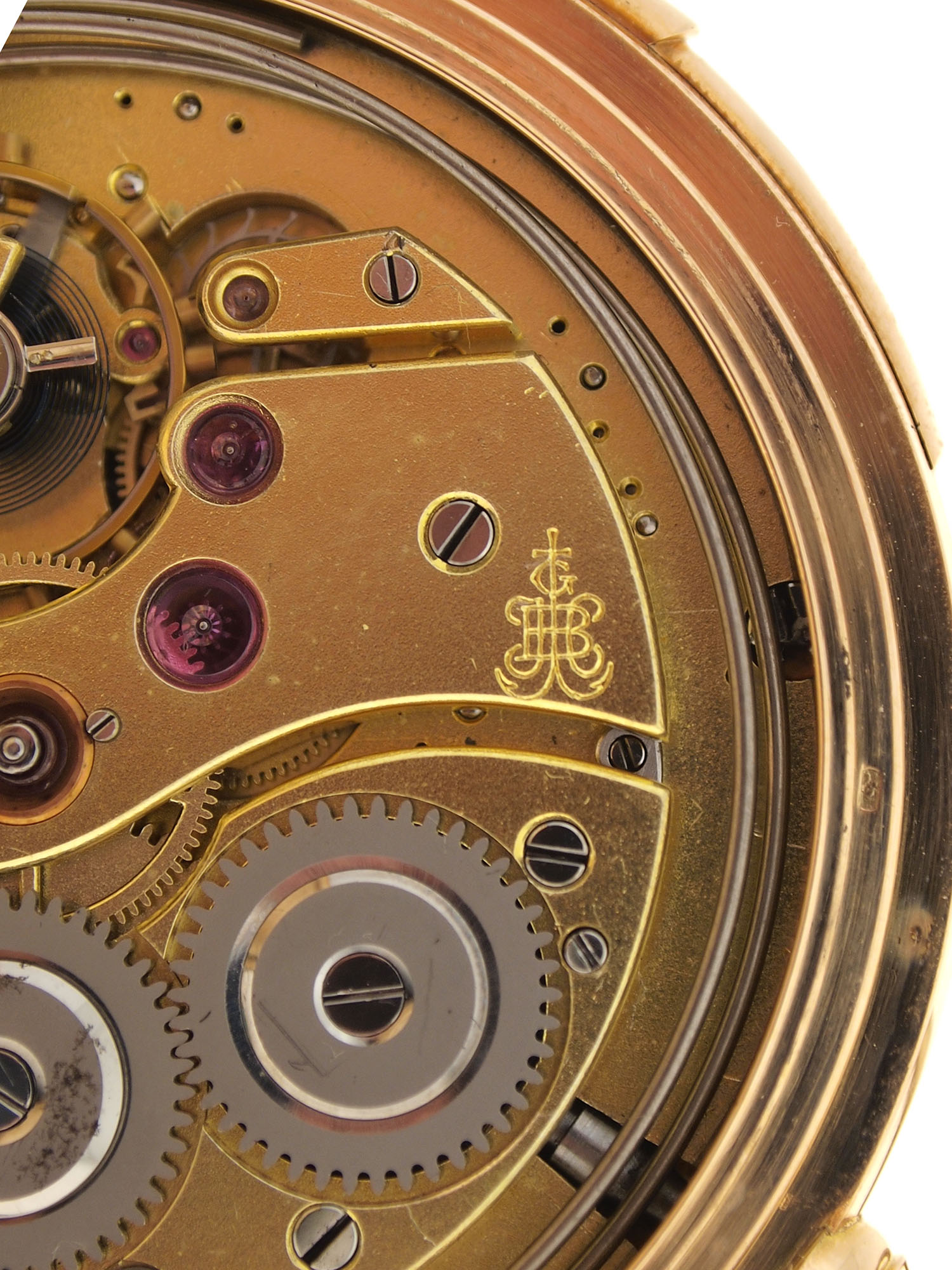 Guillochiertes Gehäuse in massiv 14ct Gold. Zwischendeckel signiert mit: No 26162 Borel Fils & Cie Neuchatel Repetition a Quarts & Minutes CATHEDRALE 20 Rubis.