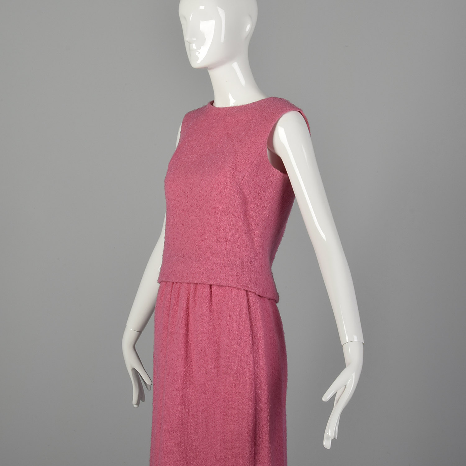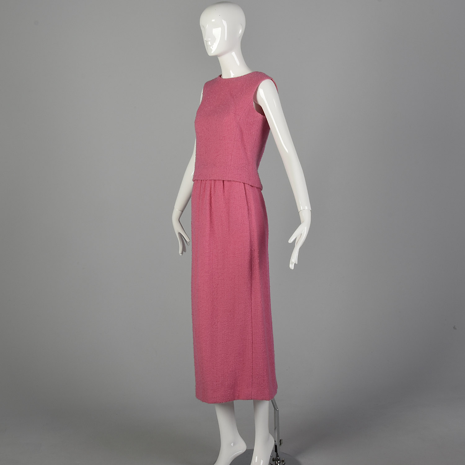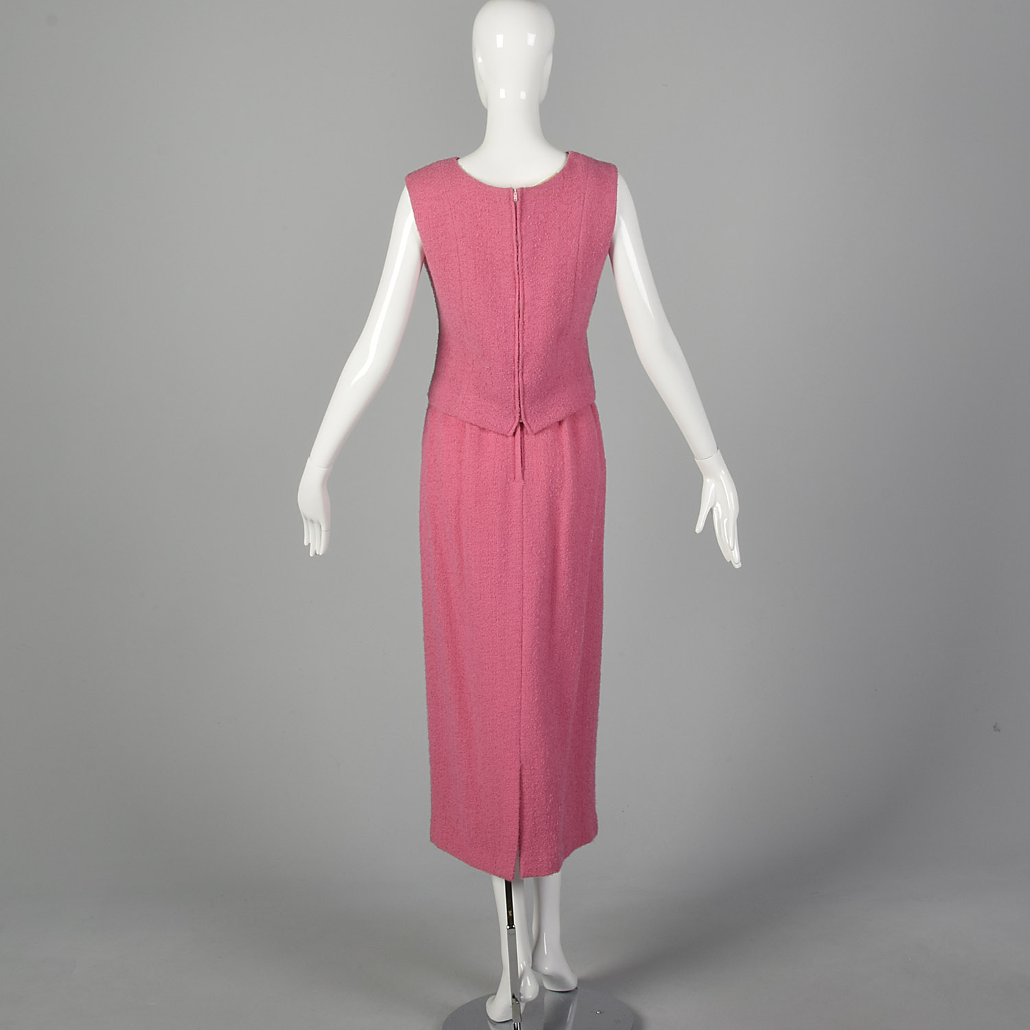 This listing is for one skirt set, including one skirt and one top. The textile is a wool blend. Definition of bubblegum pink color skirt set. The textile is a light-medium weight wool blend tweed. The sleeveless blouse is cut in a boxy shape. The matching long maxi skirt has a small slit in the back. An adorable set in good condition to be worn!