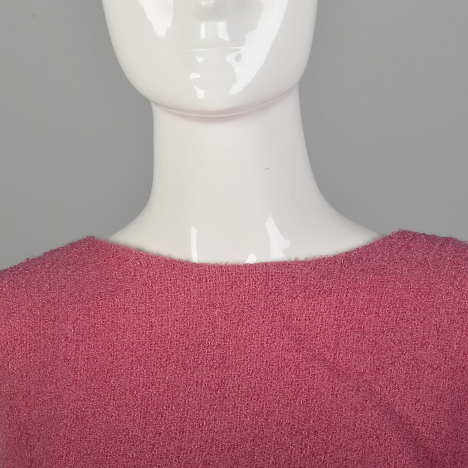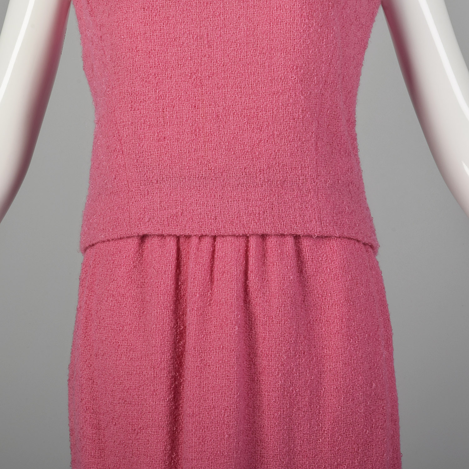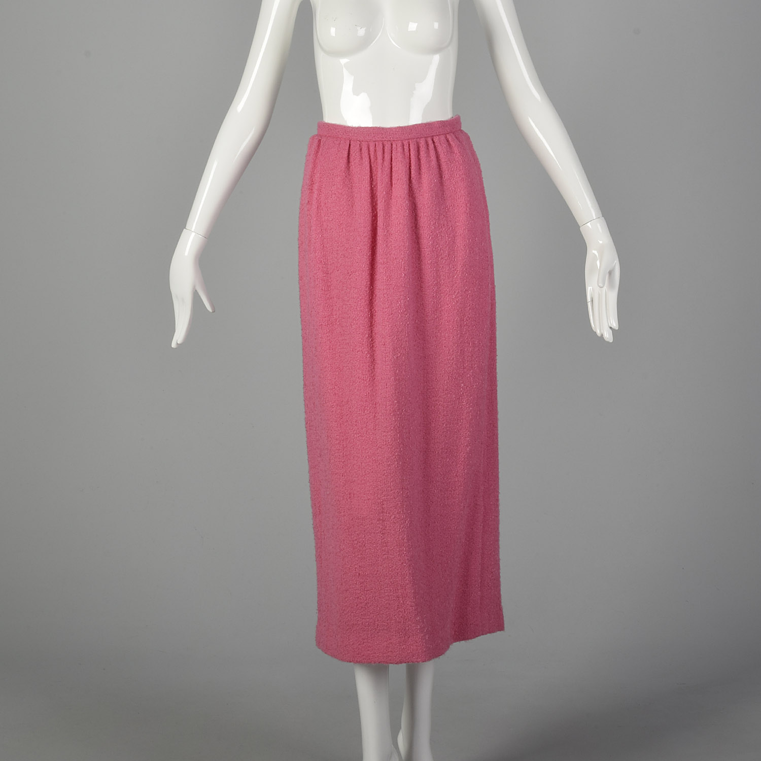 This listing is for one skirt set, including one skirt and one top. The textile is a wool blend. Definition of bubblegum pink color skirt set. The textile is a light-medium weight wool blend tweed. The sleeveless blouse is cut in a boxy shape. The matching long maxi skirt has a small slit in the back. An adorable set in good condition to be worn!